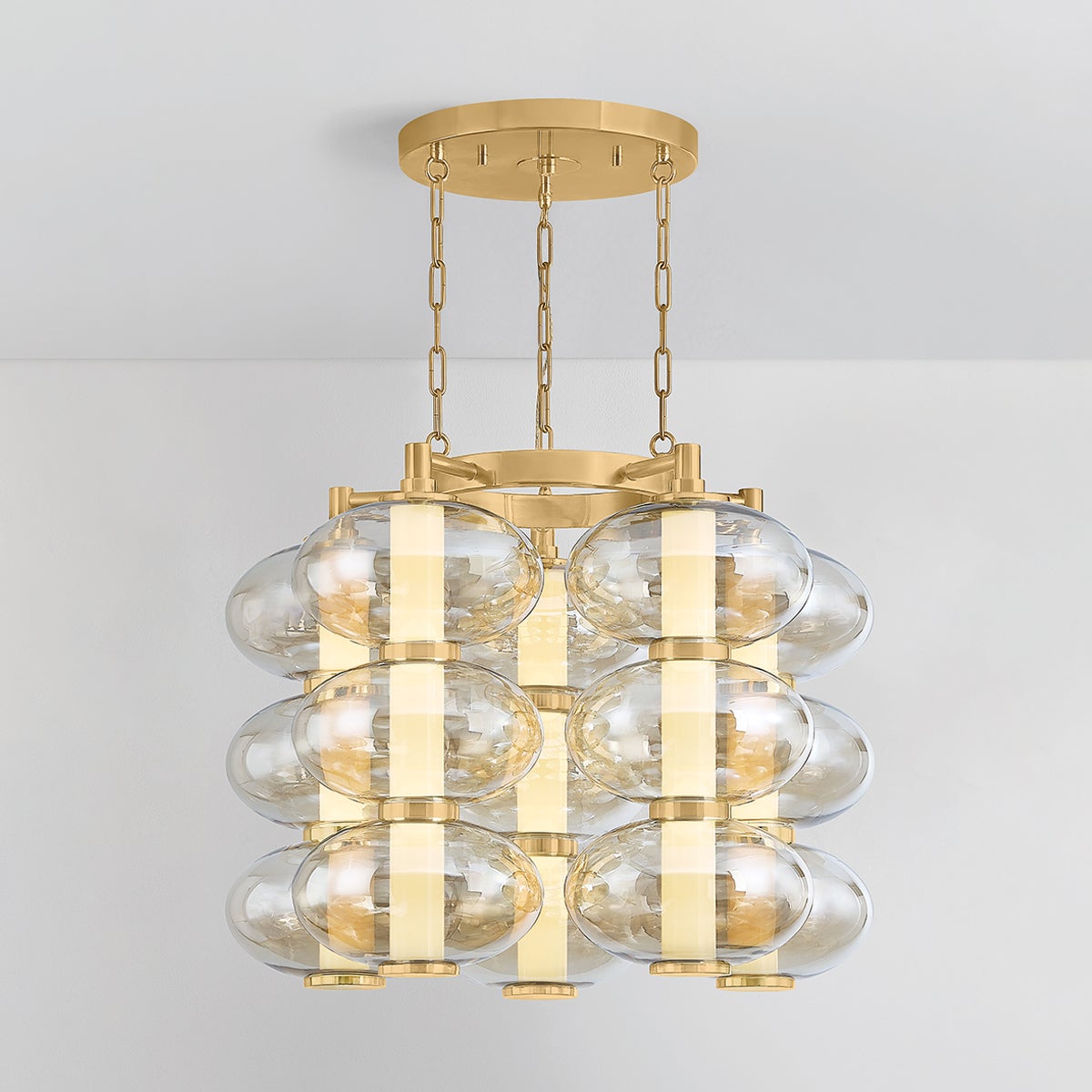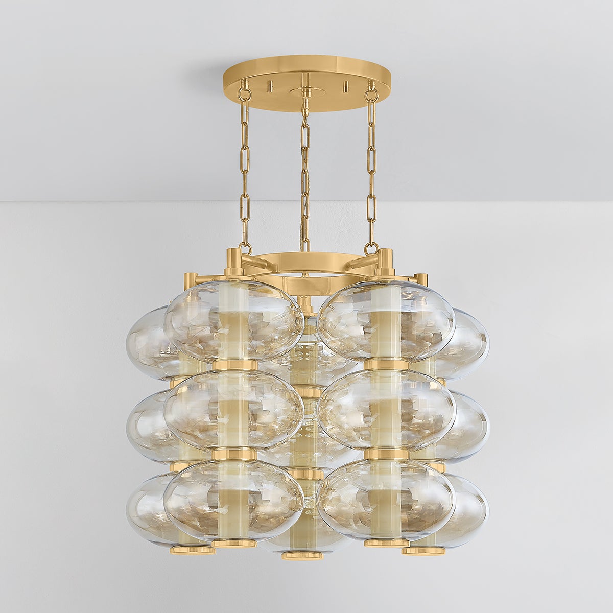 Drawing influence from the modernist era, Toulouse features sleek LED tubes surrounded by stacked oval-shaped glass orbs. The moody light bronze glass shades create bubble-like stacks, separated by Vintage Brass cuffs. Available as a sconce and a chandelier in two sizes, Toulouse is perfect for those who appreciate maximalist style with a contemporary twist.