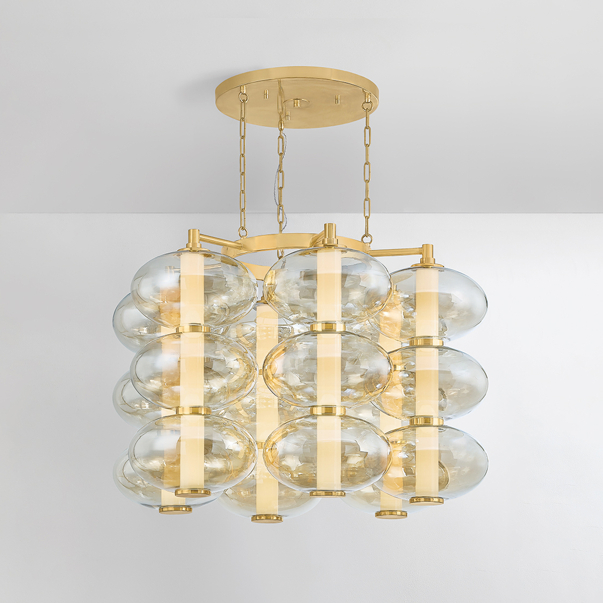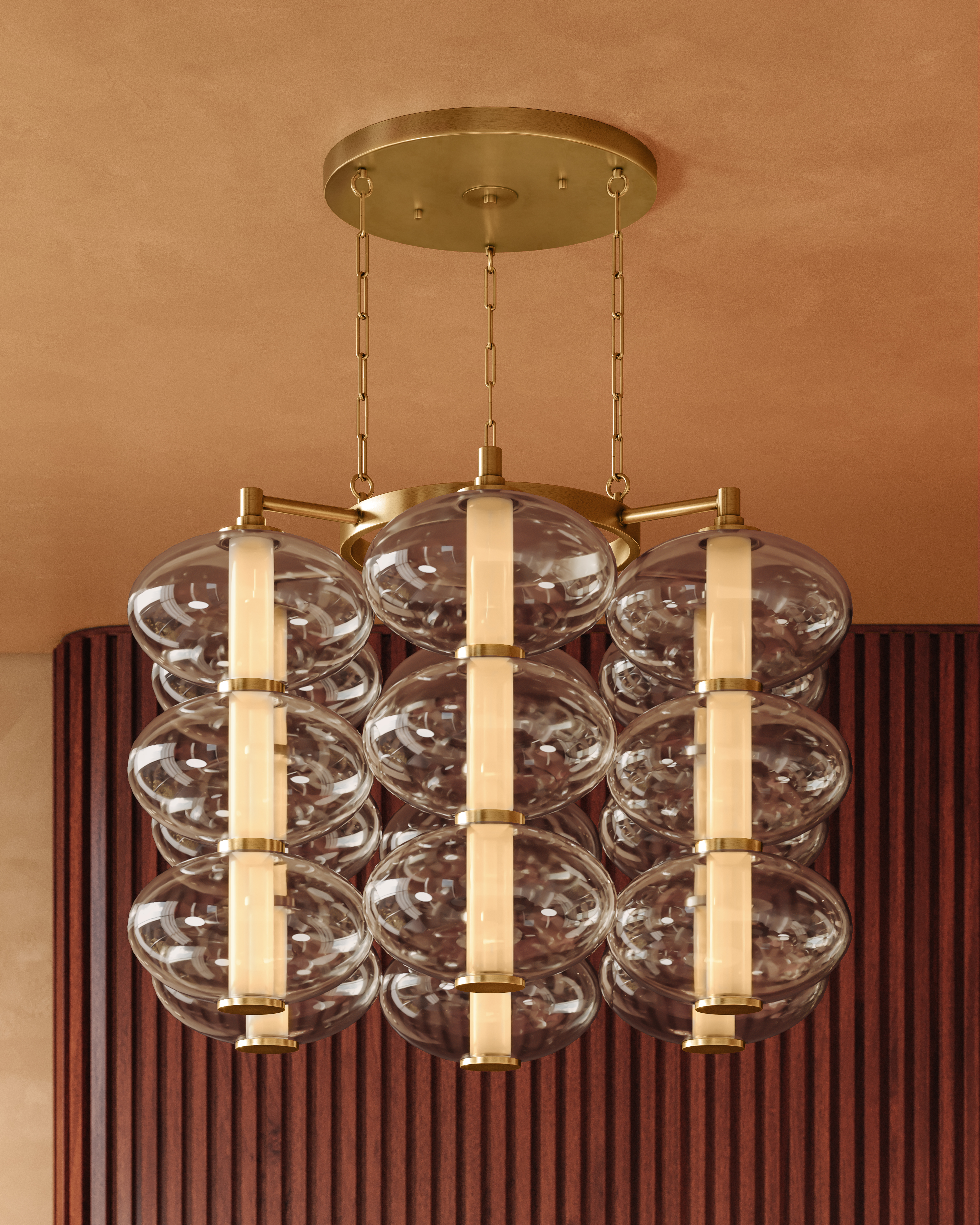 Drawing influence from the modernist era, Toulouse features sleek LED tubes surrounded by stacked oval-shaped glass orbs. The moody light bronze glass shades create bubble-like stacks, separated by Vintage Brass cuffs. Available as a sconce and a chandelier in two sizes, Toulouse is perfect for those who appreciate maximalist style with a contemporary twist.