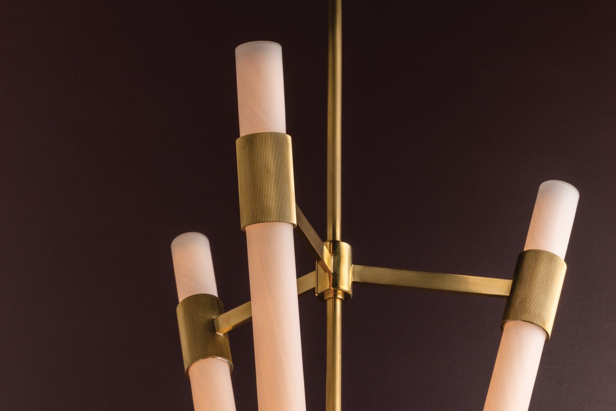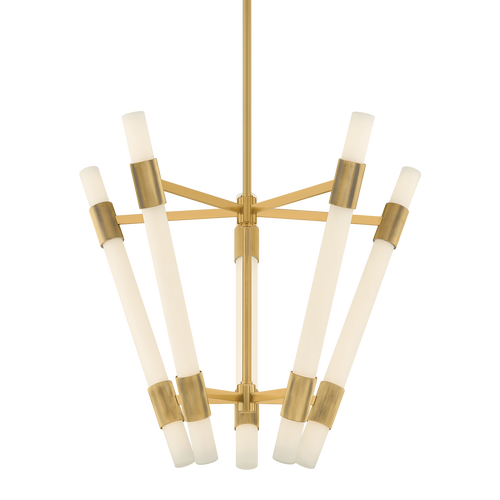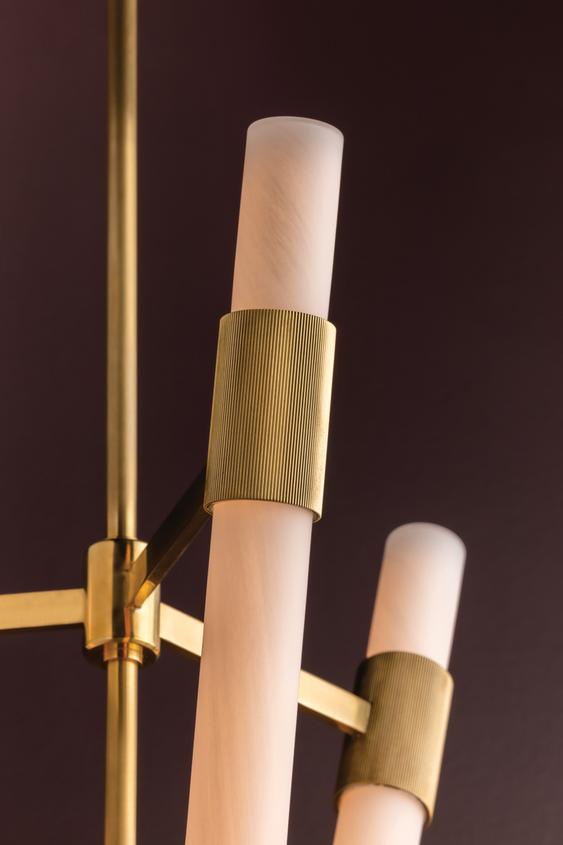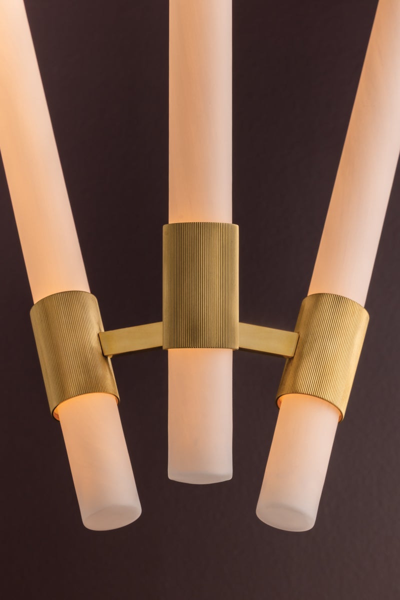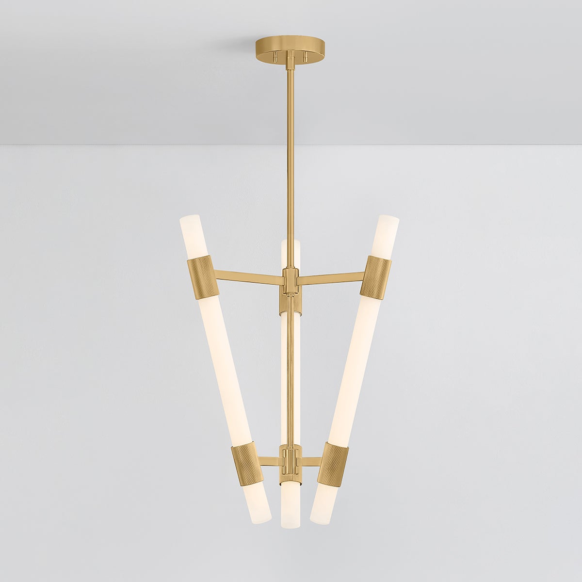 The futuristic design of Krakow uses minimalist forms to create a maximalist statement. Simple matte cloud glass tubes are illuminated by LED, providing bright overhead lighting without a harsh glare. Warm Vintage Brass cuffs with ribbed detailing support the shades, which tilt away from the frame to disperse light and create a striking visual impression from below. Available in two sizes, Krakow is a perfect choice for open staircases, grand foyers, or any area in need of a showstopping feature.