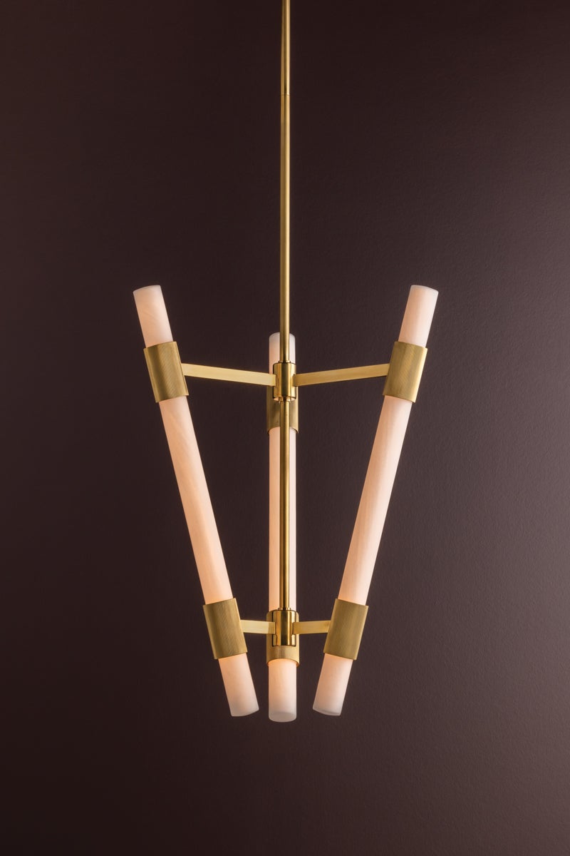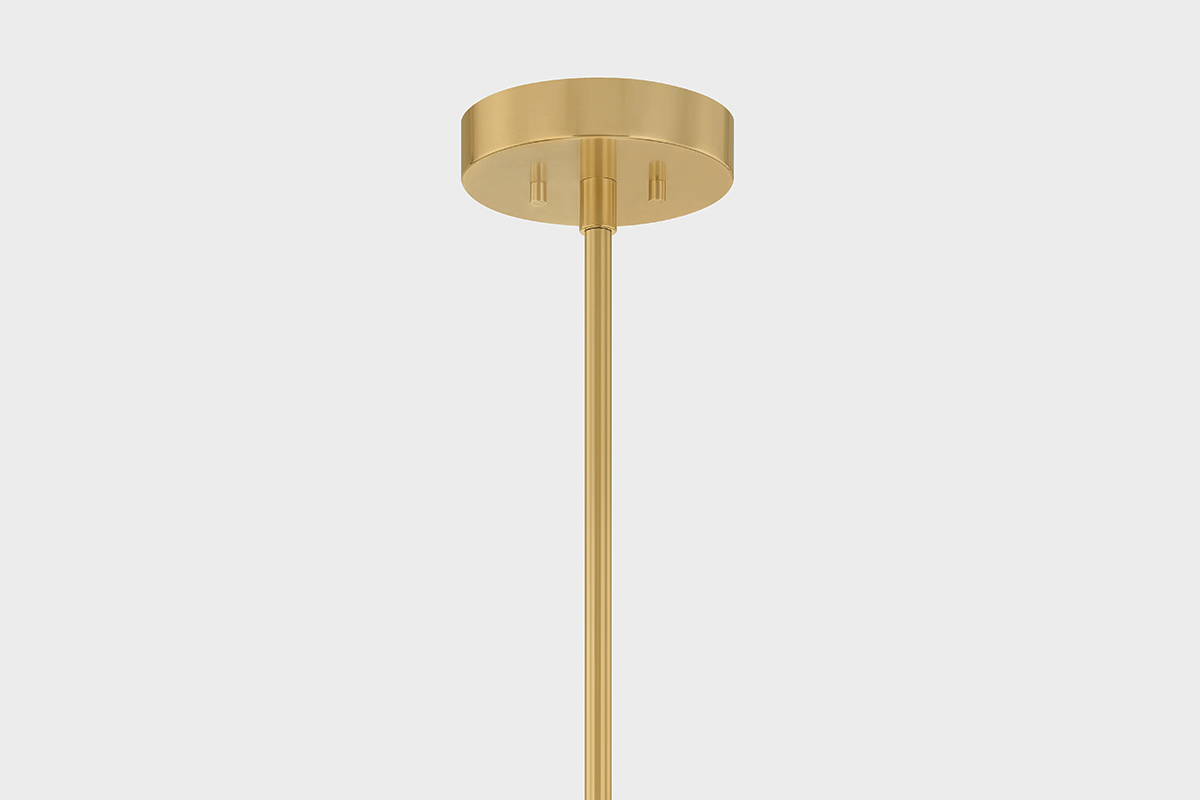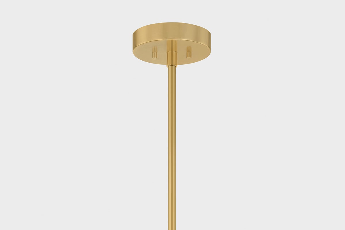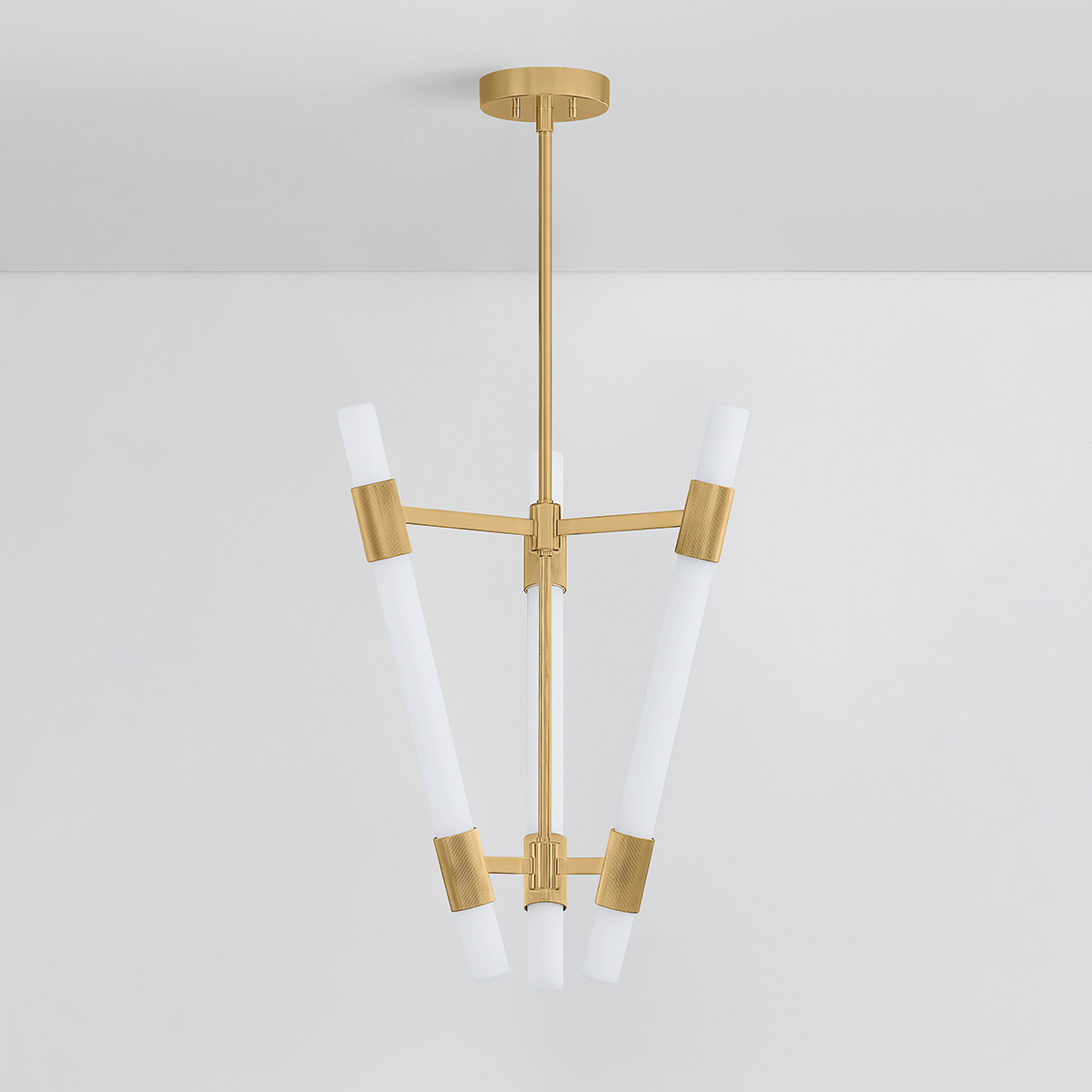 The futuristic design of Krakow uses minimalist forms to create a maximalist statement. Simple matte cloud glass tubes are illuminated by LED, providing bright overhead lighting without a harsh glare. Warm Vintage Brass cuffs with ribbed detailing support the shades, which tilt away from the frame to disperse light and create a striking visual impression from below. Available in two sizes, Krakow is a perfect choice for open staircases, grand foyers, or any area in need of a showstopping feature.