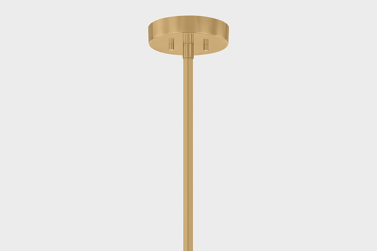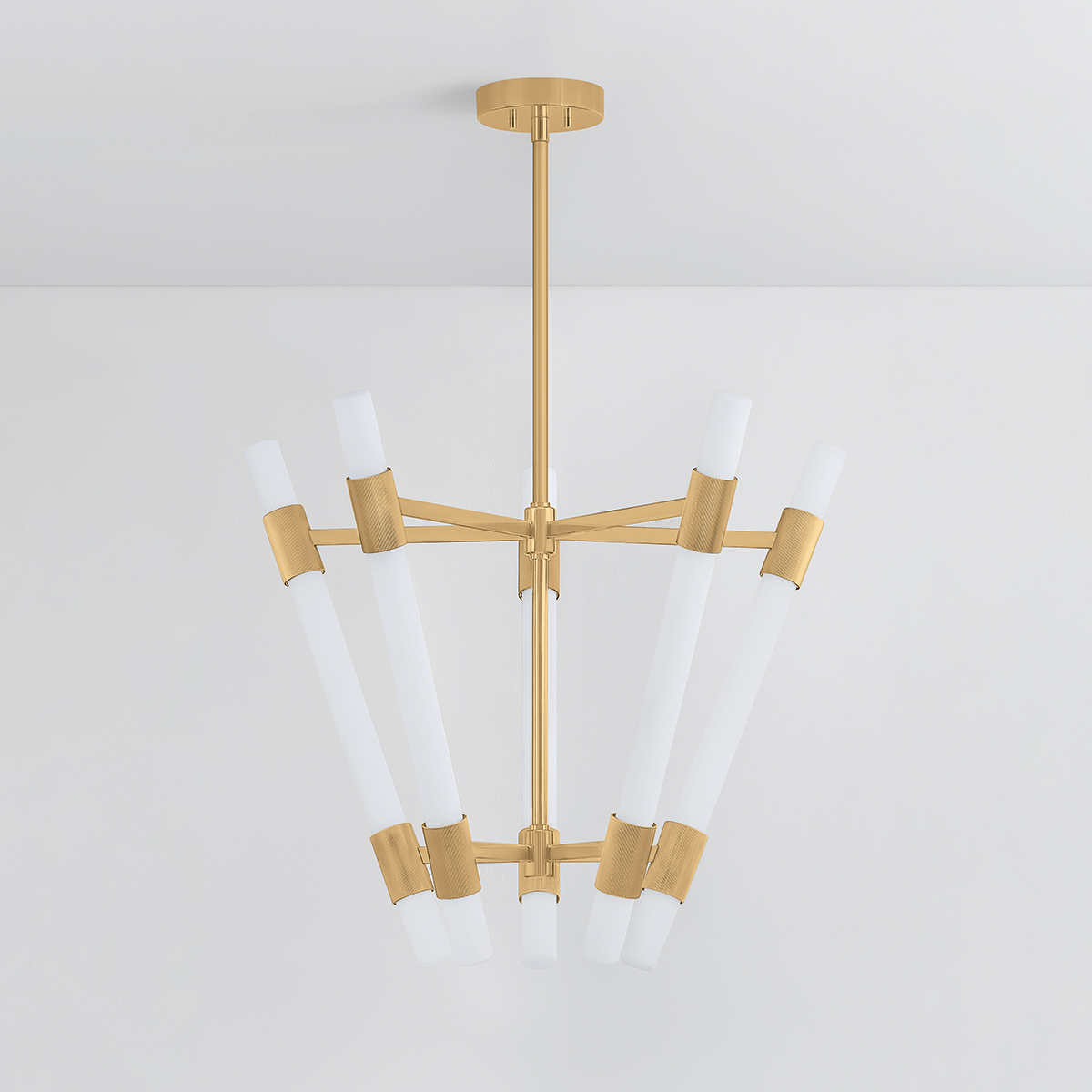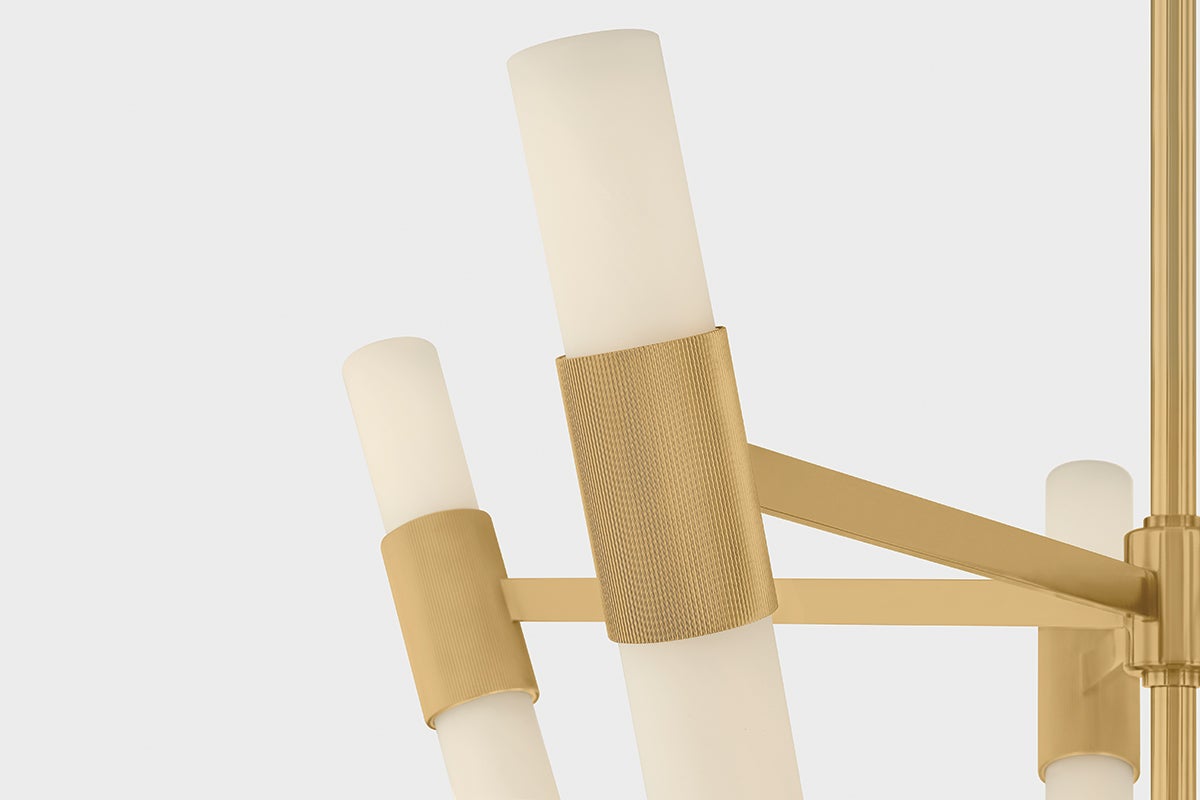 The futuristic design of Krakow uses minimalist forms to create a maximalist statement. Simple matte cloud glass tubes are illuminated by LED, providing bright overhead lighting without a harsh glare. Warm Vintage Brass cuffs with ribbed detailing support the shades, which tilt away from the frame to disperse light and create a striking visual impression from below. Available in two sizes, Krakow is a perfect choice for open staircases, grand foyers, or any area in need of a showstopping feature.
