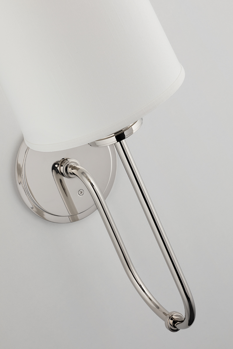 Dipping steeply from a circular backplate, Jericho’s curved arm gives the sconce impressive stature. Extending over ten inches from the wall to accommodate a generously scaled shade, Jericho is an eye-catching accent piece designed for spaces in search of a statement maker.
