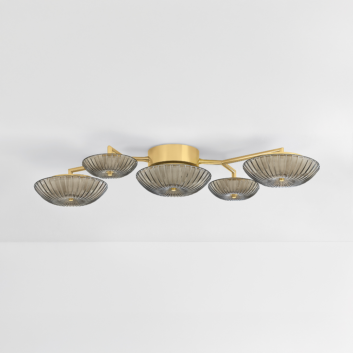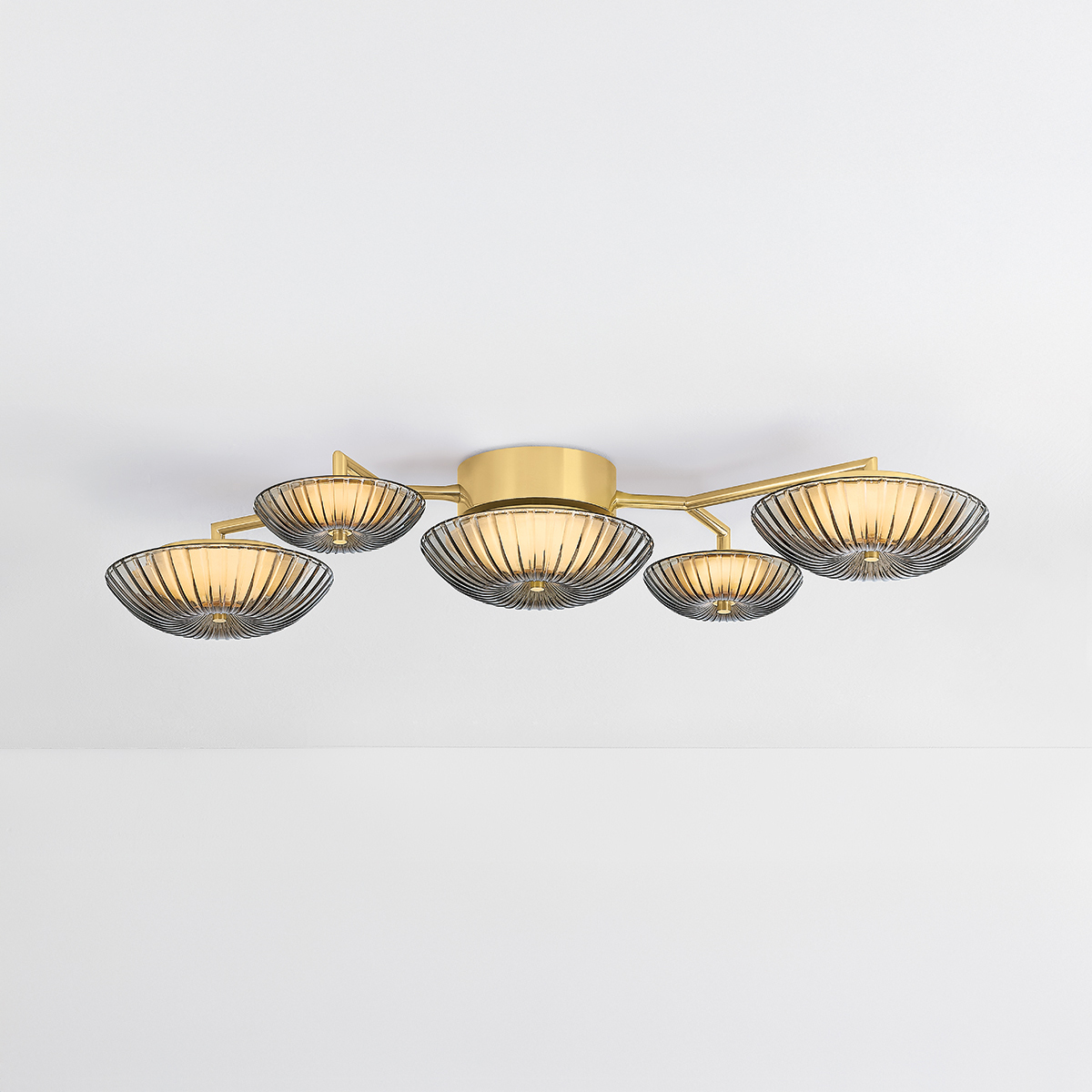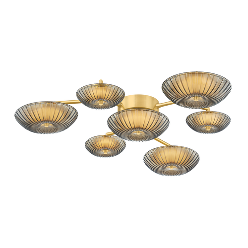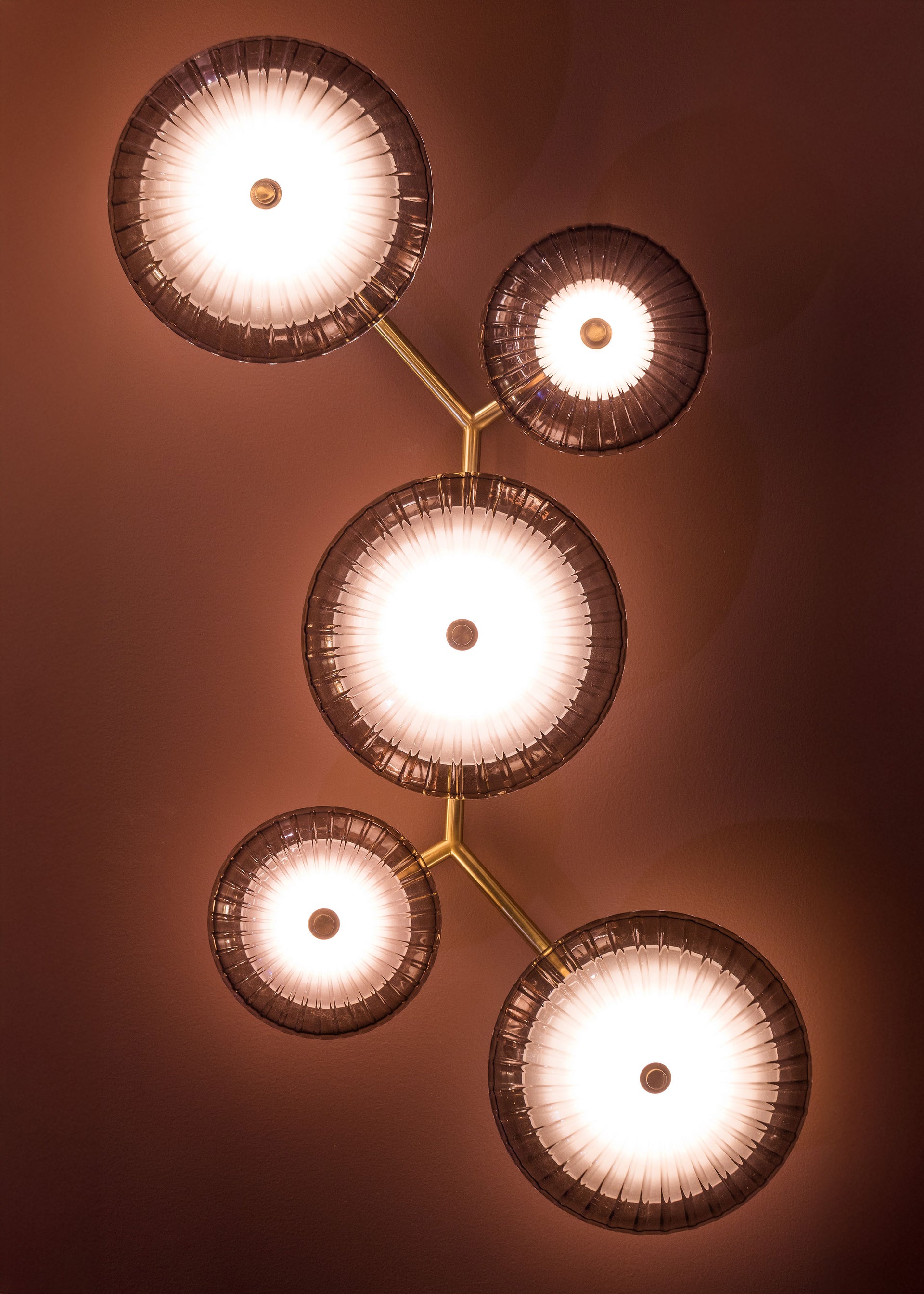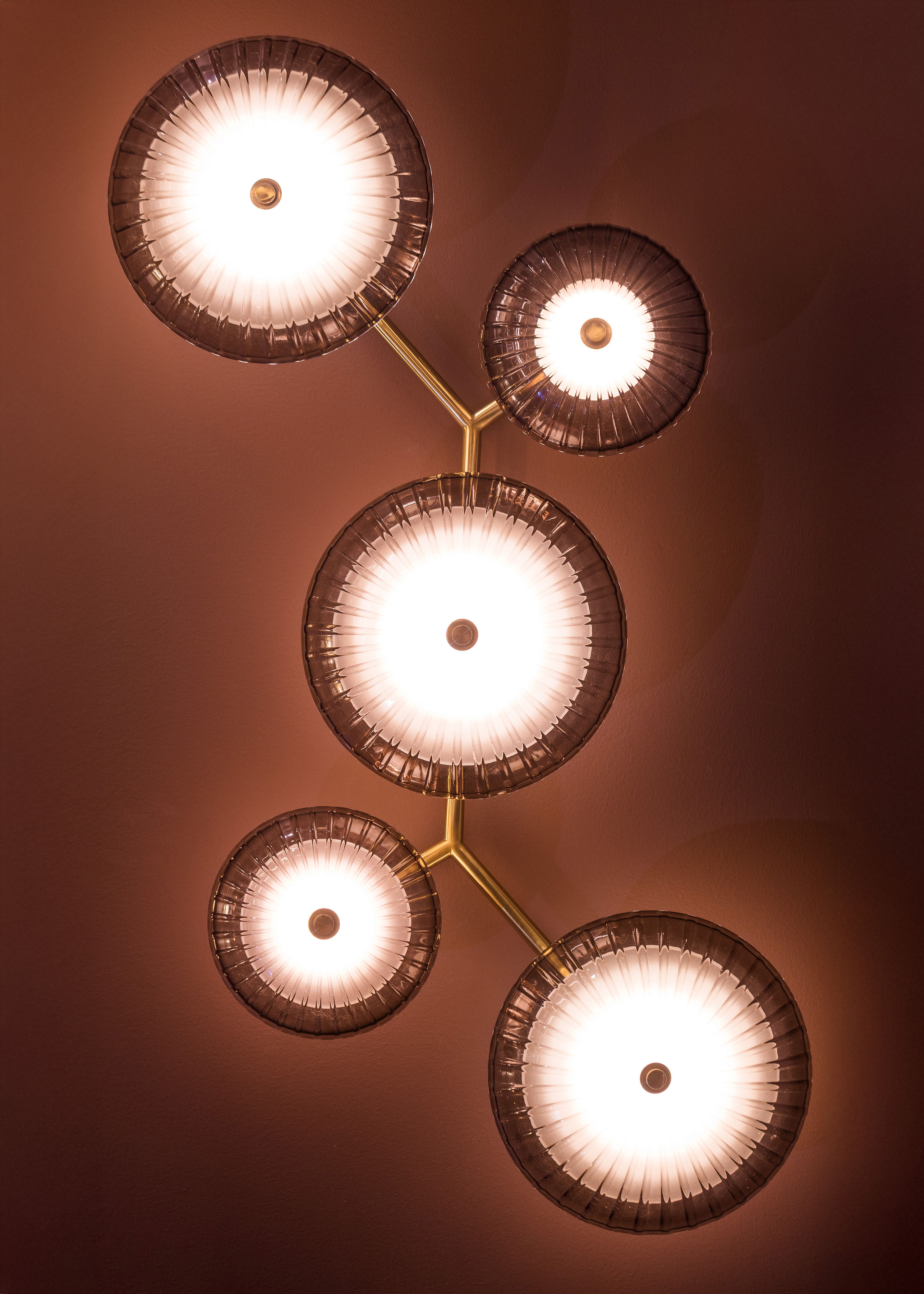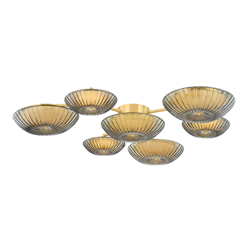Drawing inspiration from natural branching forms, Birmingham makes a boldly modern wall art statement. The design features starburst cast topaz Piastre glass shades and clear etched glass shades, facilitating an interplay of light, texture, and shape. Its unique scale and silhouette create a sculptural, immersive experience that draws the eye. Birmingham is available in three formats with a Vintage Brass finish.
