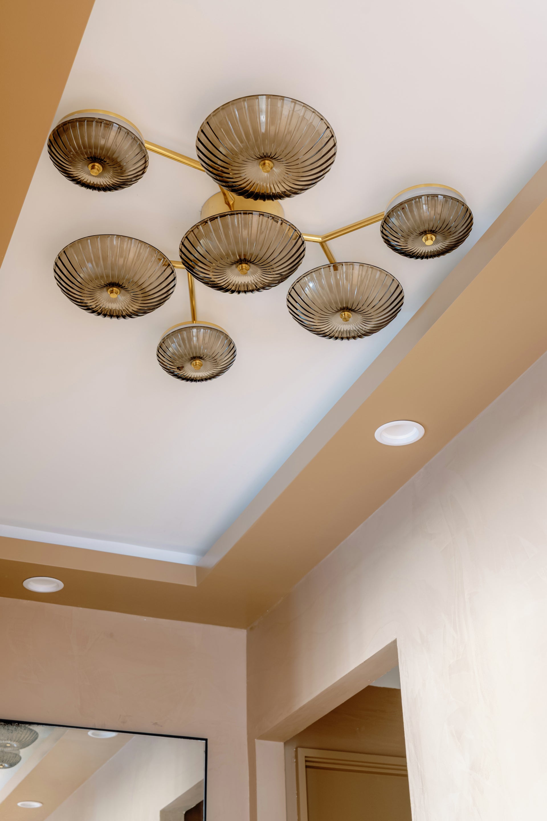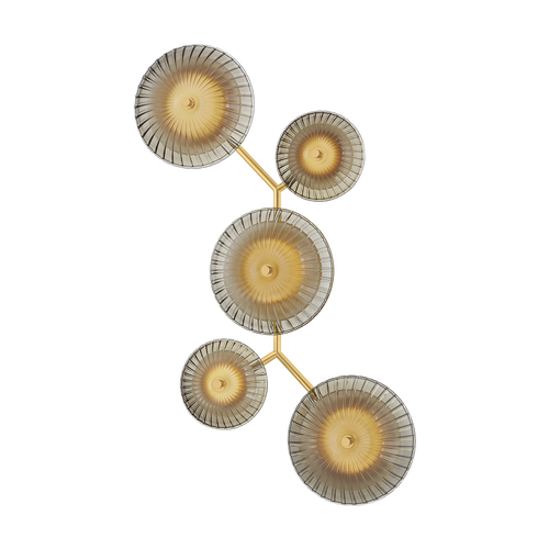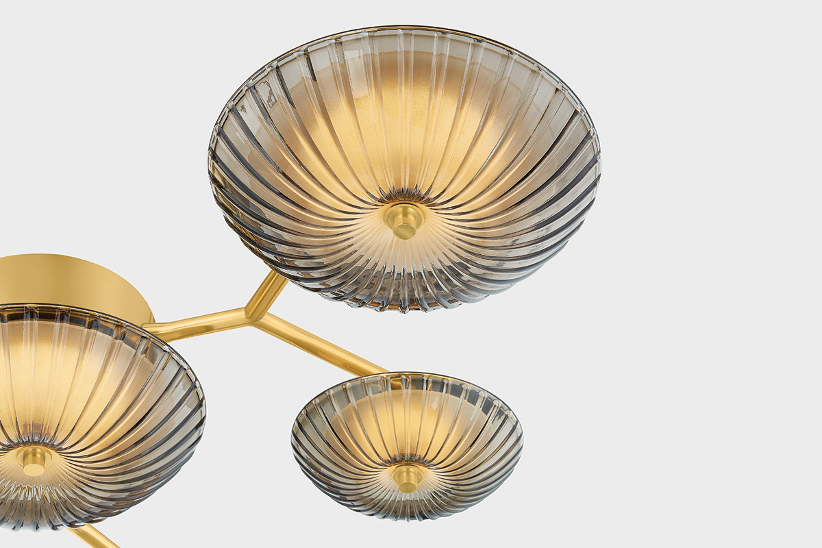 Drawing inspiration from natural branching forms, Birmingham makes a boldly modern wall art statement. The design features starburst cast topaz Piastre glass shades and clear etched glass shades, facilitating an interplay of light, texture, and shape. Its unique scale and silhouette create a sculptural, immersive experience that draws the eye. Birmingham is available in three formats with a Vintage Brass finish.