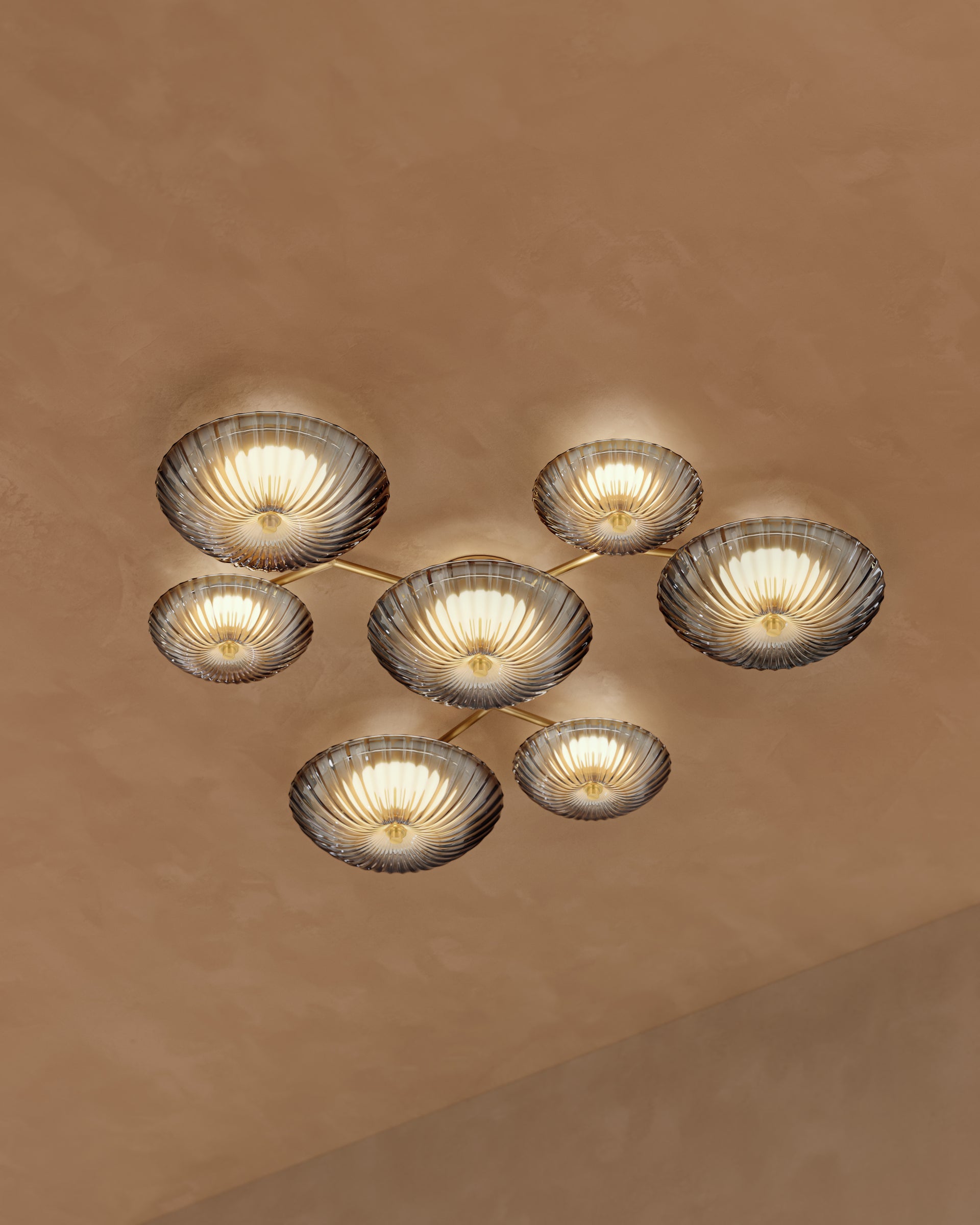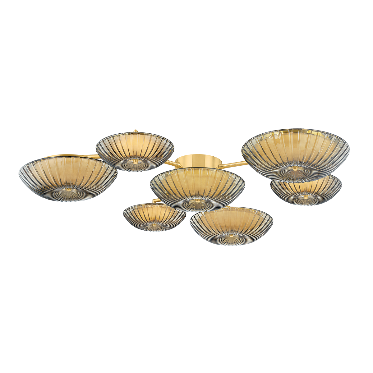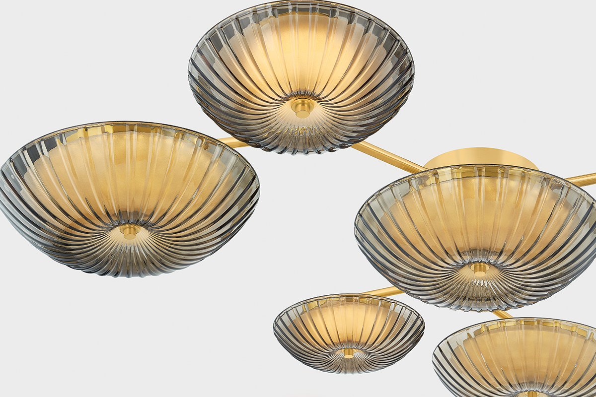 Drawing inspiration from natural branching forms, Birmingham makes a boldly modern wall art statement. The design features starburst cast topaz Piastre glass shades and clear etched glass shades, facilitating an interplay of light, texture, and shape. Its unique scale and silhouette create a sculptural, immersive experience that draws the eye. Birmingham is available in three formats with a Vintage Brass finish.