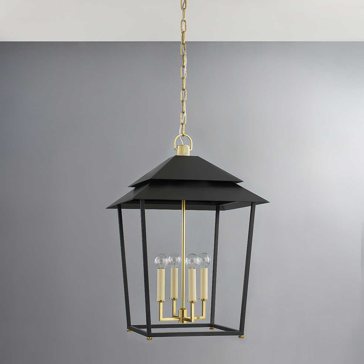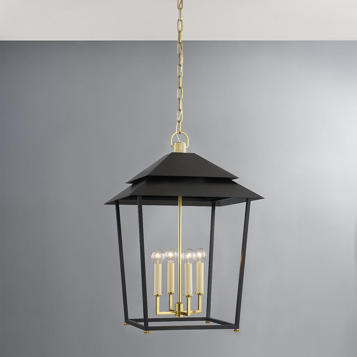 Natick is clean, open, and airy. The double roofline stands out from a traditional lantern, while the Aged Brass metal feet and squared arms add to the unique quality of the piece.