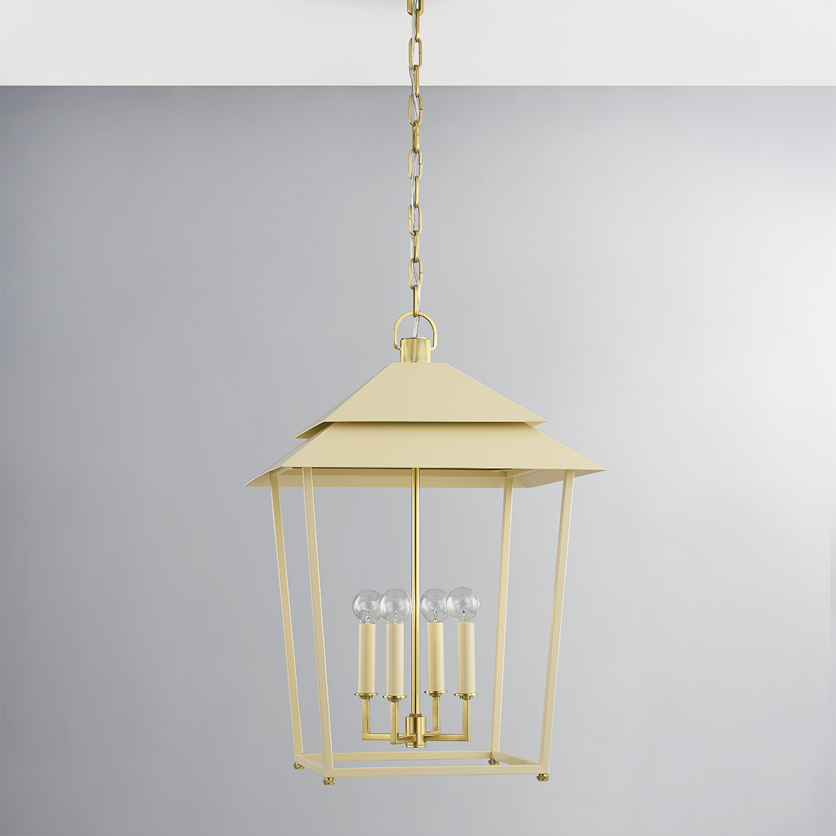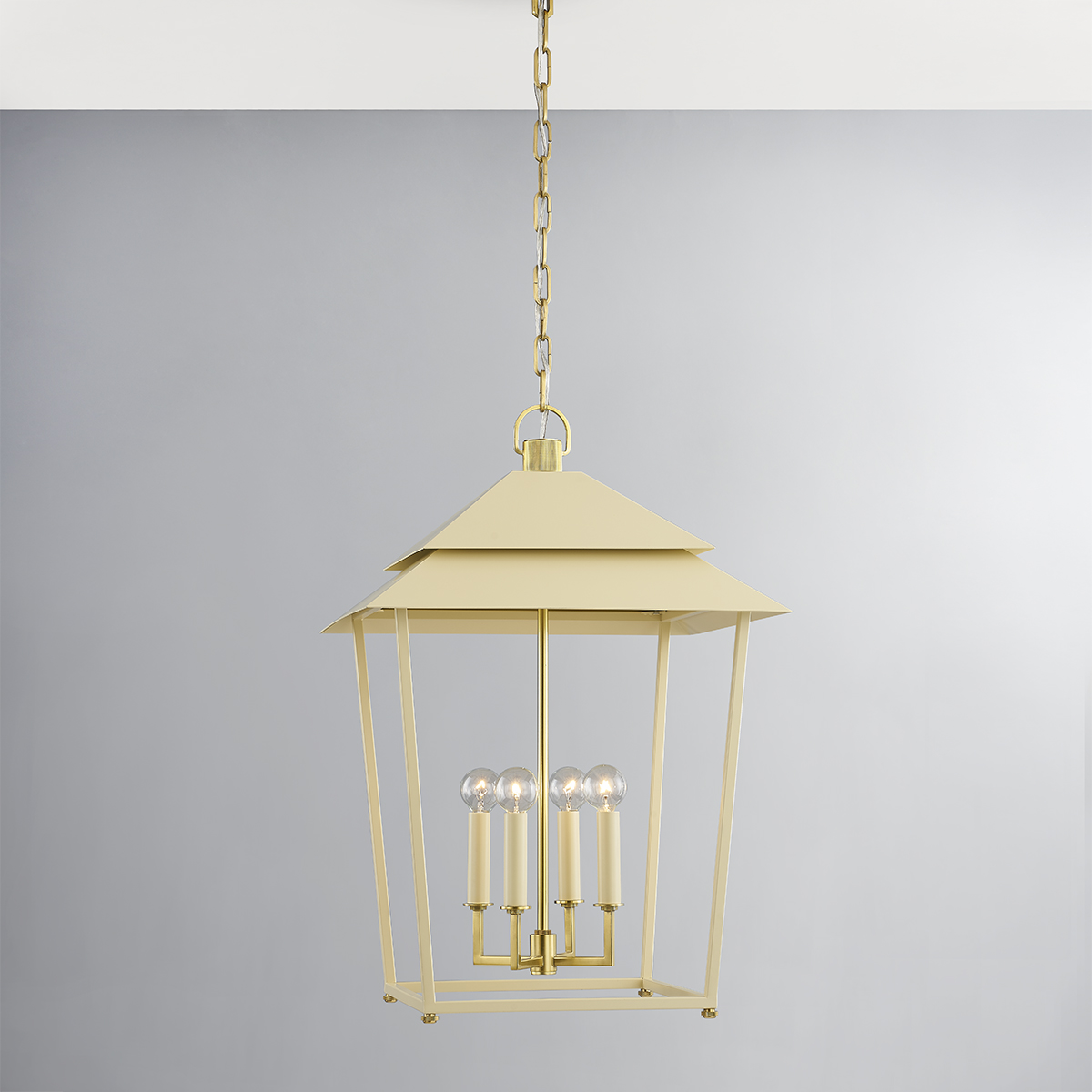 Natick is clean, open, and airy. The double roofline stands out from a traditional lantern, while the Aged Brass metal feet and squared arms add to the unique quality of the piece.