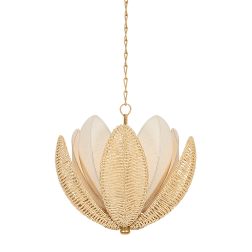 A celebration of nature, Costa Brava is the perfect blend of tropical texture and tonality. The outer shade of ‘petals’ is strung with coco shell beads, while the inner layer is woven from grained natural linen. Each petal features a center rib, creating a graceful curve to the shade. The Vintage Gold Leaf finial and canopy add a luxurious note. Available in two sizes, Costa Brava is an organic delight for any space.