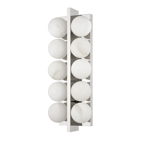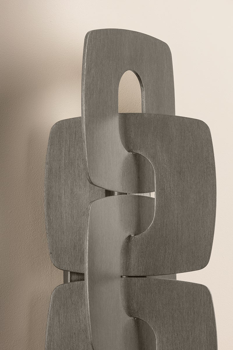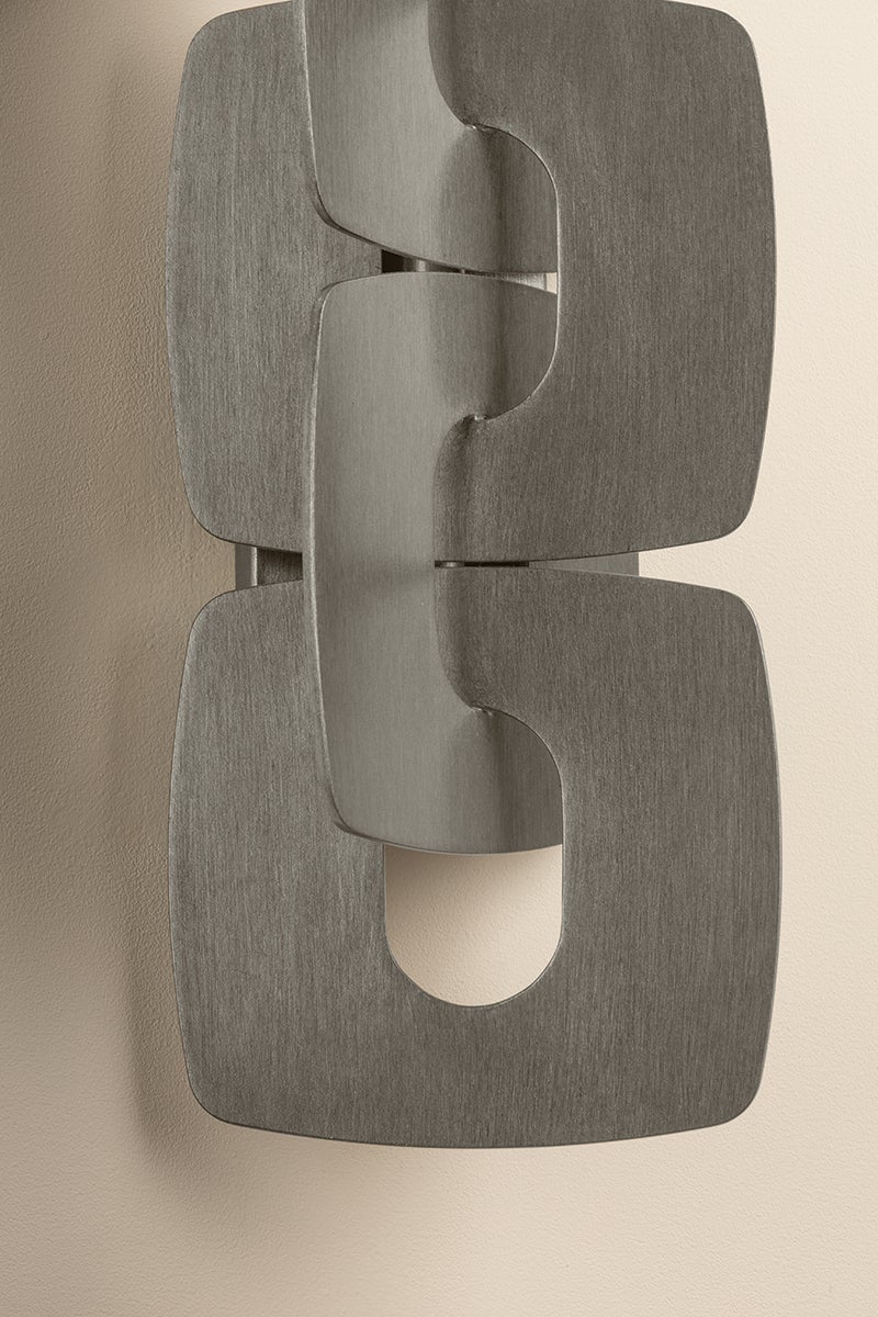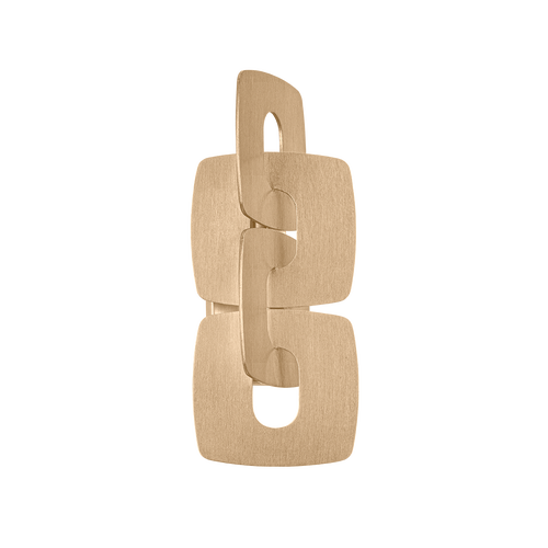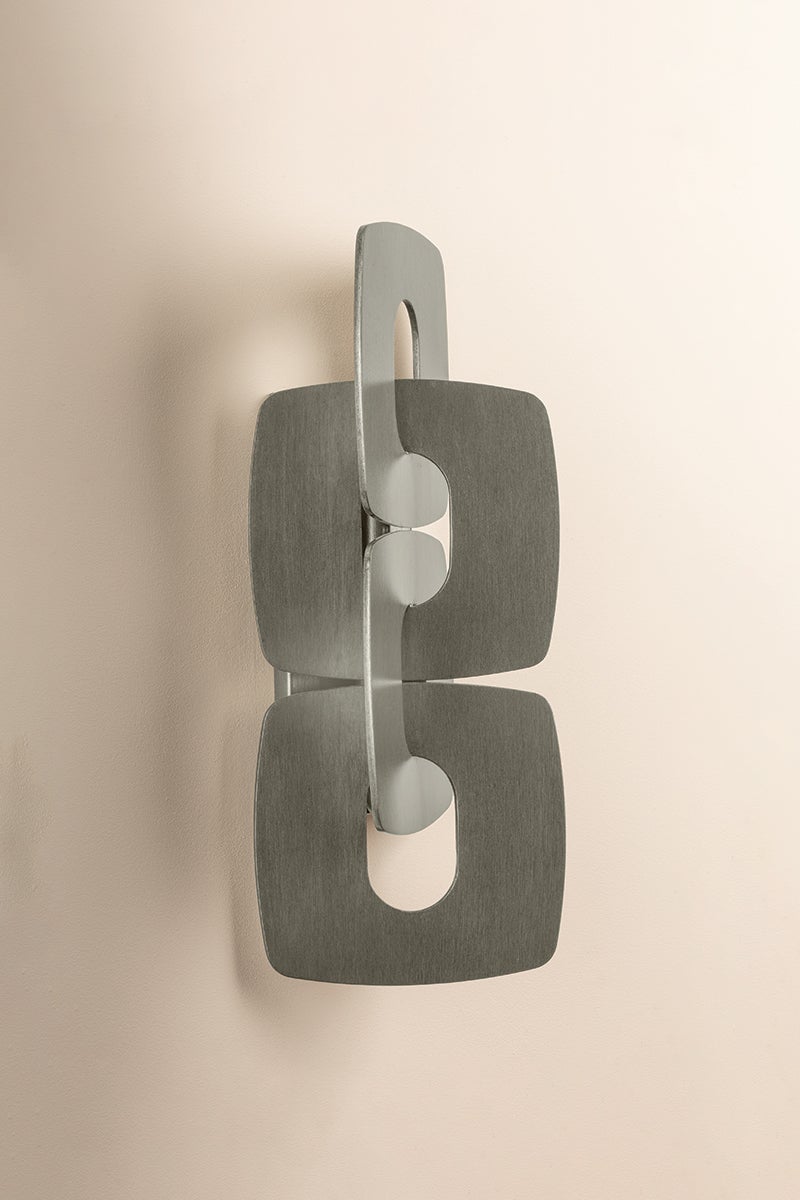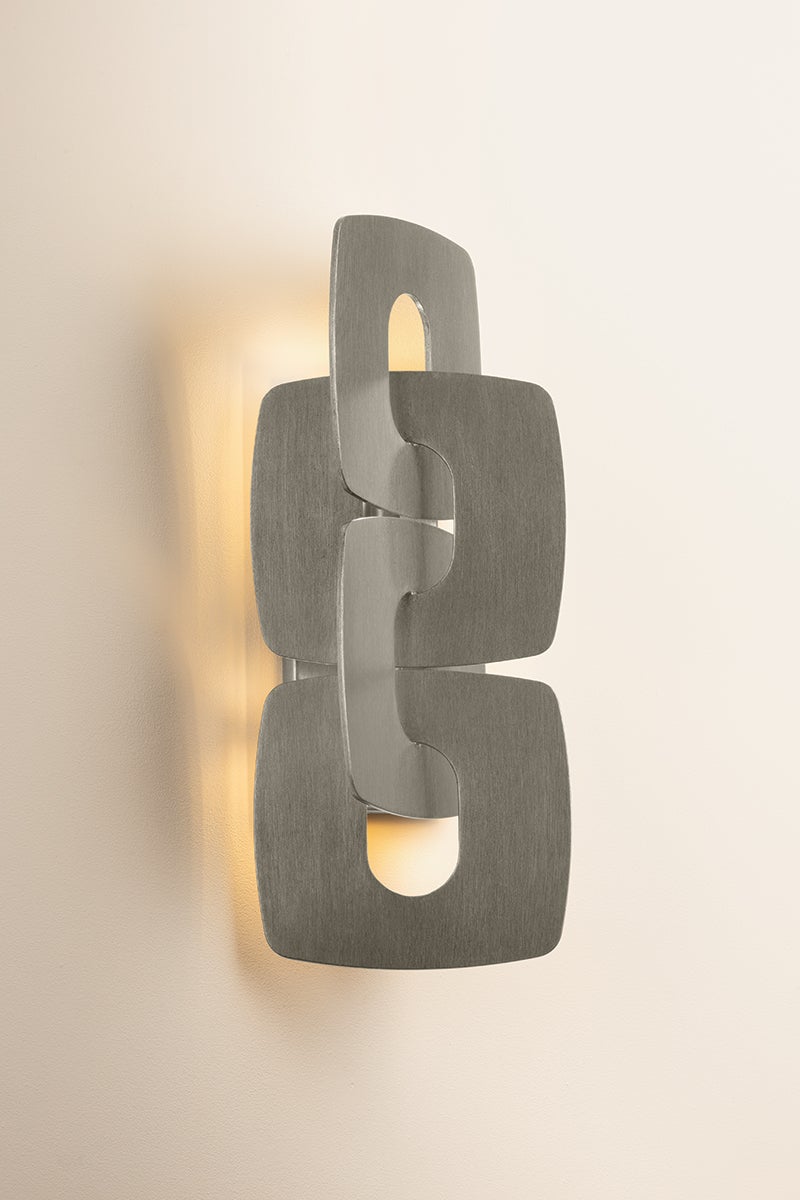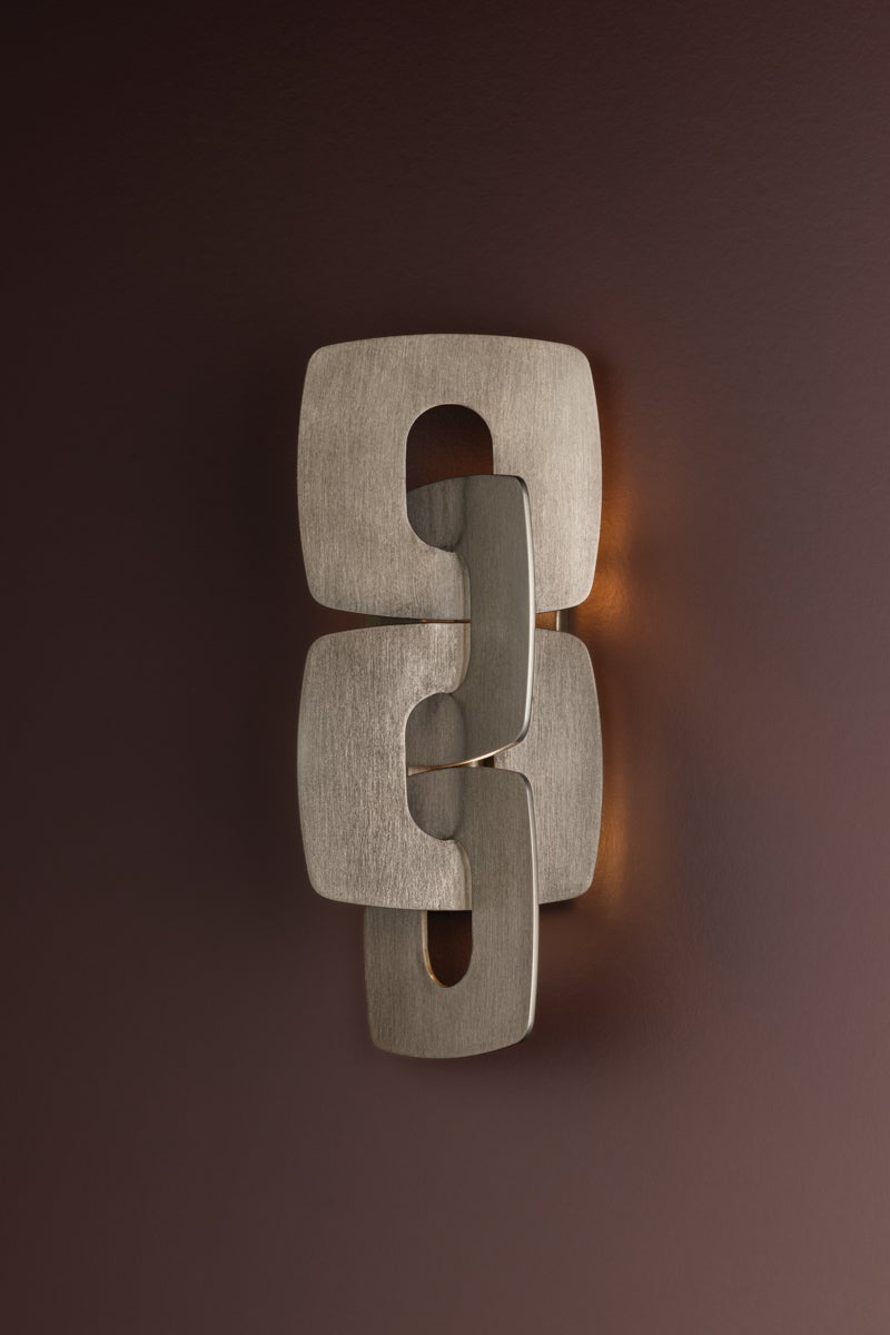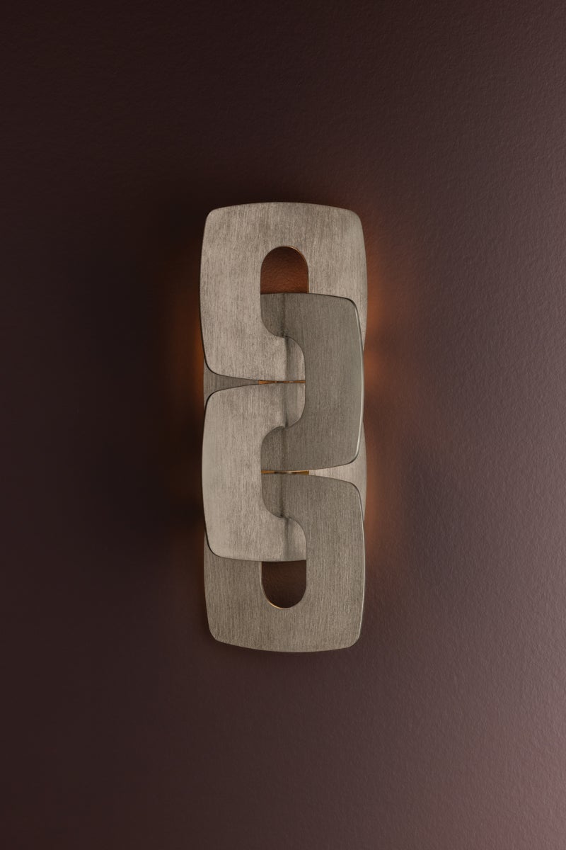The Trentino sconce takes inspiration from a classic jewelry chain, magnifying the scale to produce a bold, modern lighting statement. Sculptural, yet simple, the geometric silhouette conceals the light source, which washes the wall with a warm glow. This engaging composition is available in two luxurious finishes, Stria Gold Leaf and Stria Silver Leaf.