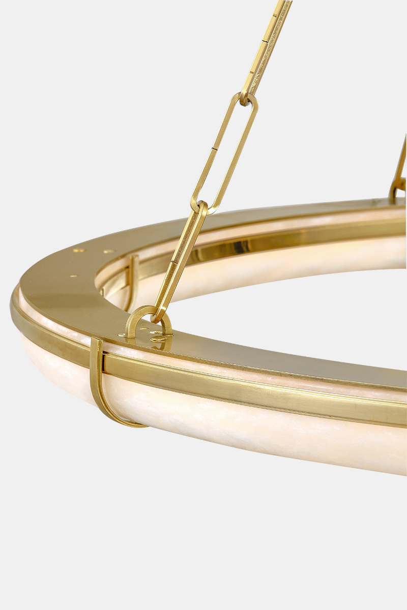With a large ring-like silhouette, Sennett celebrates the natural beauty of alabaster. The concealed LED emanates a gentle, cozy glow, accentuating the ethereal essence and unique veining of this natural stone. Available in two sizes, Sennett is finished with a sleek Aged Brass framework that lends a modern elegance to interiors.