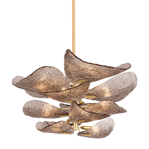 Appearing to sprout from the ceiling, the Cardiff chandelier is a feat of nature-inspired wonder. Billowing dark bronze Piastra glass ‘petals’ are thoughtfully arrayed around a center ‘stem,’ giving the design a layered, floating effect. Each petal has been etched with a sunburst optic pattern to add dimensionality. A luxurious Vintage Gold Leaf finish accents the delicate otherworldly nature of the glass. Available with 8 or 12 lights.