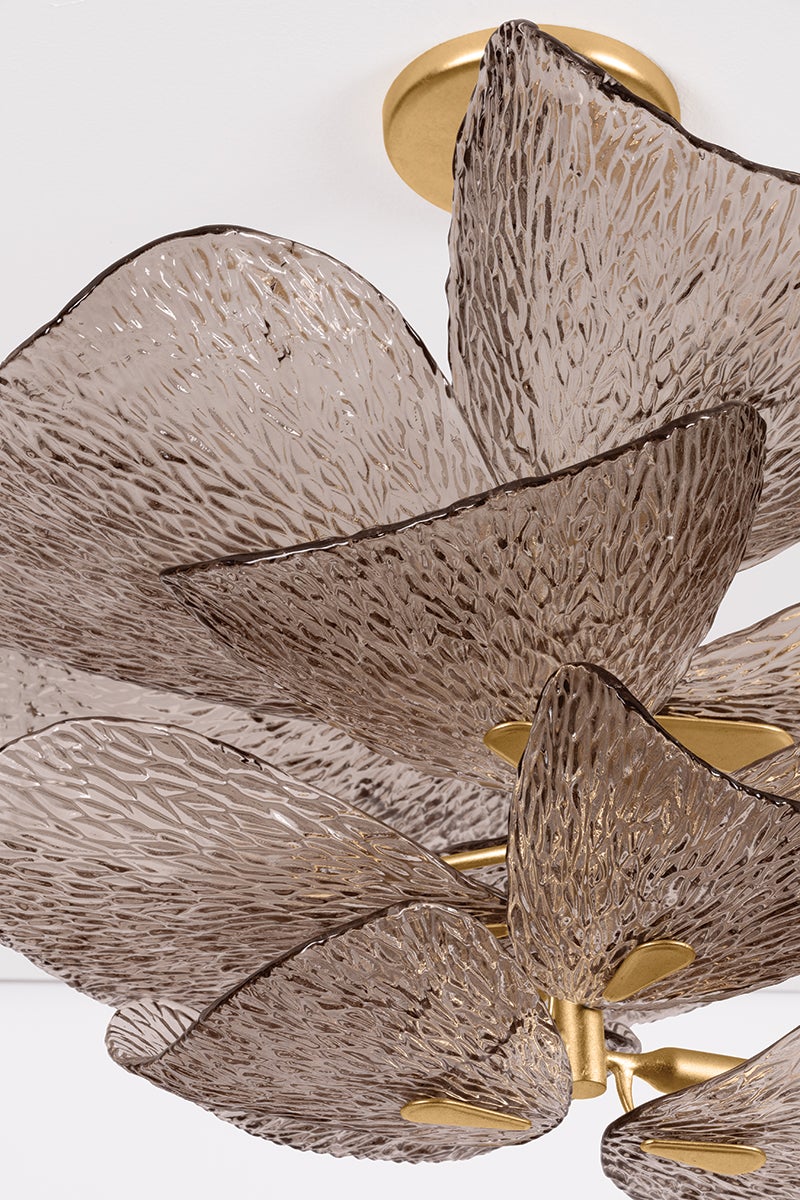 Appearing to sprout from the ceiling, the Cardiff chandelier is a feat of nature-inspired wonder. Billowing dark bronze Piastra glass ‘petals’ are thoughtfully arrayed around a center ‘stem,’ giving the design a layered, floating effect. Each petal has been etched with a sunburst optic pattern to add dimensionality. A luxurious Vintage Gold Leaf finish accents the delicate otherworldly nature of the glass. Available with 8 or 12 lights.