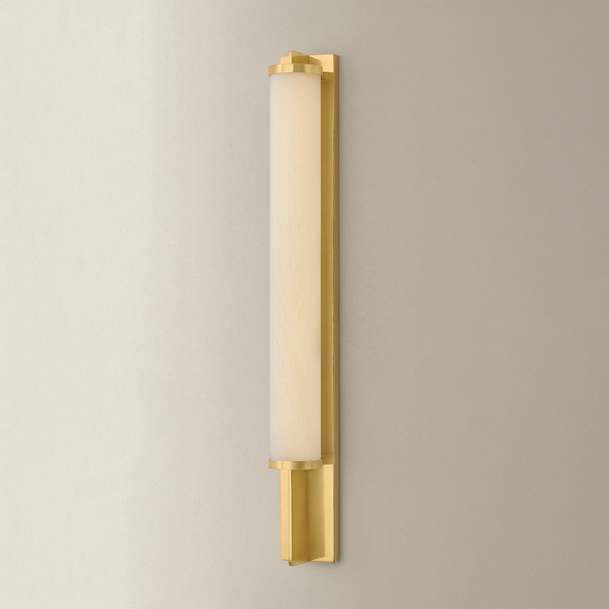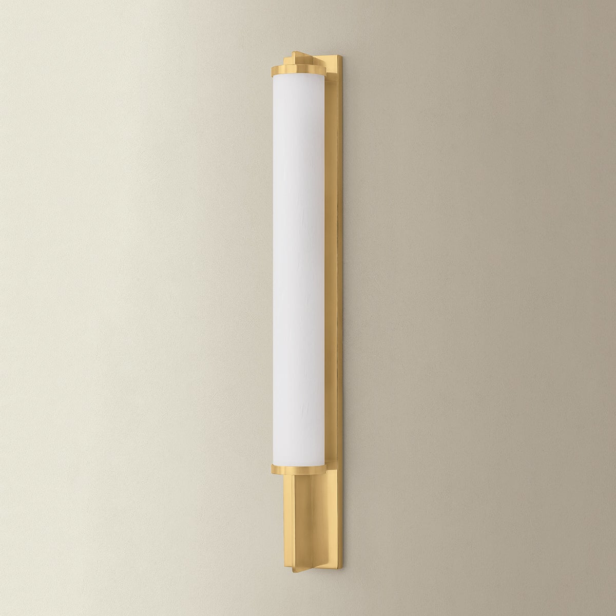 Sharp edges and soft curves find common ground in the minimalist composition of the Northfield sconce. This simple design includes one or two matte cloud glass tube shades standing vertically within streamlined metalwork finished in Aged Brass. The understated modern style makes this a versatile staple for many design schemes.