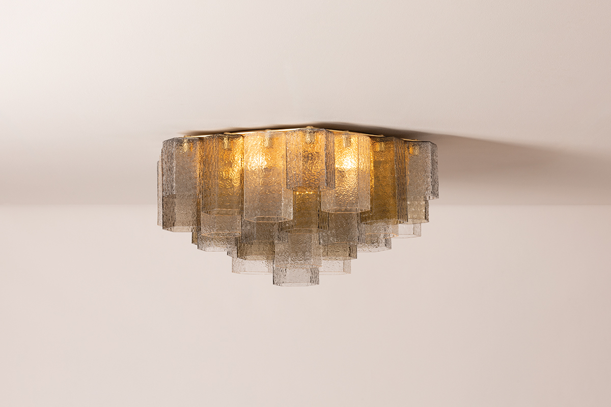 The complex layered design, exquisite use of specialty glass, and scale of Helsinki make a glamorous first impression. Featuring clear, light bronze, and smoke glass, this statement ceiling fixture creates a captivating visual effect with its hexagonal glass shades, staggered in both color and length to form a dense, honeycomb-like shape. Available in two sizes, Helsinki brings a sense of drama to a larger space.