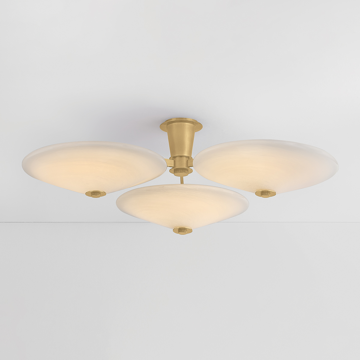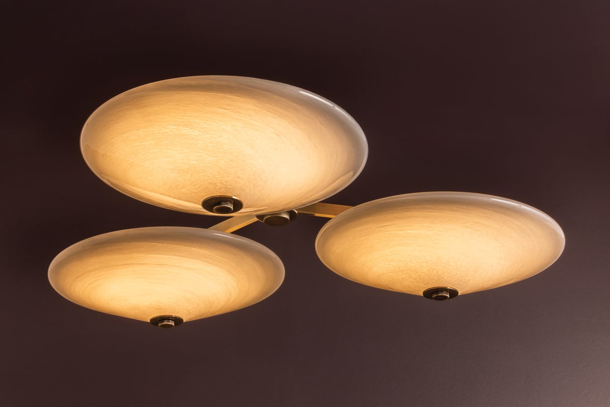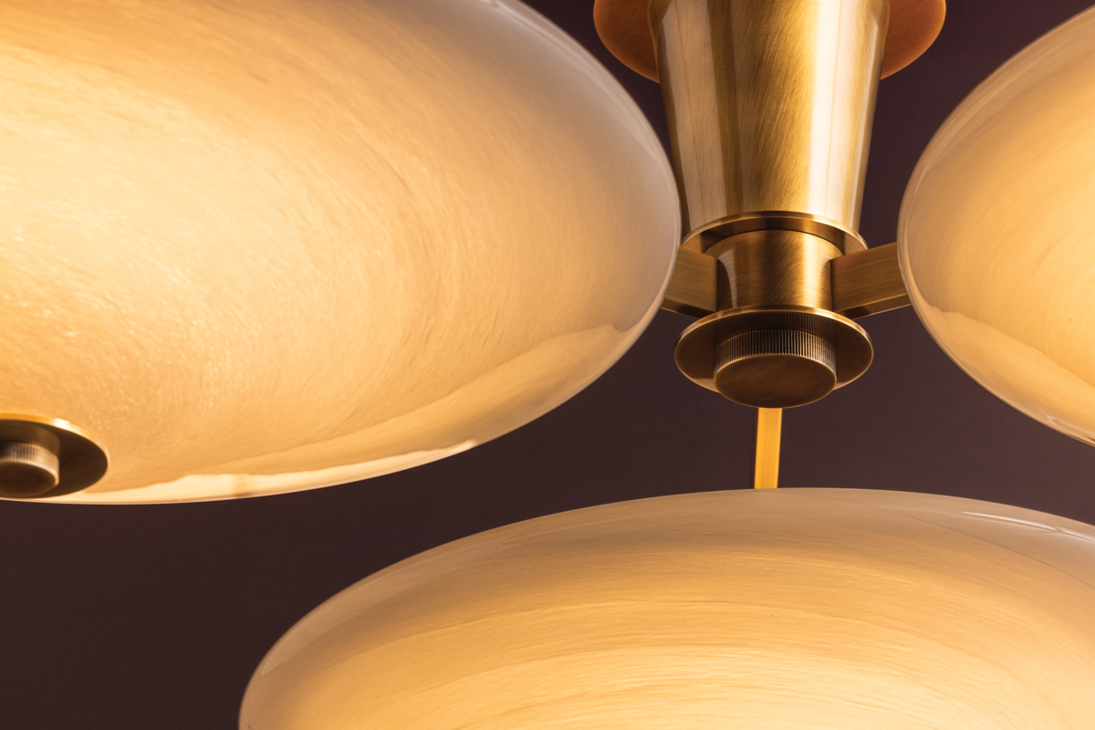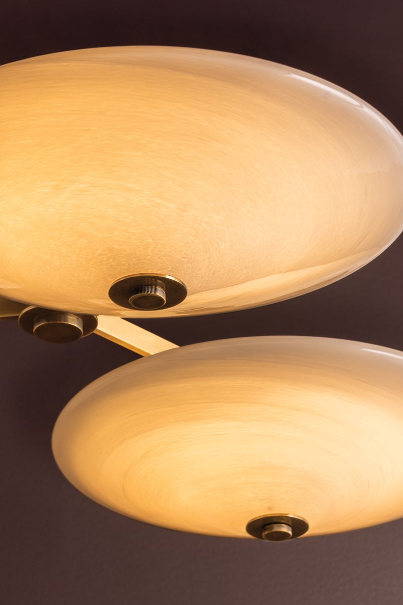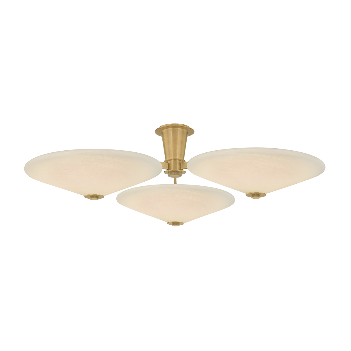 Modern and sophisticated, the Cologne semi-flush mount features sleek metalwork and wide tapered cloud glass shades. Finished in Vintage Brass, the frame complements and supports the disc-like shape of the shades without detracting from them. Available with 1, 3, or 5 lights, Cologne makes an architectural statement on the ceiling.