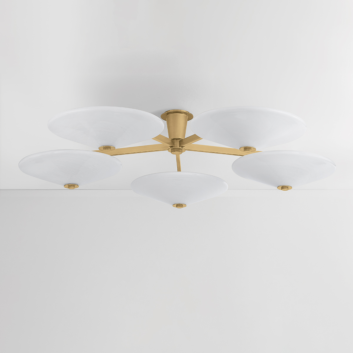 Modern and sophisticated, the Cologne semi-flush mount features sleek metalwork and wide tapered cloud glass shades. Finished in Vintage Brass, the frame complements and supports the disc-like shape of the shades without detracting from them. Available with 1, 3, or 5 lights, Cologne makes an architectural statement on the ceiling.