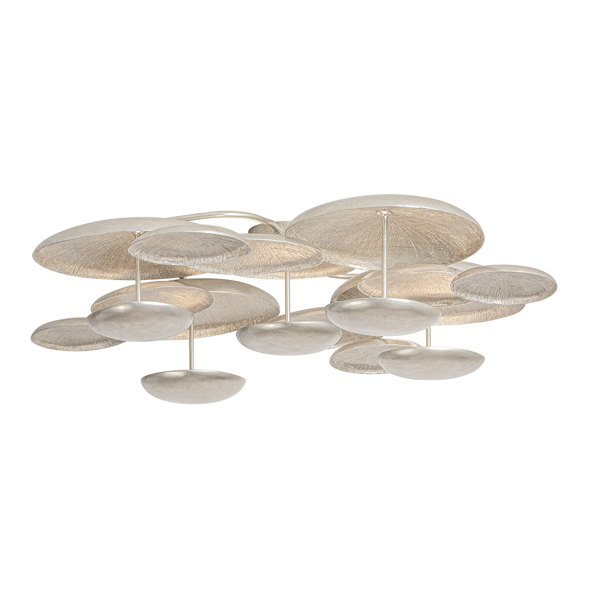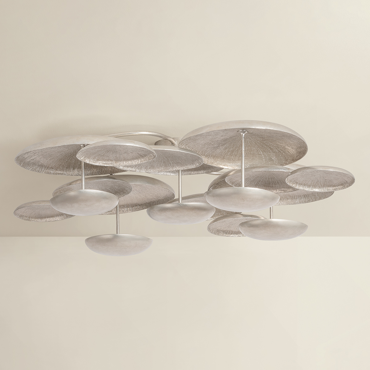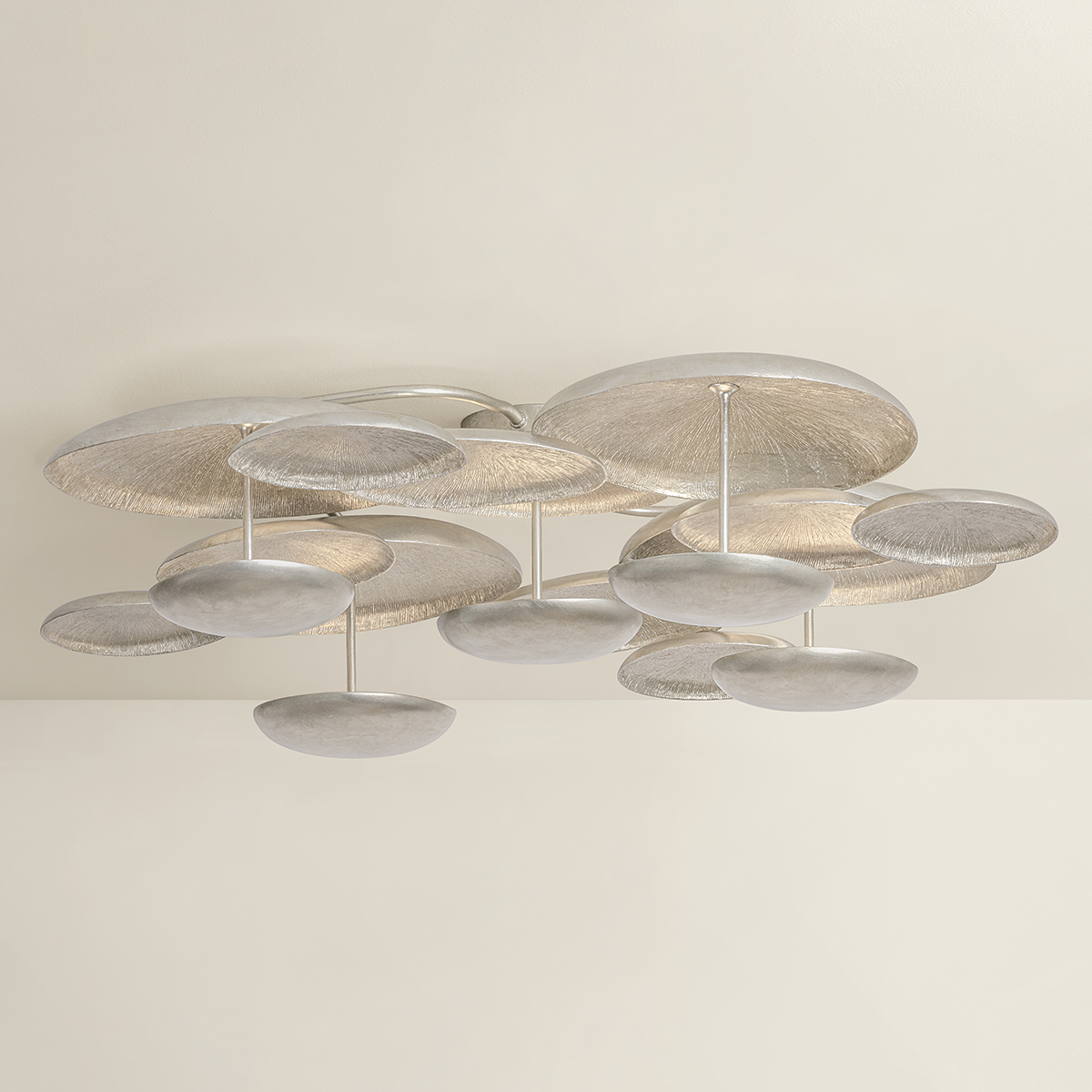 A close-to-ceiling fixture, the Fistral semi flush mount celebrates smooth, flowing shapes through its balanced, sculptural composition. Rounded metal discs are organized in an organic formation, creating a multi-dimensional layered effect. Finished in textured Warm Silver Leaf, the discs catch and reflect light from the integrated LED to produce an ambient glow. This stunning statement piece is available in two sizes.