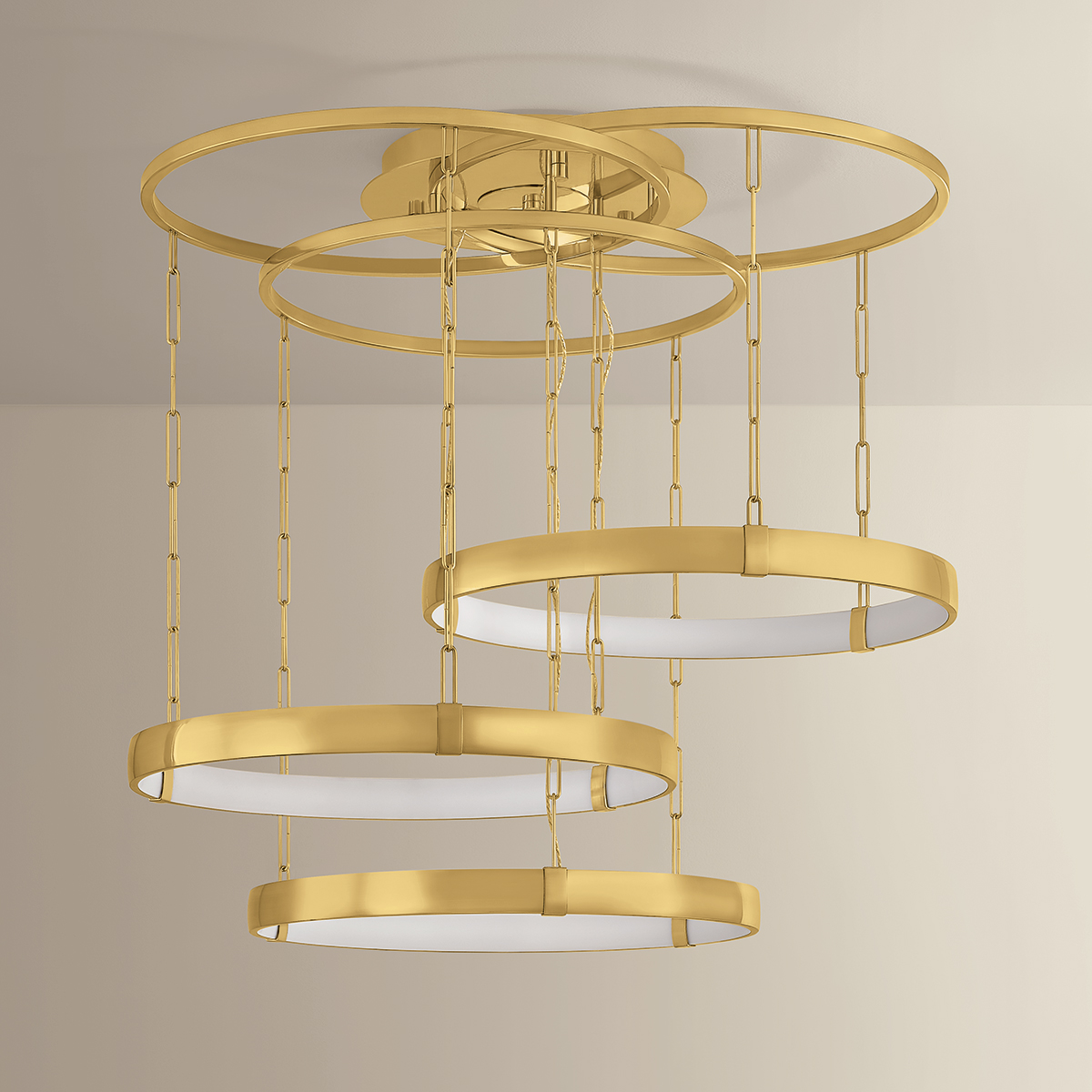 A series of concentric hoops dangle below the marionette suspension of the Chiasso chandelier, creating a sculptural sense of verticality. Within each ring, a convex curved diffuser directs light inwards, emitting a glow that surrounds the entire piece. Available in two three-light chandelier sizes, Chiasso’s grandeur is enriched by a Vintage Patina Brass finish.