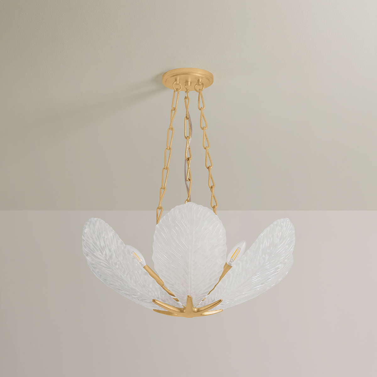 Boldly botanical, the Galena chandelier is characterized by a bowl-shaped silhouette with a central candelabra cluster. Each piastre glass petal is etched with vein-like detailing that adds to the sense of realism. A sculpted metal sepal gathers the petals, coordinating with the Vintage Gold Leaf-finished suspension. Available with 6 or 9 lights.
