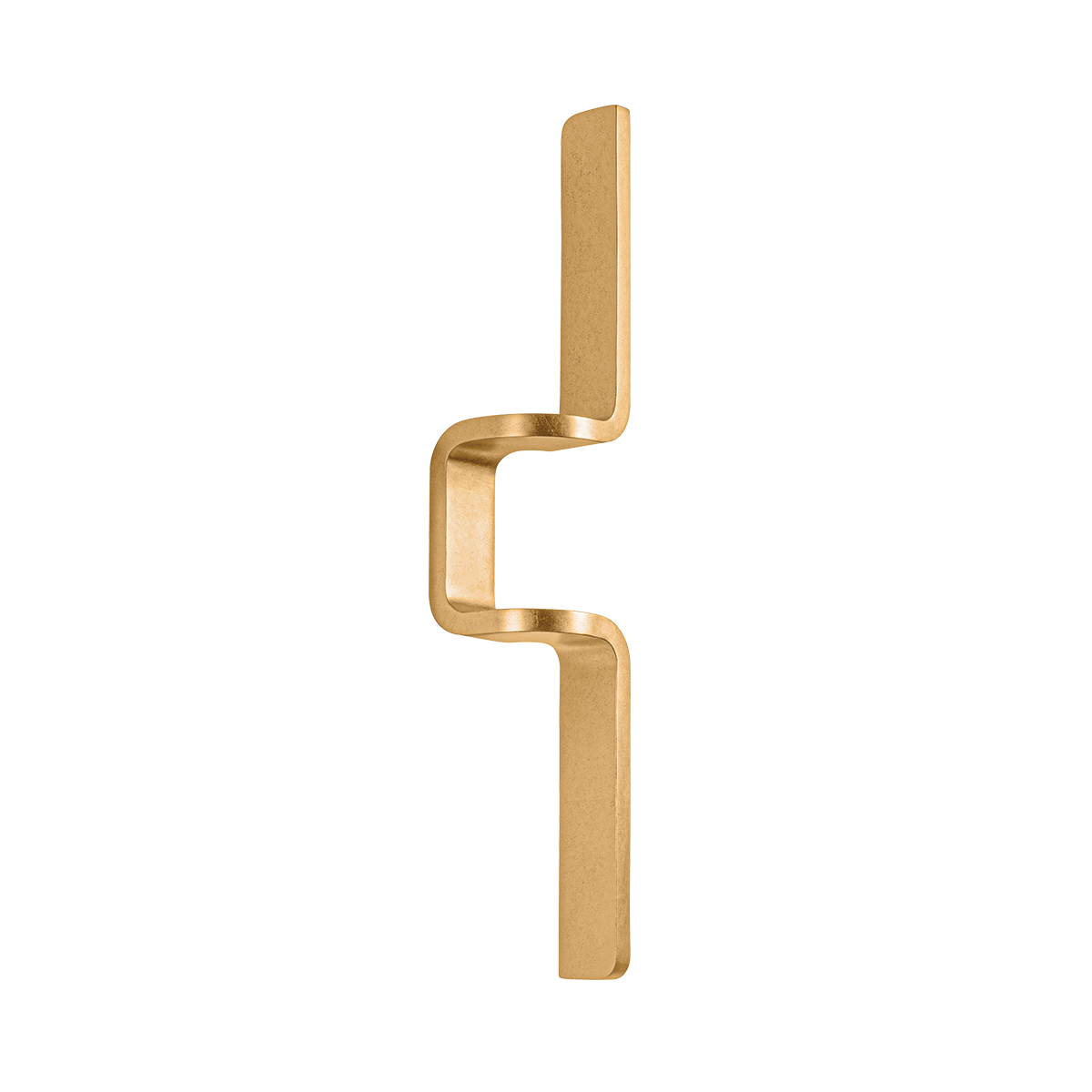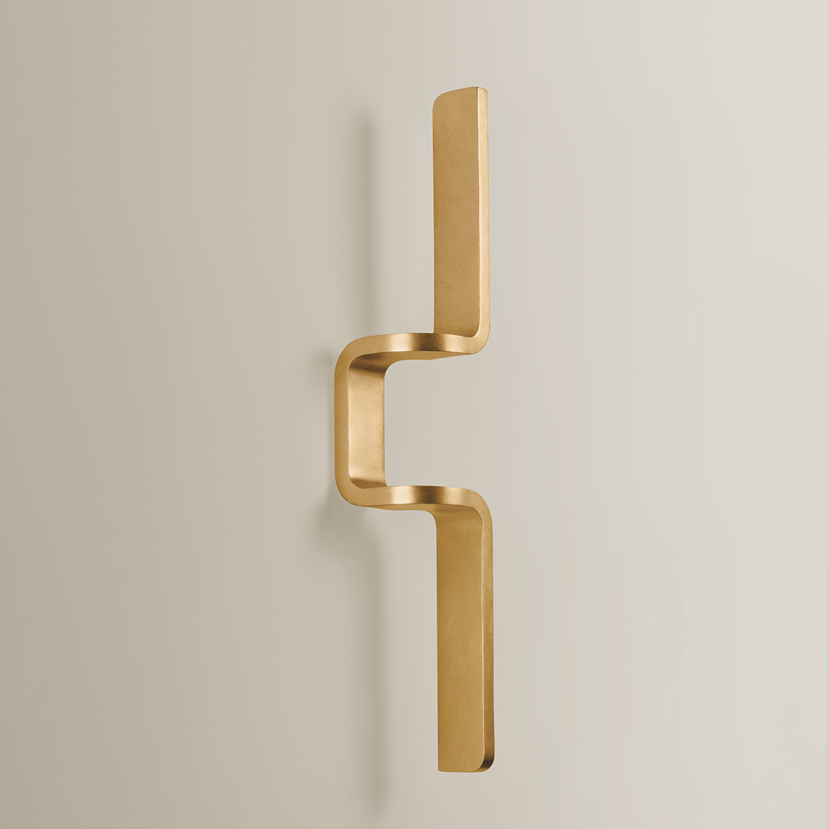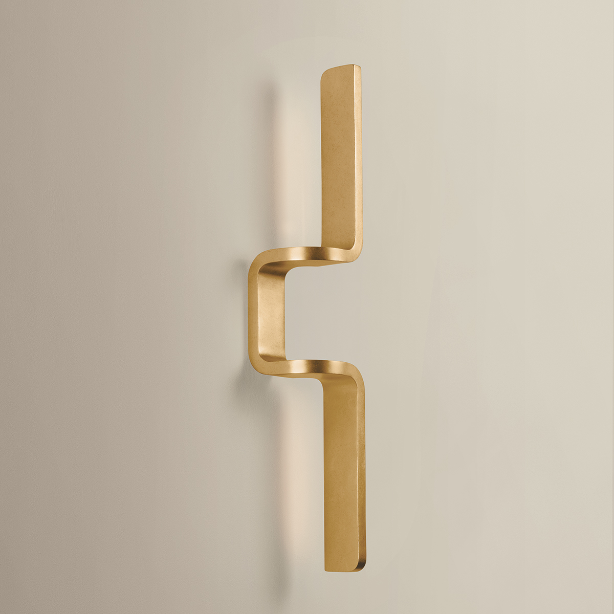 Otherworldly and expressive, the Lazio wall sconce delivers a dramatic wash of light through its serpentine curves. Like a character from an imaginary language, the form makes two fluid, abstract swoops away from the wall. Finished in Vintage Gold Leaf, Lazio can be mounted left, right, or horizontally depending on your preference.