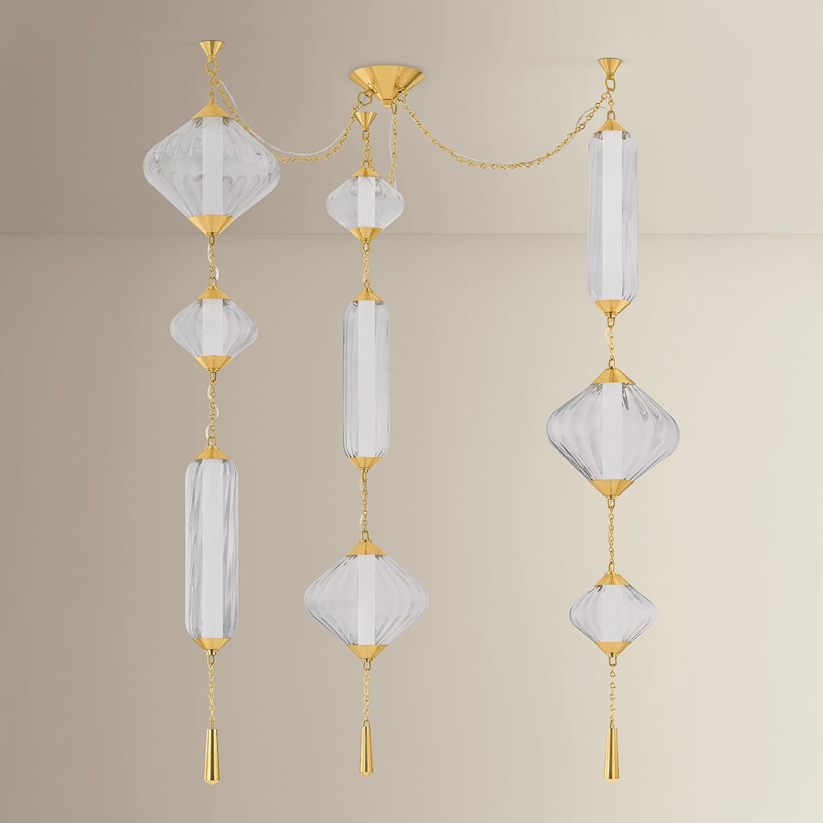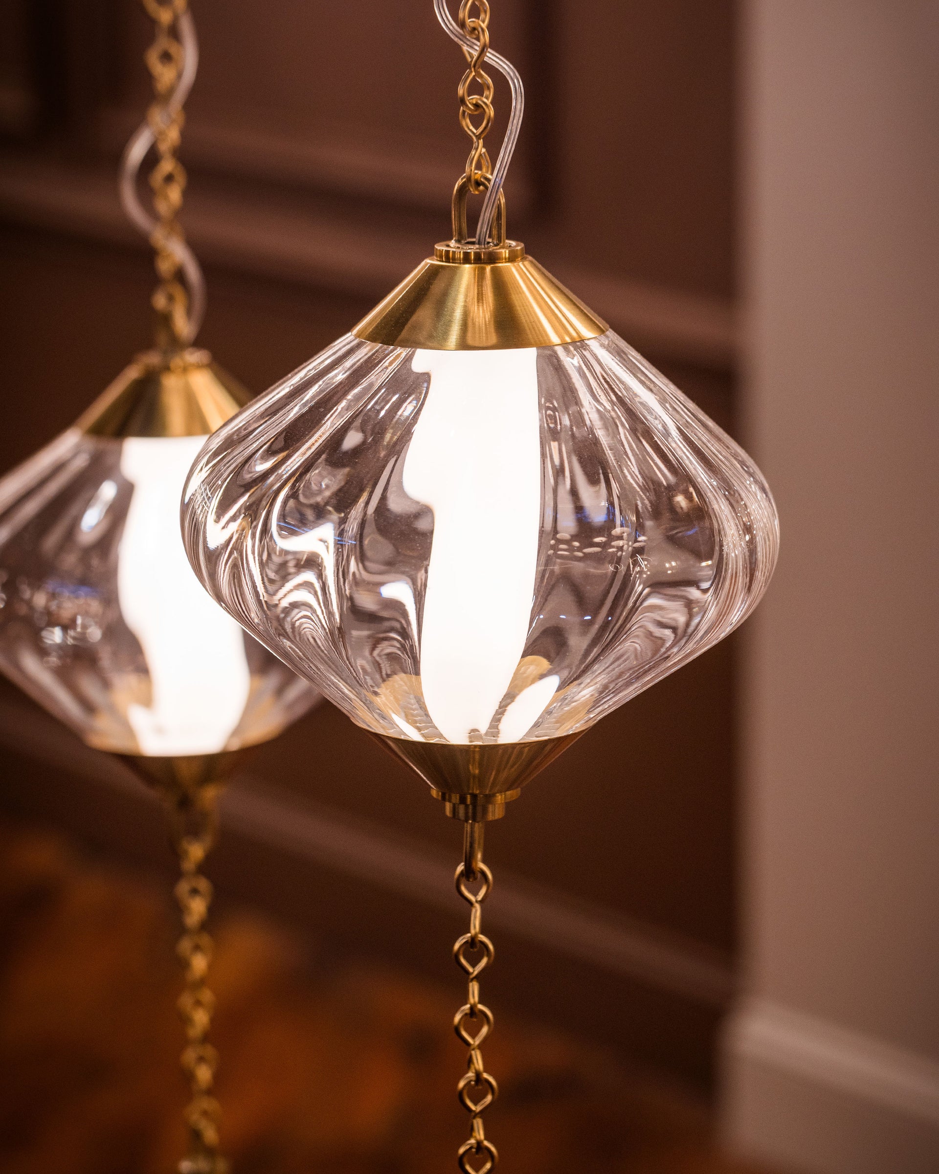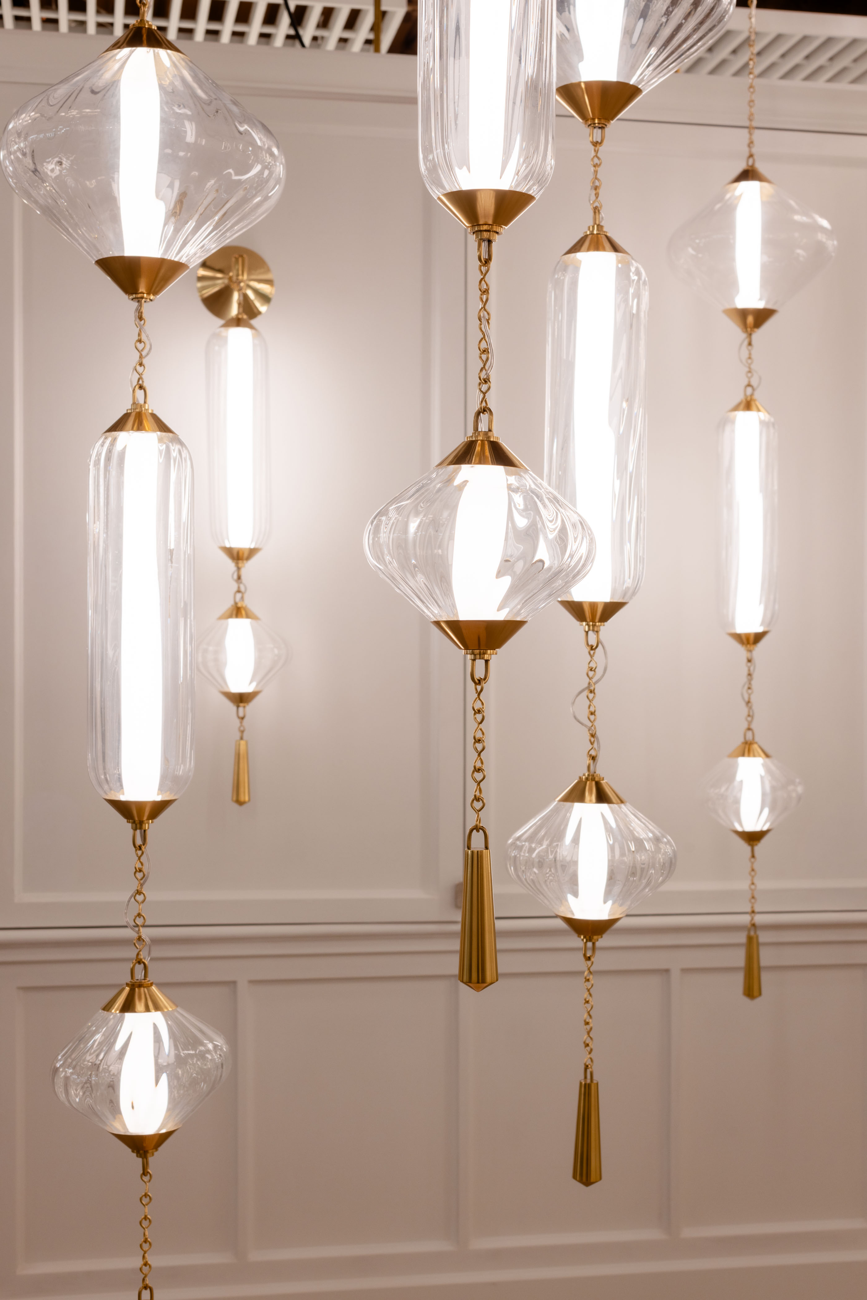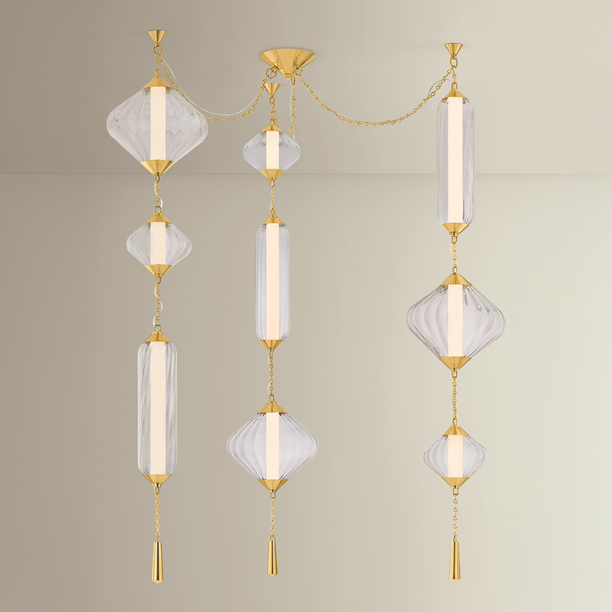 Fiorello’s gracious proportions magnify its impact. Combining geometric shapes, clear ribbed glass, and stylish metal counterweights, this installation-style piece is like jewelry for the home. The Vintage Patina Brass finish on the metalwork enriches the retro shapes, while the LED tubes feel fresh and contemporary. Fiorello is available as a 2-light sconce, a 3-light pendant, and a grand 9-light chandelier that stretches almost from floor to ceiling.