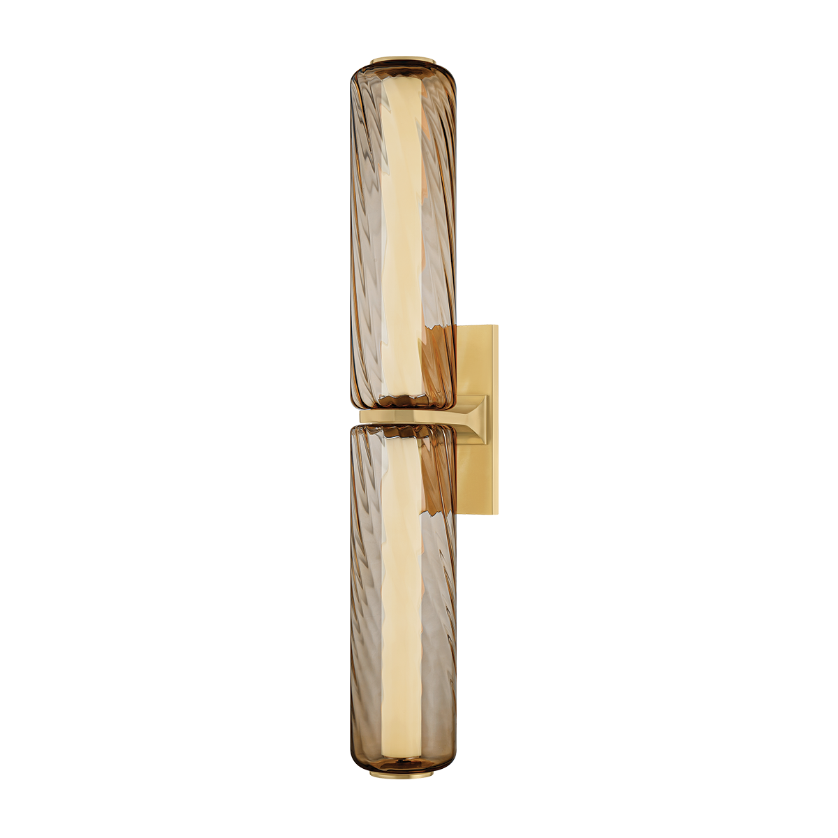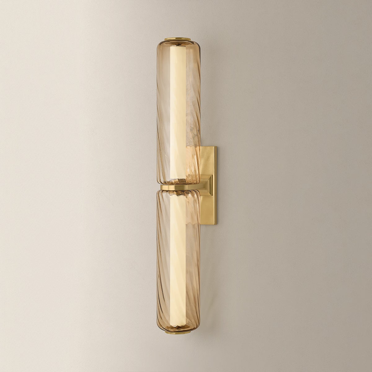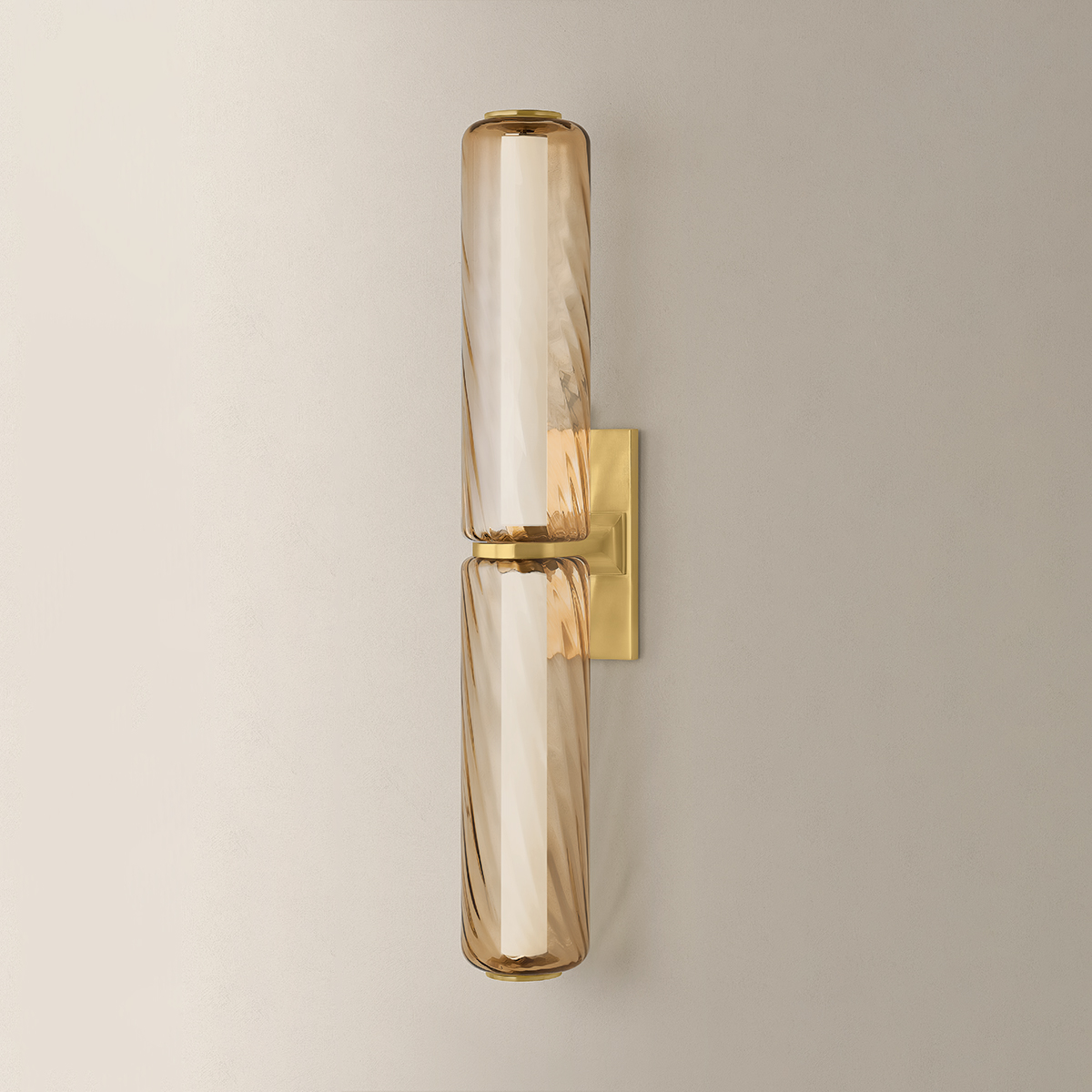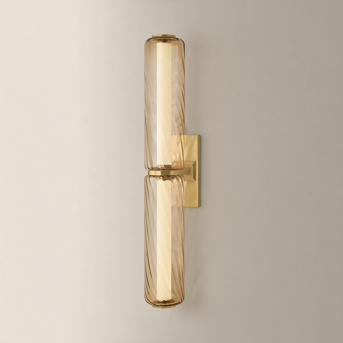 As memorable as the Tuscan sun, this wall sconce is characterized by a slender, elongated silhouette made from eye-catching clear topaz swirl glass. A full-length LED tube illuminates each shade, creating a sense of movement as light diffuses through the twisted glass. A smooth metal band finished in Vintage Brass cinches the center, adding a moment of visual rest to balance the fixture’s maximalist scale. Tuscany transitions beautifully from living spaces to bath and powder rooms.