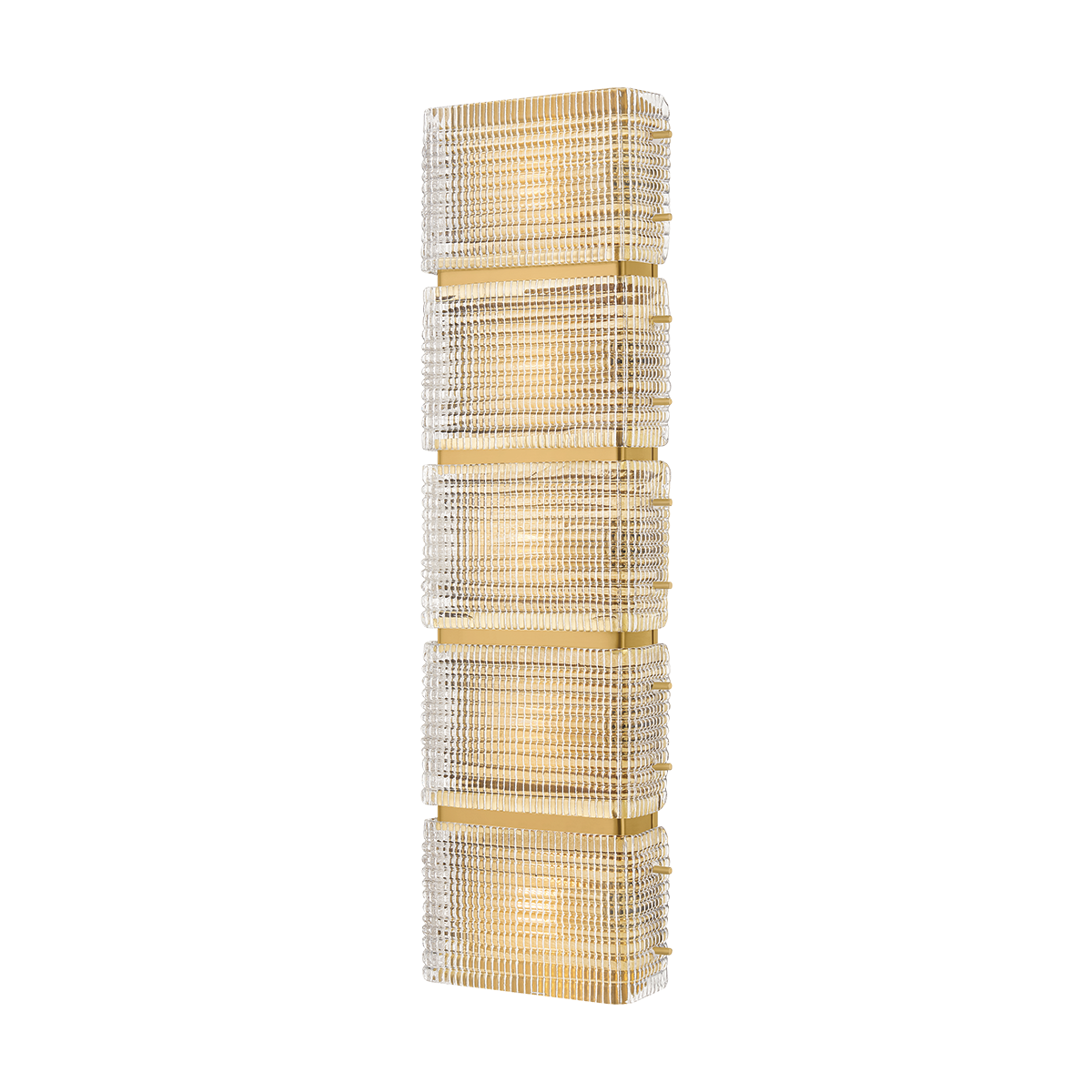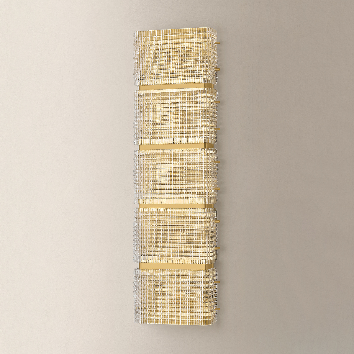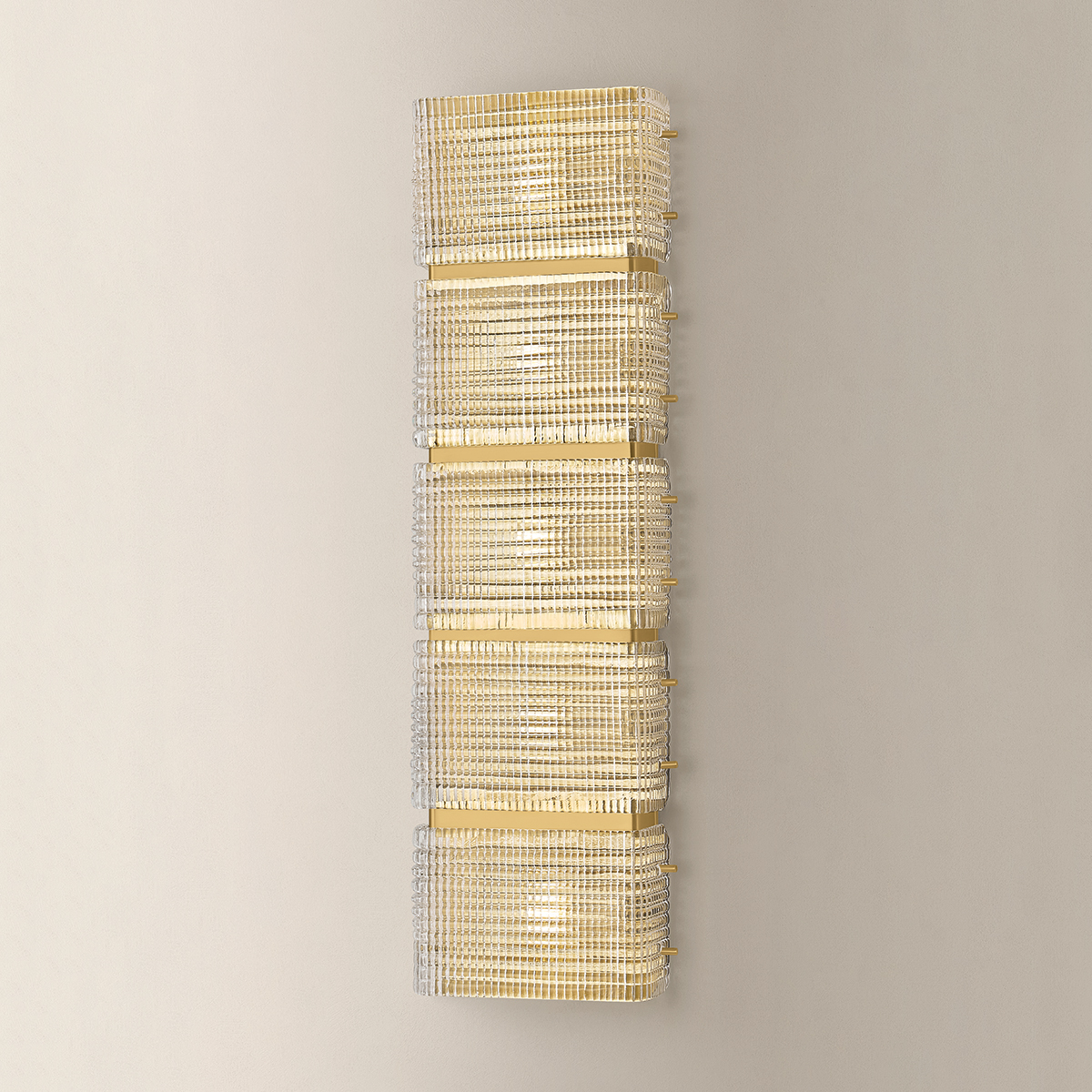 Taking inspiration from retro glass blocks, the Mav sconce puts a contemporary spin on a playful motif. With a shallow profile, the vertically stacked square design is marked by intricate cut crystal details. The highly textured clear piastre glass beautifully reflects and refracts light, creating a striking visual effect when lit. Mav is available with 3 or 5 lights to make a statement in modern interiors.