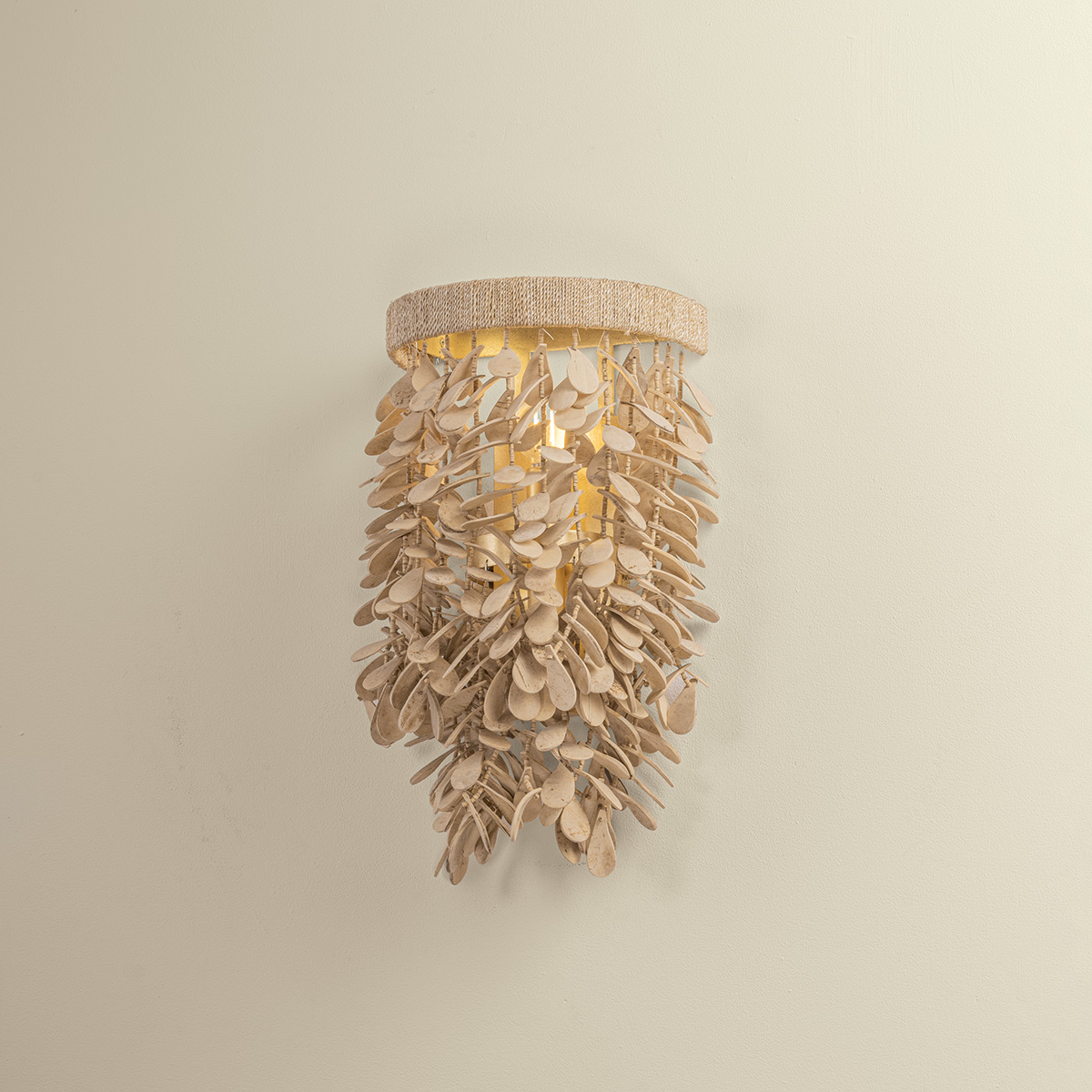 An ode to craftsmanship, the Naxos family is adorned with loosely draped strands of hand-carved coco shell pieces. The layering of smaller shell elements on each strand adds depth and volume, giving this family a sense of movement and a handcrafted beauty. Shaped like petals, the tonal pieces bring life to each design, including a 2-light wall sconce, a chandelier in three sizes, and an island light.