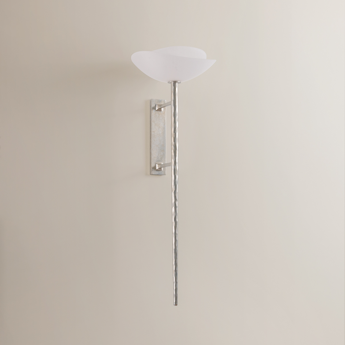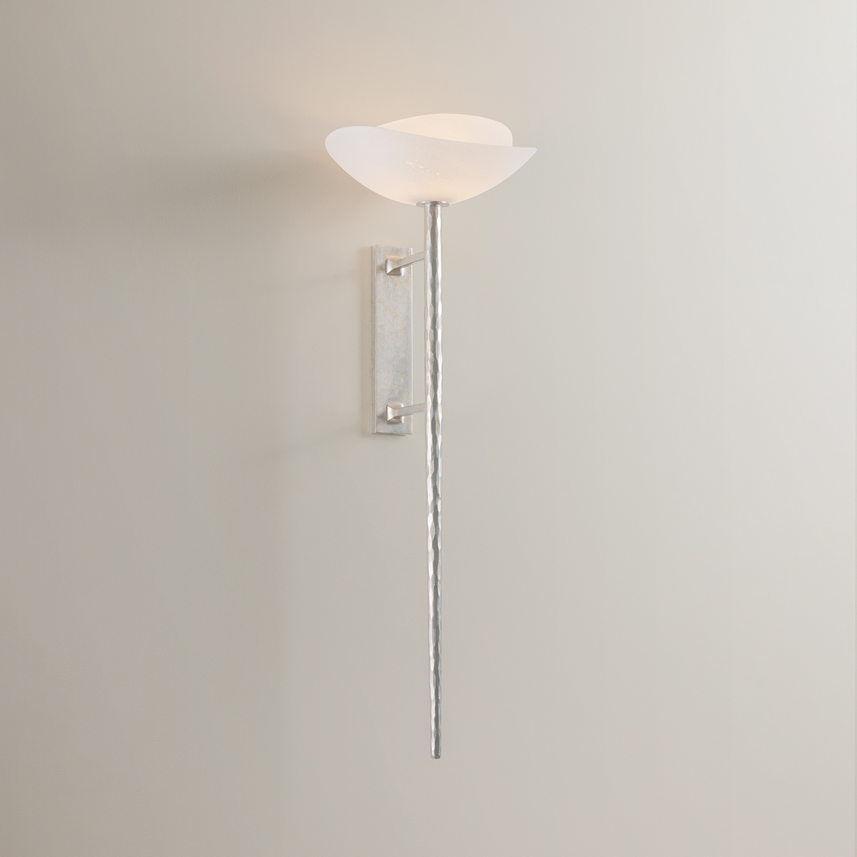 Coppa is a quiet study in the layering of light. A softly domed, concentric matte cloud seedy glass shade recalls the shape of a blooming flower, casting a gentle uplight that feels both dimensional and refined. Its elongated, textured brass stem—finished in either Vintage Gold Leaf or Warm Silver Leaf—spans 33.25 inches, bringing graceful drama and a touch of tailored elegance to the wall. Coppa delivers a luminous glow that’s at once structured and soft—sculptural and undeniably romantic.