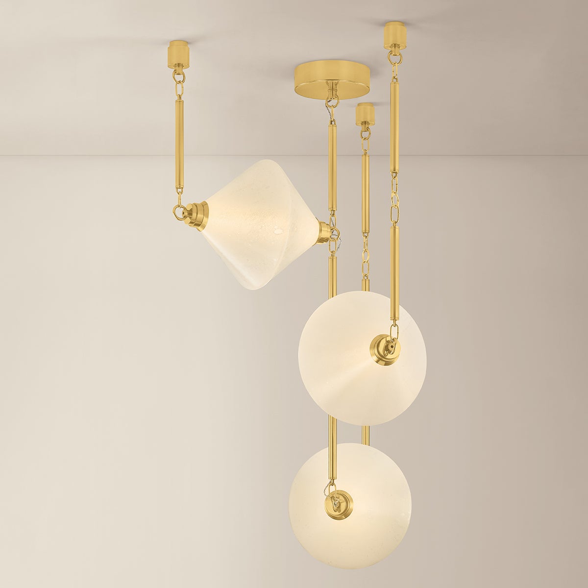 Solara captures the quiet poetry of a solar system in motion; celestial, geometric, and gently luminous. Inspired by constellations, each cloud seedy glass shade glows like a radiant star, suspended in orbit by slender rods finished in Vintage Patina Brass. The 3- and 5-light chandeliers feature diamond-shaped shades that create dimensionality from every perspective, while the single-light pendant drops like a sculptural earring. The result is lighting that feels both architectural and romantic. They are designed not just to illuminate, but to bring a sense of wonder to the everyday.