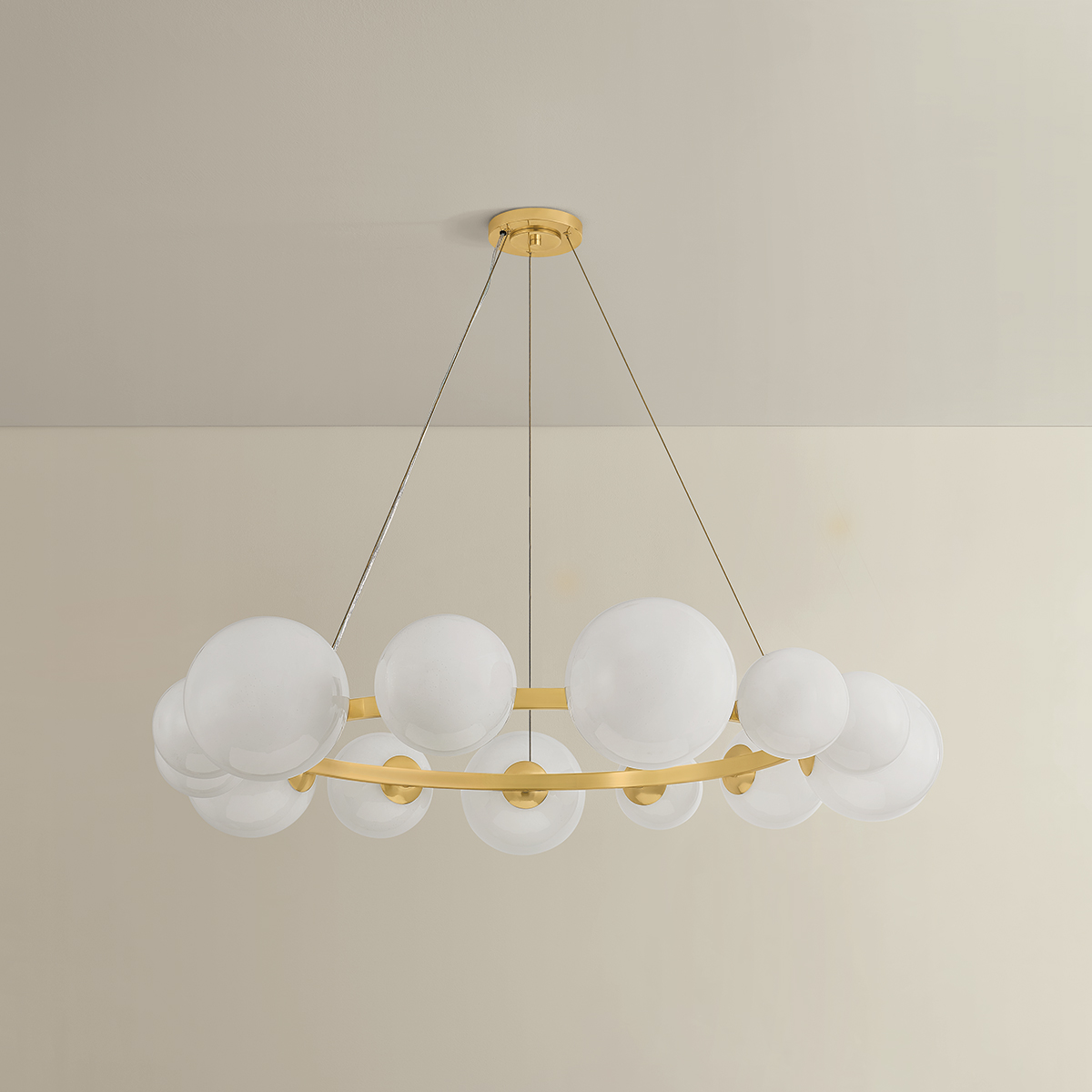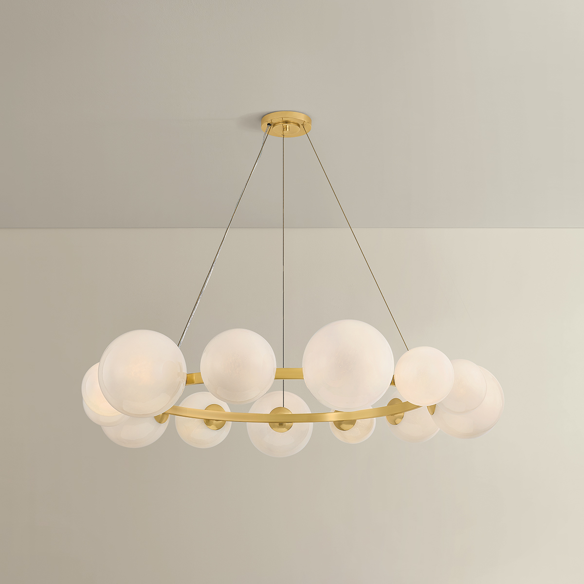 A study in lightness, the Pacama chandelier showcases celestial cloud seedy glass globes of various sizes arranged artfully along a metal ring. The soft, textured glass diffuses an atmospheric glow that is complemented by the Aged Brass-finished metalwork. With 11 or 13 lights, this grand design brings an effervescent energy to contemporary spaces.