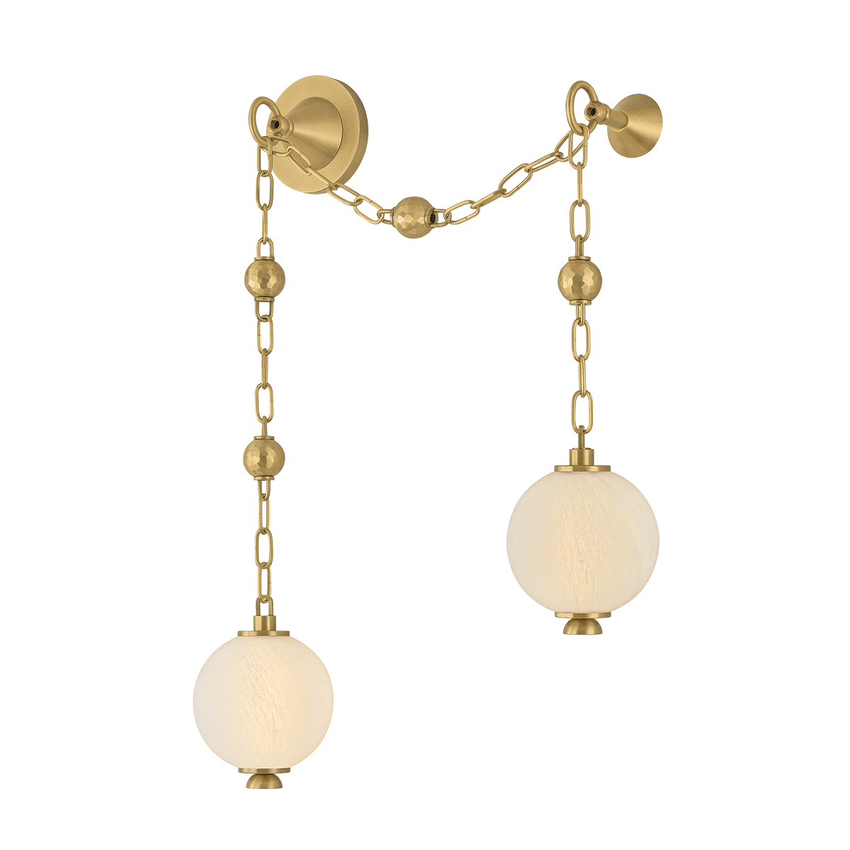 Corda draws inspiration from the elegance of heirloom jewelry—where light becomes adornment, and structure tells a story. Hand-blown matte cloud glass spheres are suspended from gleaming Vintage Brass chains, accented by delicate ball chain details, evoking the richness of layered pearl and charm necklaces. Available as a 2-light sconce, a 6-light linear, and a dramatic 12-light chandelier, Corda’s layered suspension system allows for customizable hanging methods, introducing an unexpected sense of movement and personalization. It brings a sense of intimacy and ornament to a space, casting a warm, glamorous glow that is both delicate and intentional.