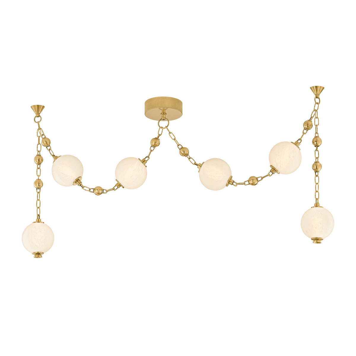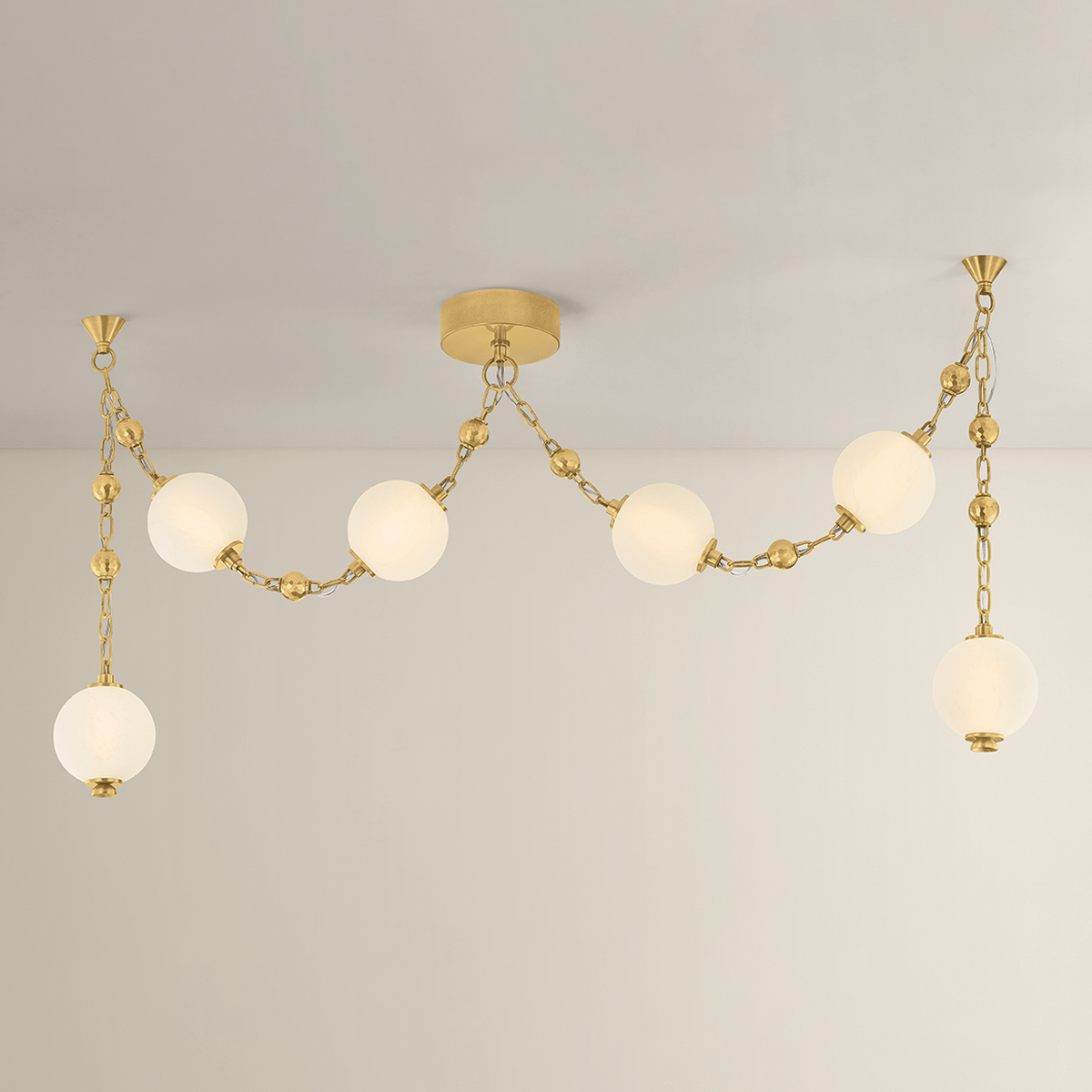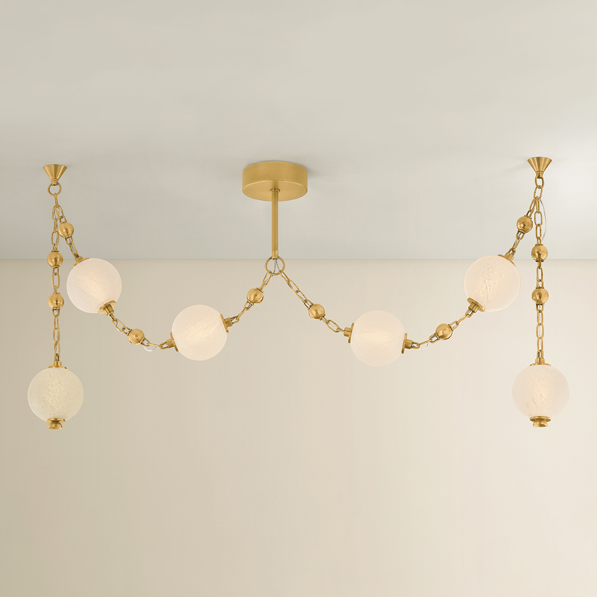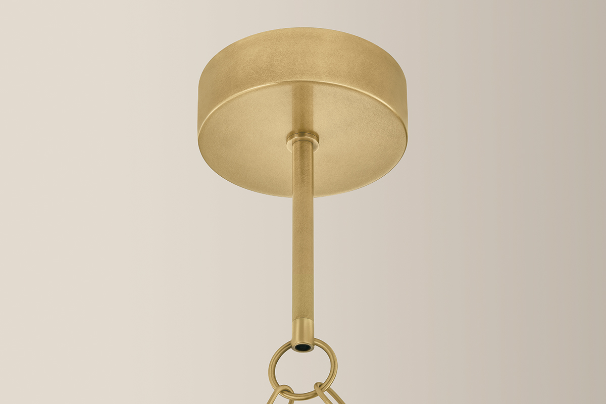 Corda draws inspiration from the elegance of heirloom jewelry—where light becomes adornment, and structure tells a story. Hand-blown matte cloud glass spheres are suspended from gleaming Vintage Brass chains, accented by delicate ball chain details, evoking the richness of layered pearl and charm necklaces. Available as a 2-light sconce, a 6-light linear, and a dramatic 12-light chandelier, Corda’s layered suspension system allows for customizable hanging methods, introducing an unexpected sense of movement and personalization. It brings a sense of intimacy and ornament to a space, casting a warm, glamorous glow that is both delicate and intentional.