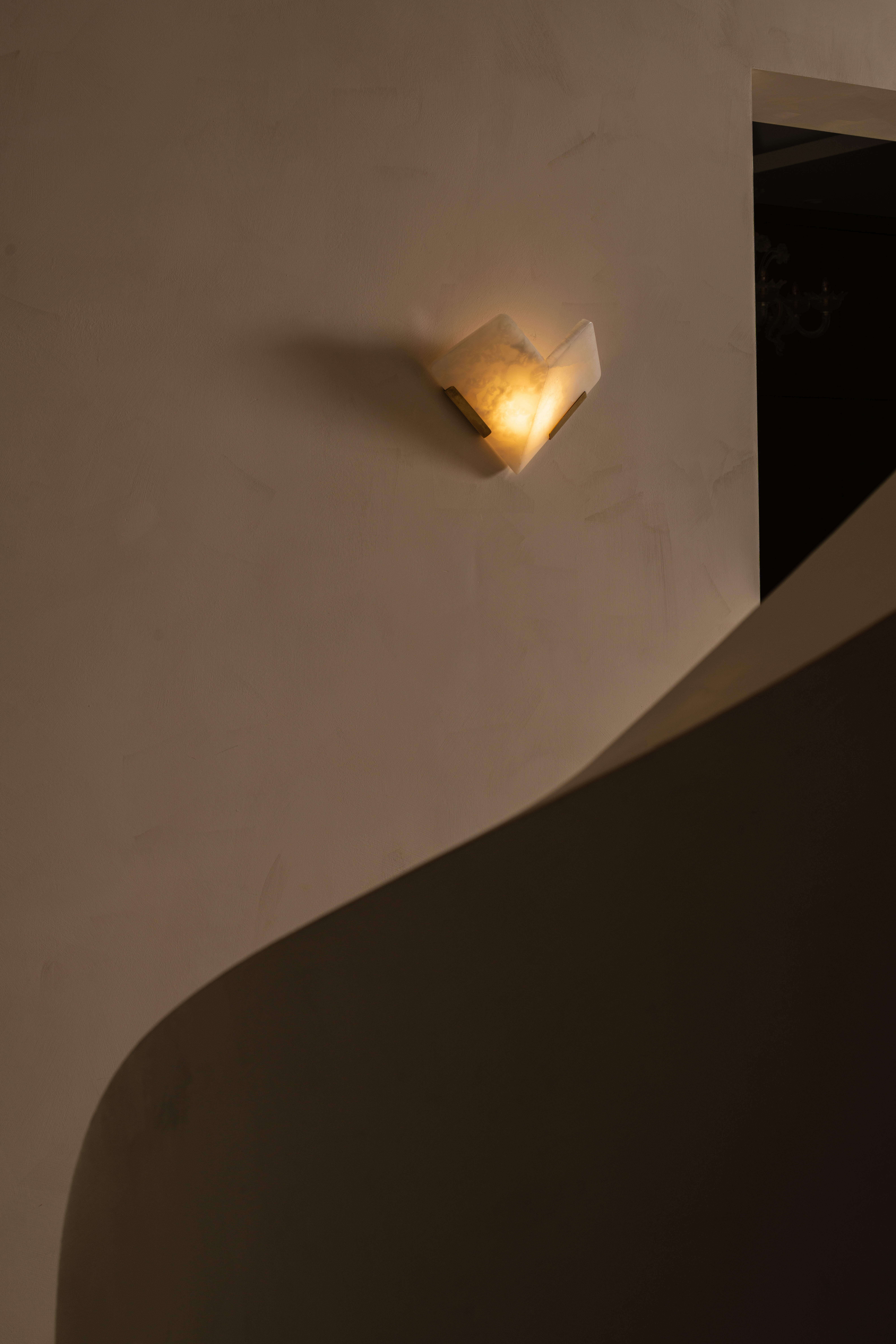Geo is defined by its quiet strength and sculptural clarity. Glowing panels of honey onyx are book matched to reveal mirrored veining—an artisanal detail more often seen in luxury surfaces than lighting. The symmetry of the stone takes center stage, framed by clean, minimal metalwork in Vintage Brass that amplifies its natural elegance. Available as a 1-light wall sconce in two shapes and sizes, as well as a 1-light flush mount, Geo offers a soft, grounded glow that feels both bold and restrained. Its graphic silhouette and elemental beauty lend structure and visual rhythm to interiors.