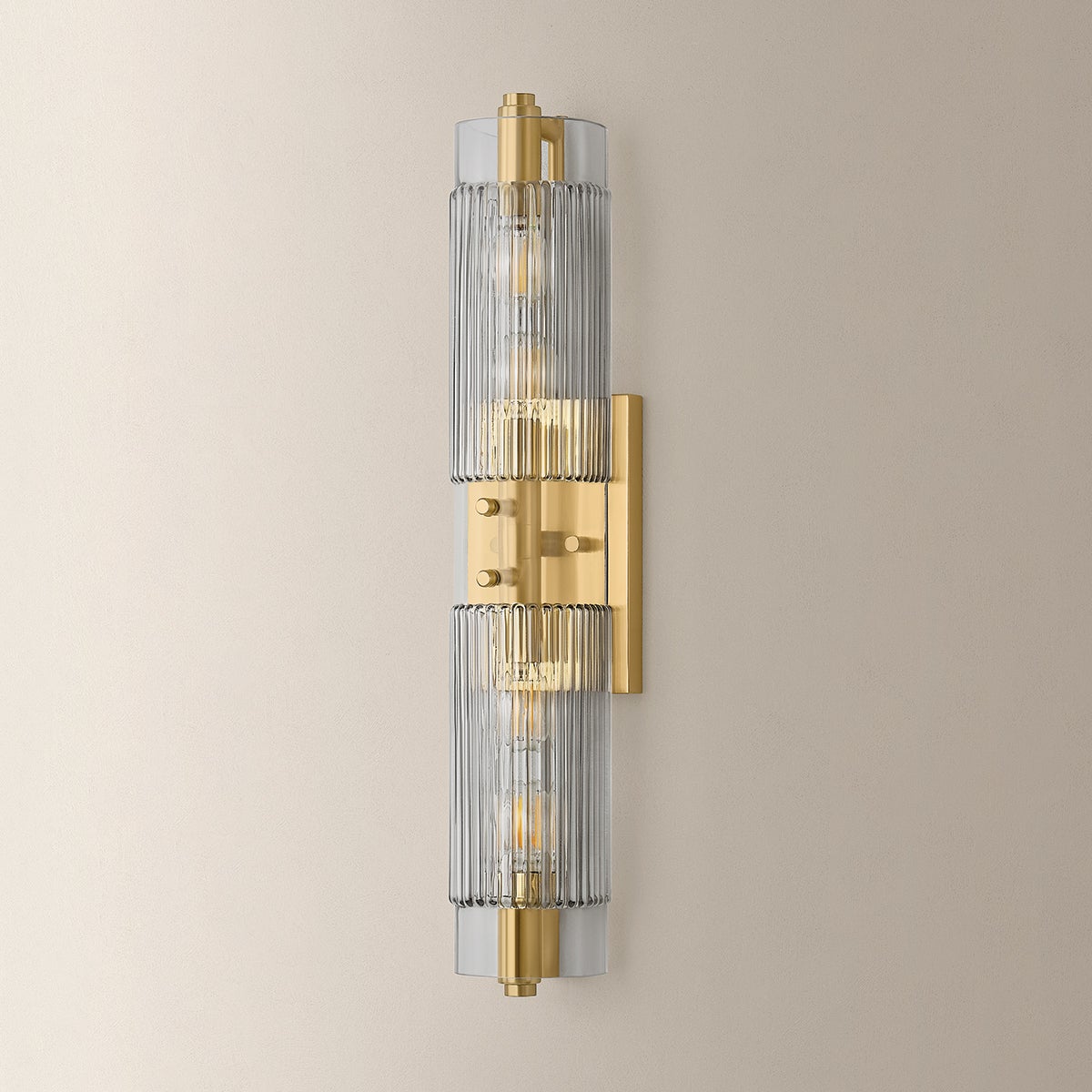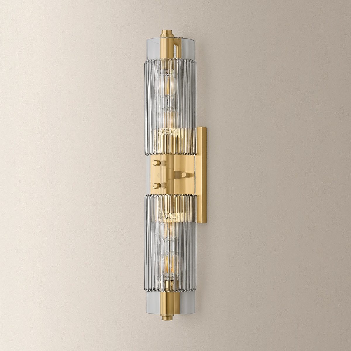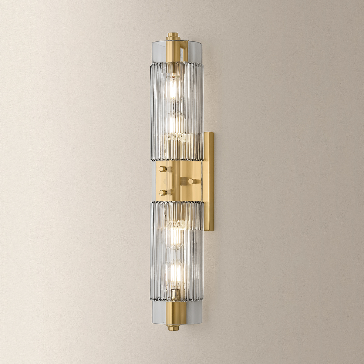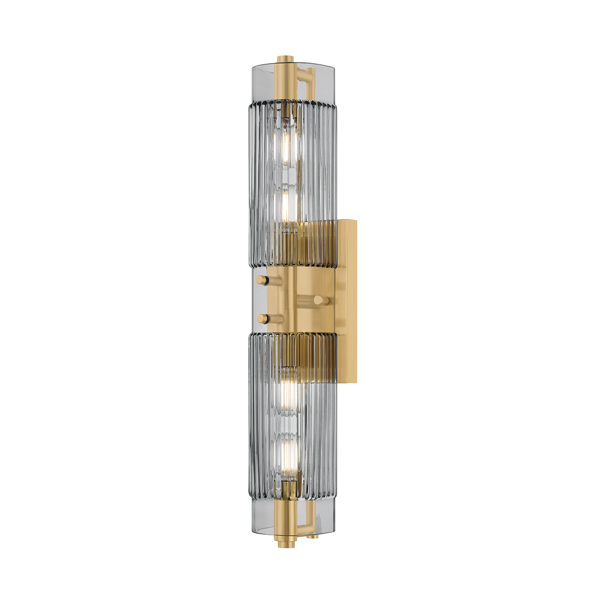 The Duoro sconce is composed of totemic sections that make a shimmering sculptural statement on the wall. As light diffuses through the clear smoked piastre glass, the shades cast a warm glow that softens the edges of your relaxation space. A vintage brass frame glows gently within, providing an antique touch. Available with 4 or 6 lights, Duoro is an ambient addition to any bath or vanity.