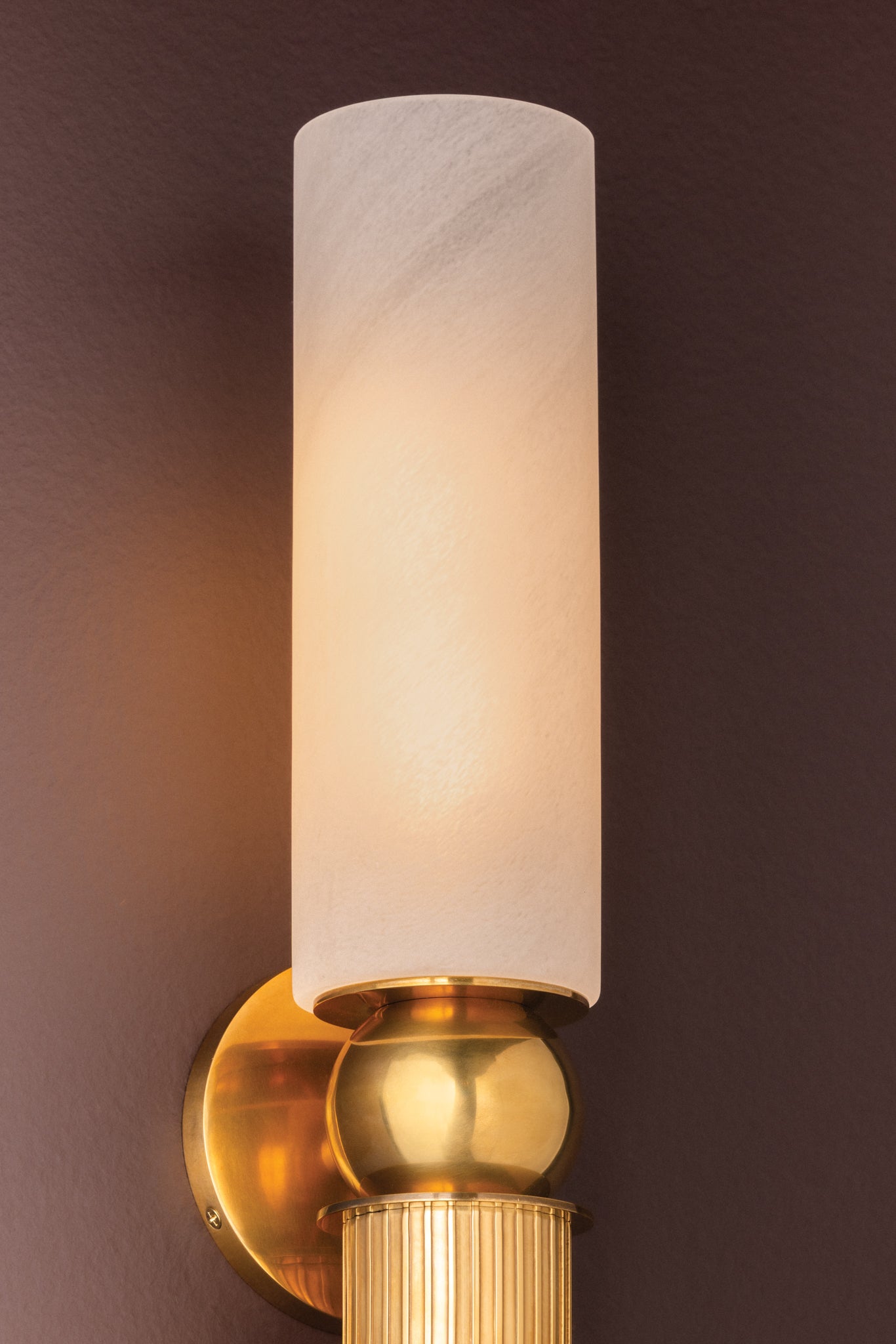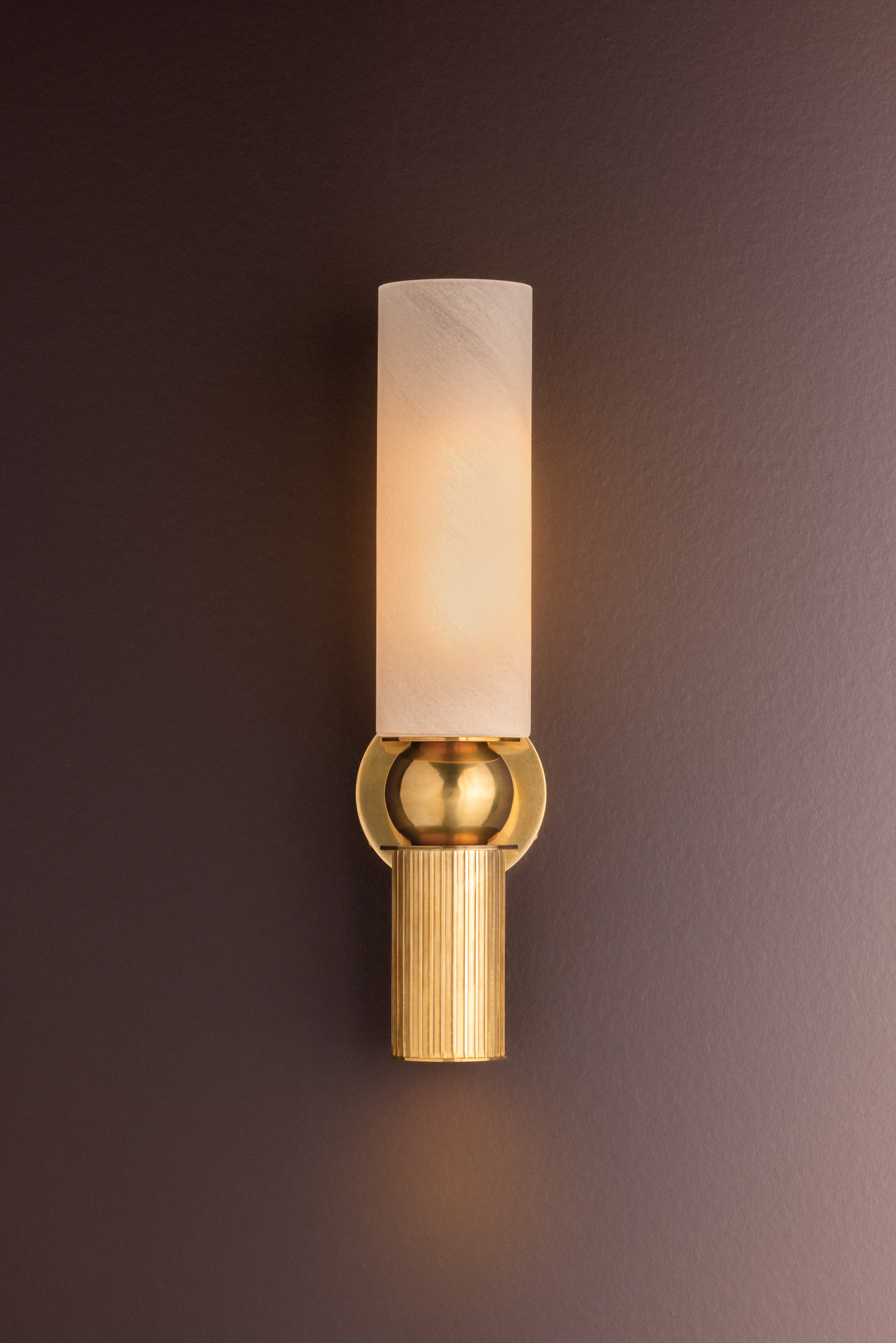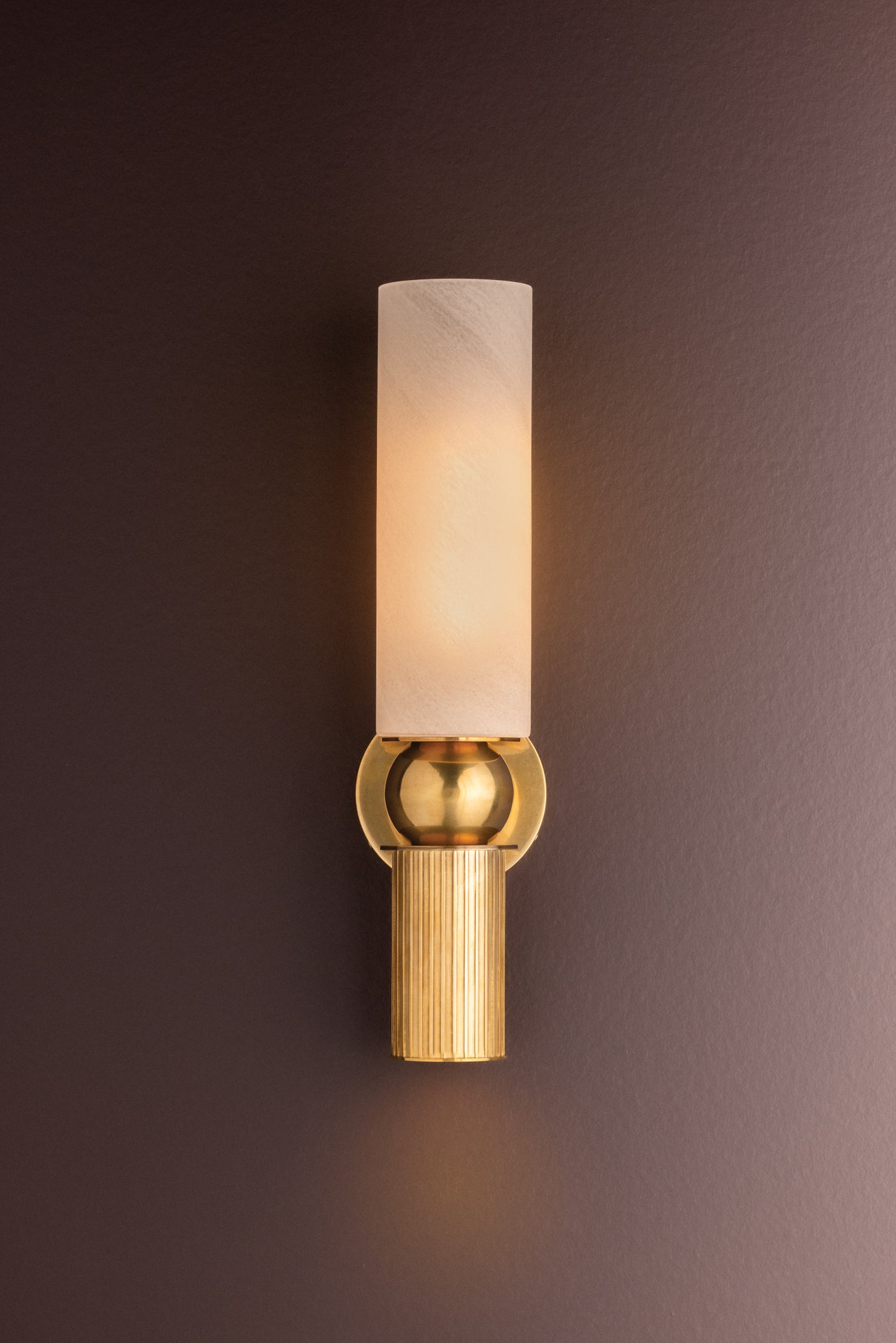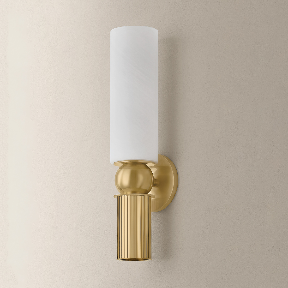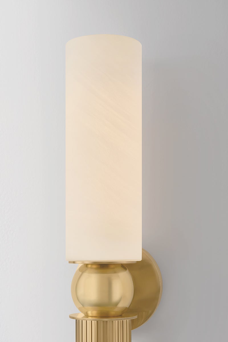 Inspired by classical architecture, the Ronda sconce recalls a Greek column with soft curves and uniform fluting. A matte cloud glass shade diffuses ambient light above, while a hidden light source within the metal cylinder casts a focused glow below. To complement the antique aesthetic, Ronda is finished in Vintage Brass.