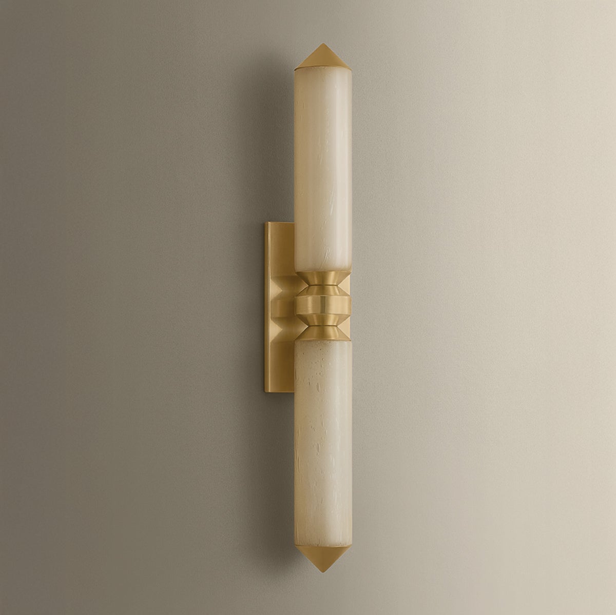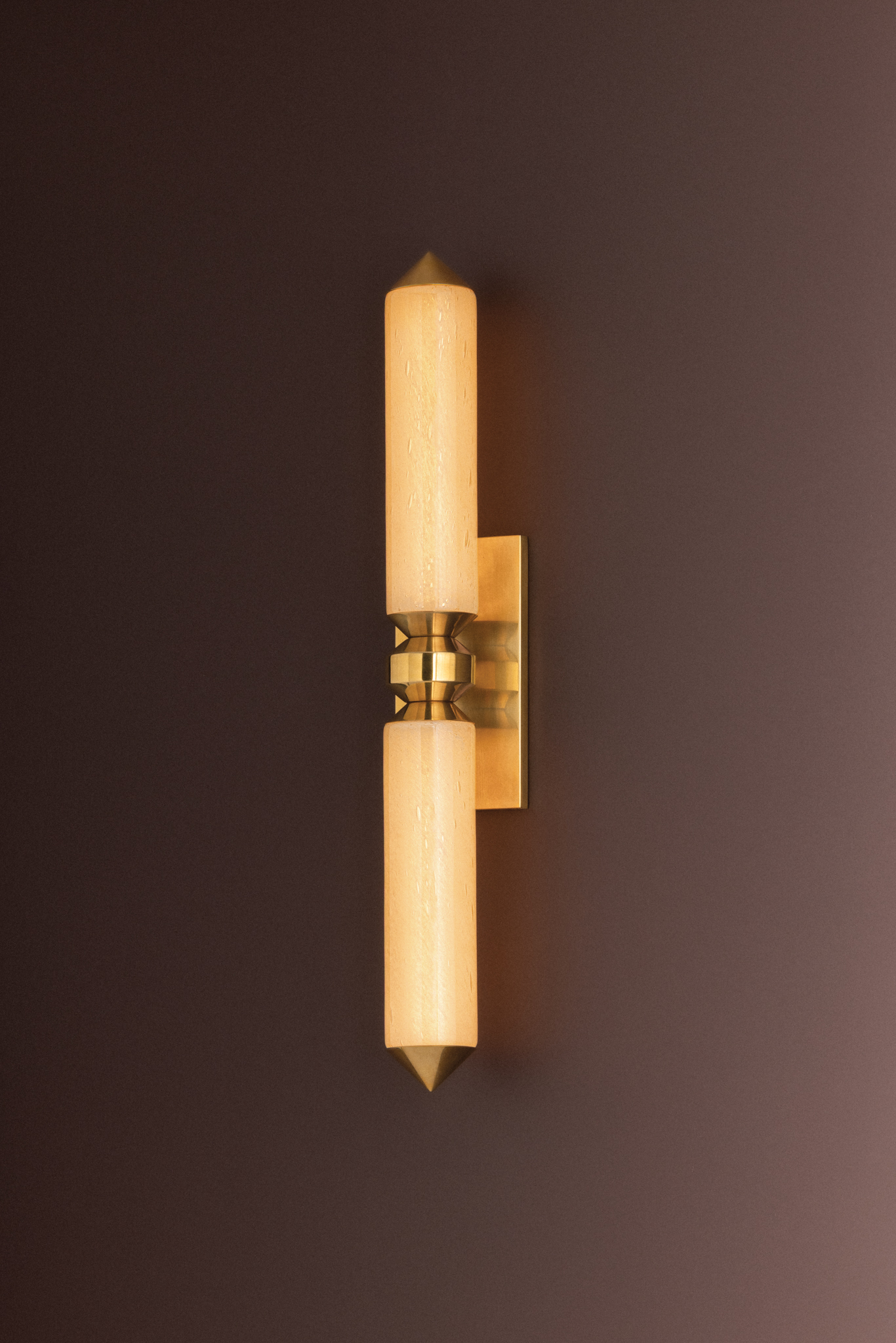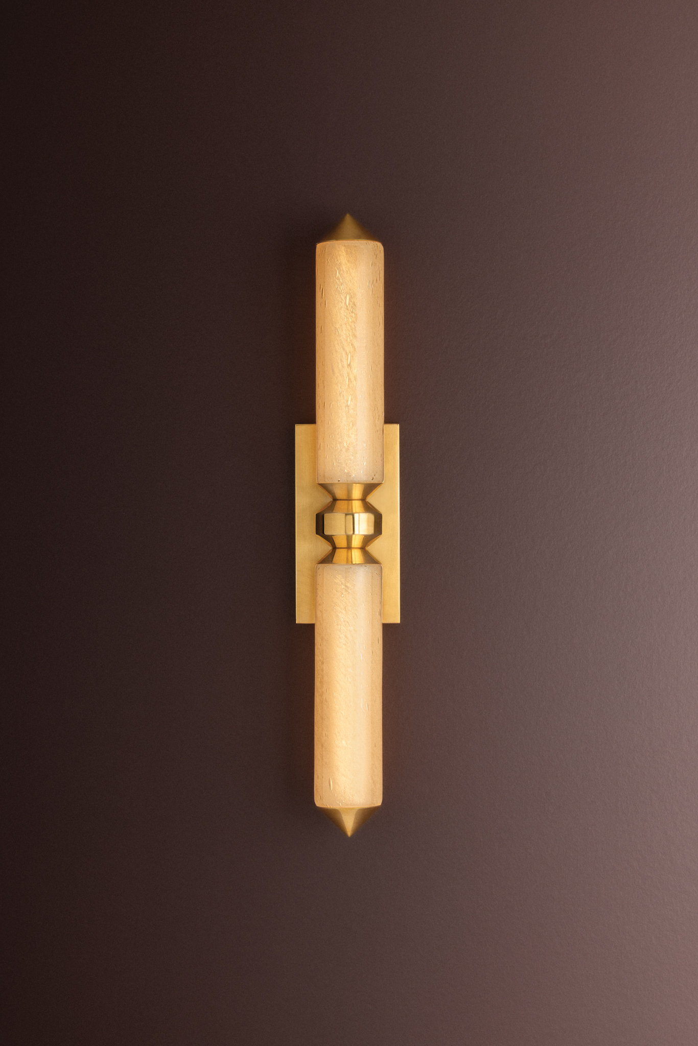 The Hydra family draws inspiration from the architectural precision of scaffolding, translating structural geometry into a bold lighting moment. Angular arms intersect, while conical cloud seedy champagne glass shades diffuse light in a multidirectional output. Finished in Vintage Brass, Hydra is available as a 2-light wall sconce, a 10-light linear, and a 12-light chandelier.