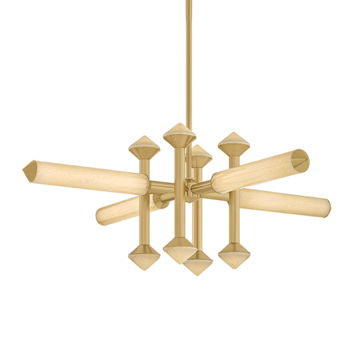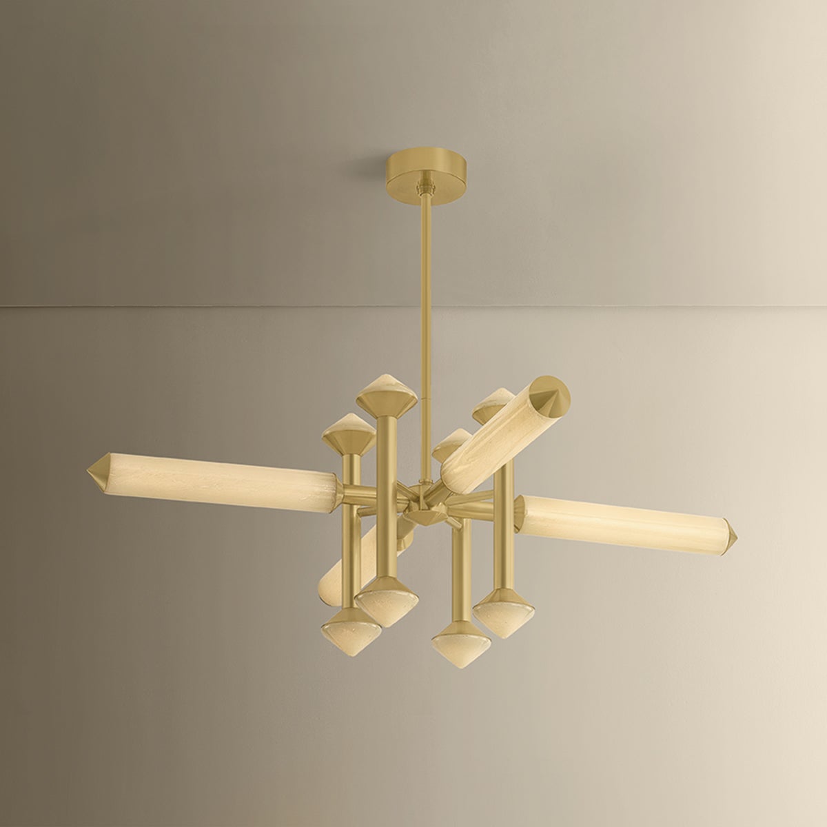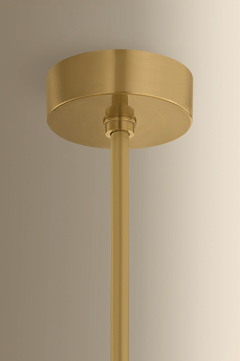 The Hydra family draws inspiration from the architectural precision of scaffolding, translating structural geometry into a bold lighting moment. Angular arms intersect, while conical cloud seedy champagne glass shades diffuse light in a multidirectional output. Finished in Vintage Brass, Hydra is available as a 2-light wall sconce, a 10-light linear, and a 12-light chandelier.