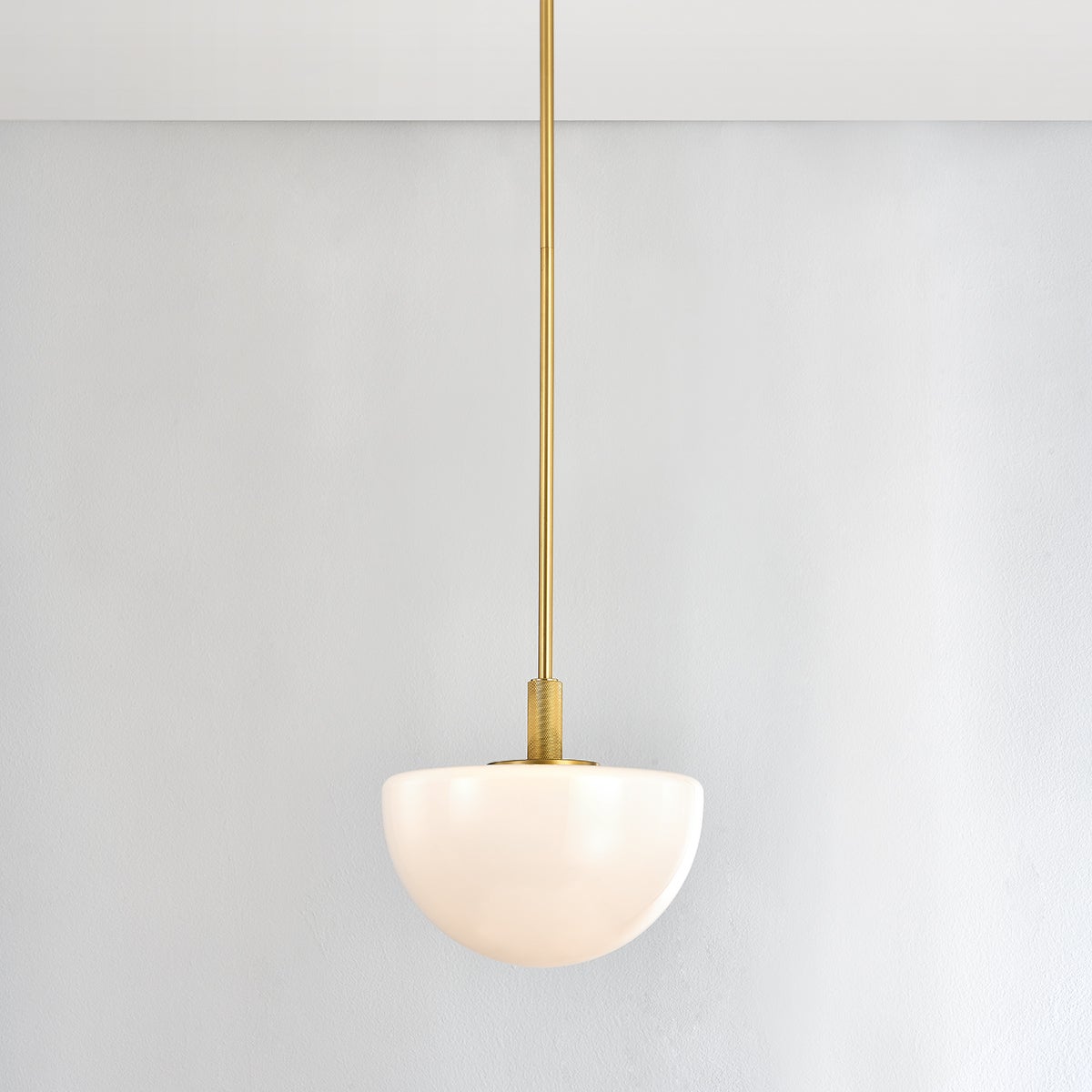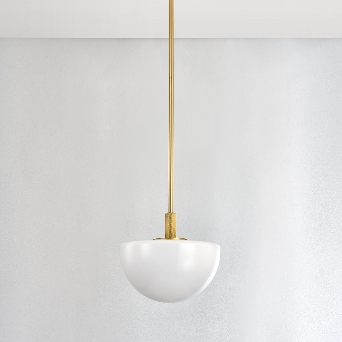 A half-round opal glossy glass shade with knurled metal details and a simple domed canopy give Lethbridge a modern industrial aesthetic. Available in three sizes and three classic finishes, this versatile pendant can work in various design styles.