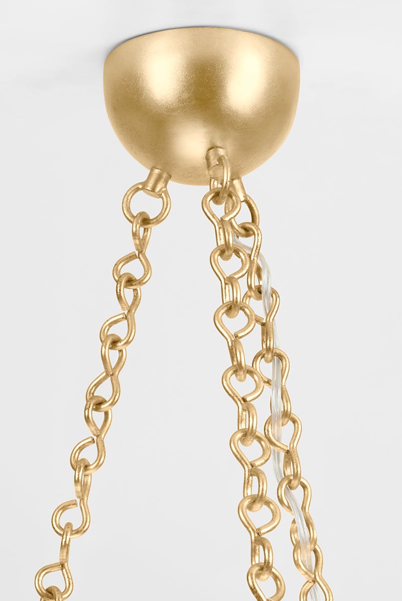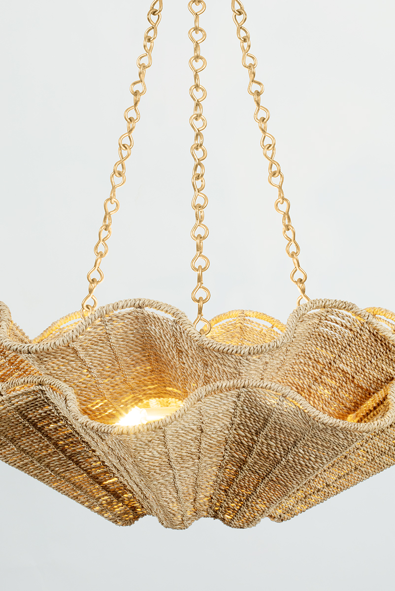 Recalling the silhouette of a clamshell, Hayworth puts an artisanal spin on coastal design. Two large shades woven from neutral-hued Abaca Rope embody lightness, while the Vintage Gold Leaf chain provides a point of contrast, lending sleekness to the design. The opening at the bottom of the shade creates a concentrated beam that illuminates large areas.