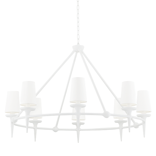 Torch passes new life into traditional shapes, like a wagon-wheel chandelier, cage pendant and recognizable sconce and linear forms. The sleek, sculptural arms make it easy to see how Torch got its name. The white plaster provides a monochromatic matte finish with the Belgian linen shades while the gold leaf adds a bit of shine that complements the white shades.