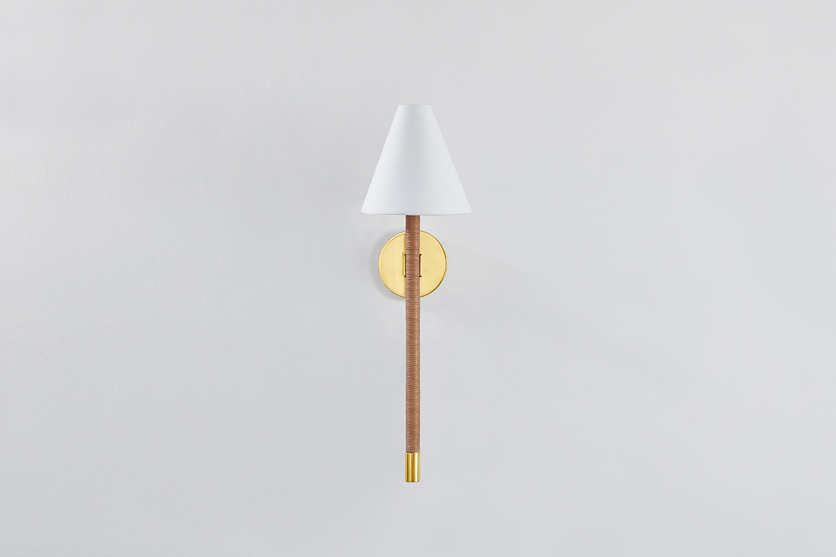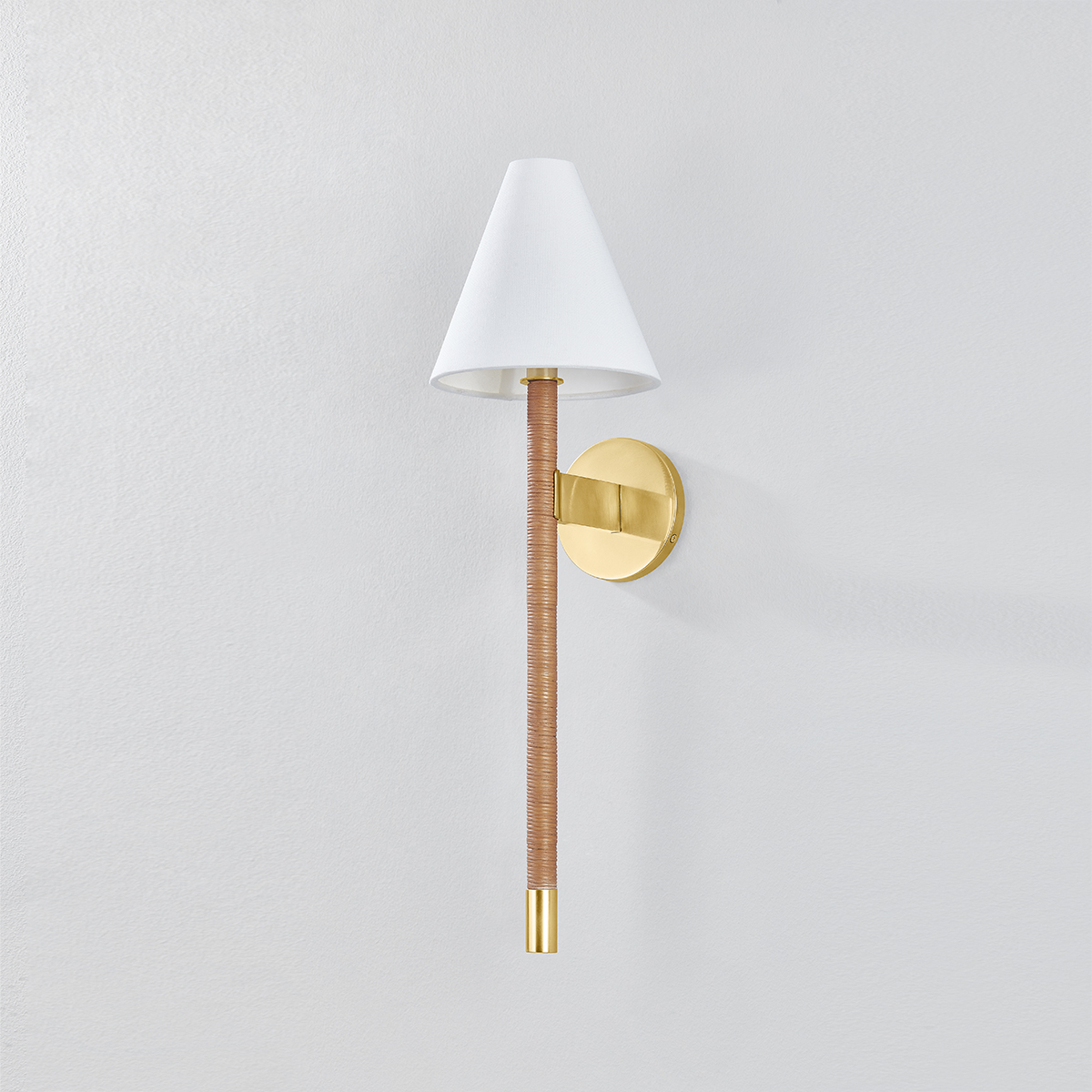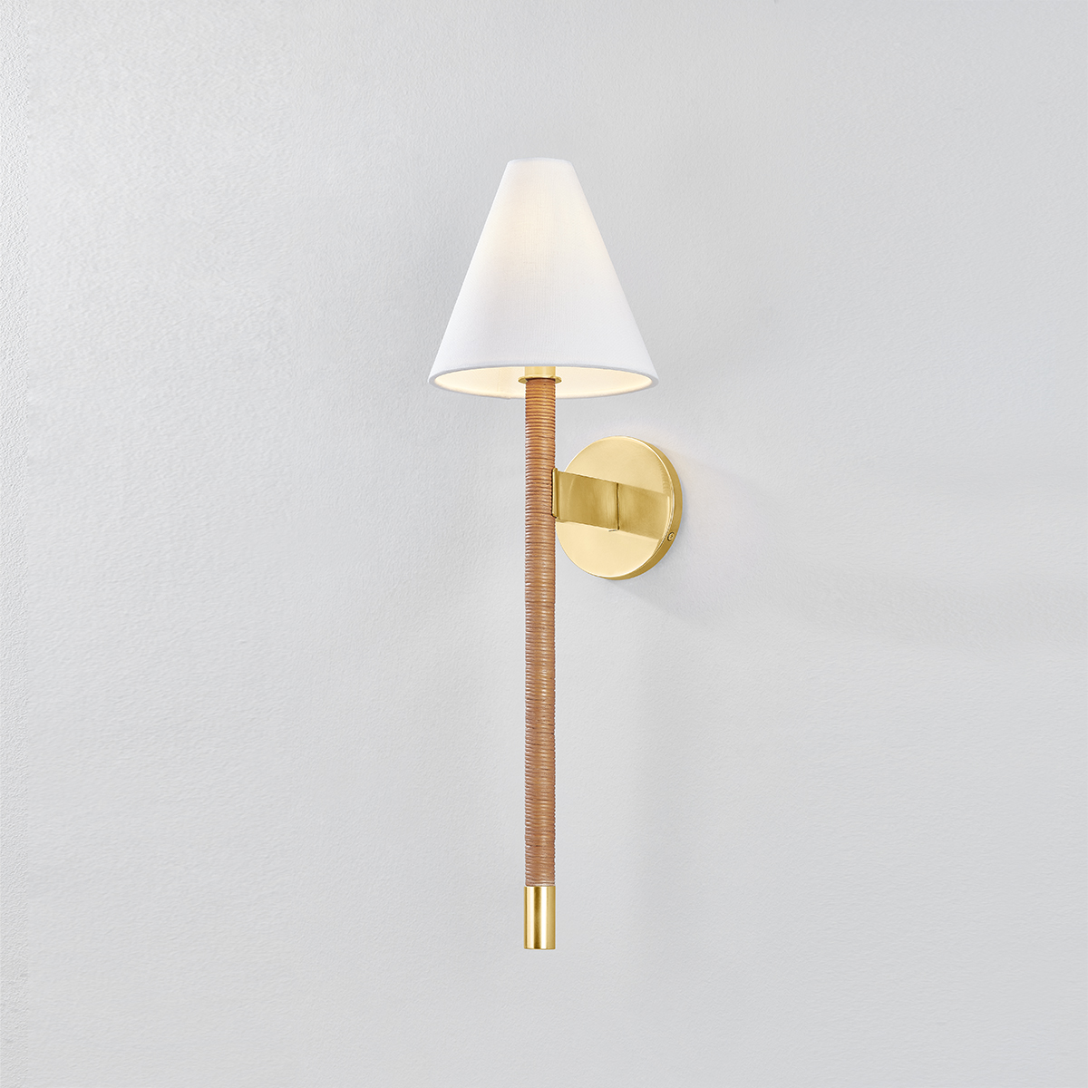Inspired by vintage wicker chairs, Watkins celebrates the natural beauty of rattan. As light washes from the shade onto the stem, it highlights the intricate braided detail and earthy hue of the material. The subtle grain on the petite linen shade adds to the organic appeal of this sconce. Finishing on a luxurious note, the backplate and stem cap are finished in Aged Brass.