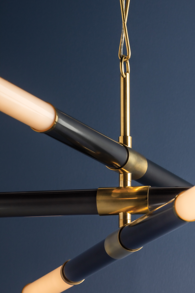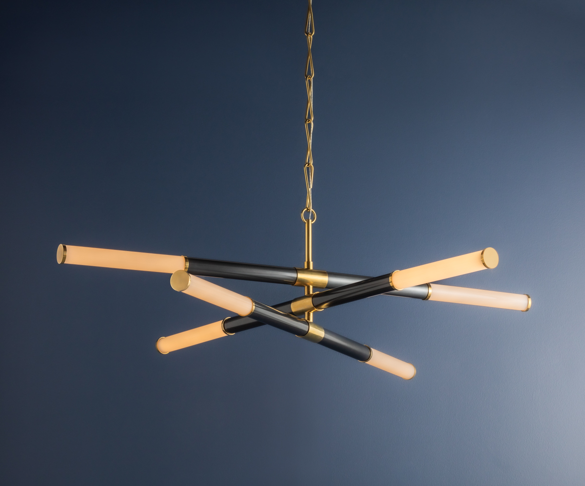 Huntington is linear lighting at its best. Milk glass tubes capped in metal sprout from each end of a similarly capped soft black shade creating a luxe layered look. This streamlined collection has a slender silhouette that works well in any space. Choose from Aged Old Bronze or Polished Nickel finishes with Soft Black accents.