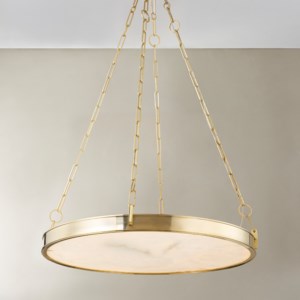 Kirby is a sleek and minimal drum-shaped pendant full of thoughtful detail. The alabaster diffuser is set within a metal frame featuring a subtle stepped edge and a perfectly designed bracket that connects the body to a beautiful paperclip chain link. This chandelier will add understated sophistication to any room.