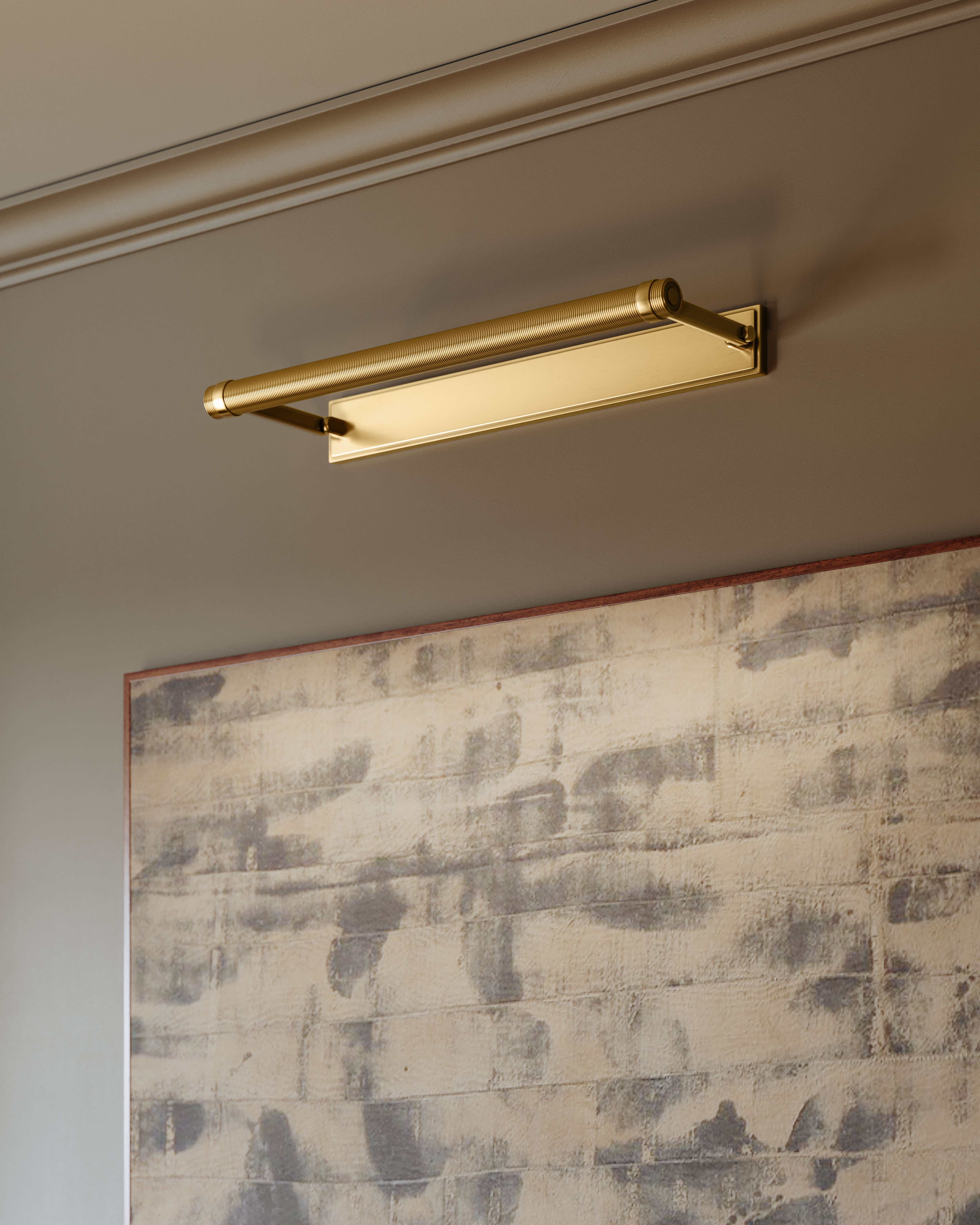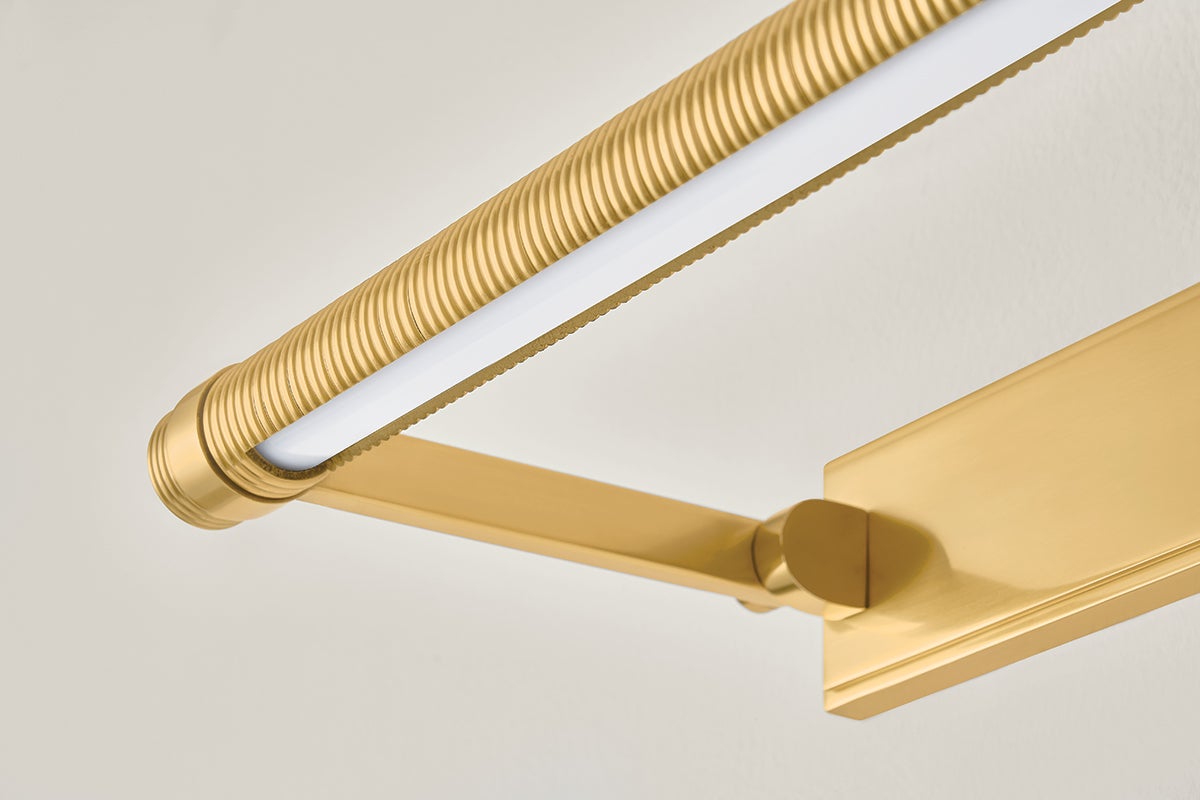 An industrial take on a classic picture light, Duell adds fine knurling to a clean-lined cylindrical shade. While the slender profile and streamlined backplate allow Duell to blend into any space, the oversized brackets and rectangular armbacks introduce architectural interest. Duell is available in three sizes and two finish options: an all-over Aged Brass or Distressed Bronze with Aged Brass accents.