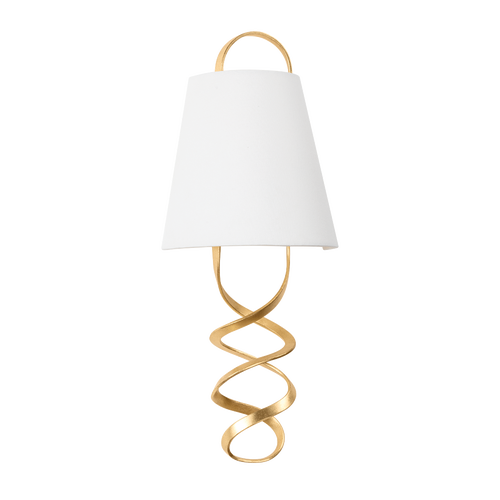 Dota's gorgeous flowing lines are the highlight of this playful yet elegant sconce. Curved metalwork in Vintage Gold Leaf or Warm Silver Leaf twists and swirls in a tranquil loop that draws the eye and creates an open, airy spiral silhouette against the wall. The tapered white linen shade grounds the design and adds a traditional element that makes the piece extremely useable.