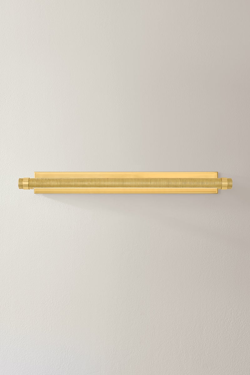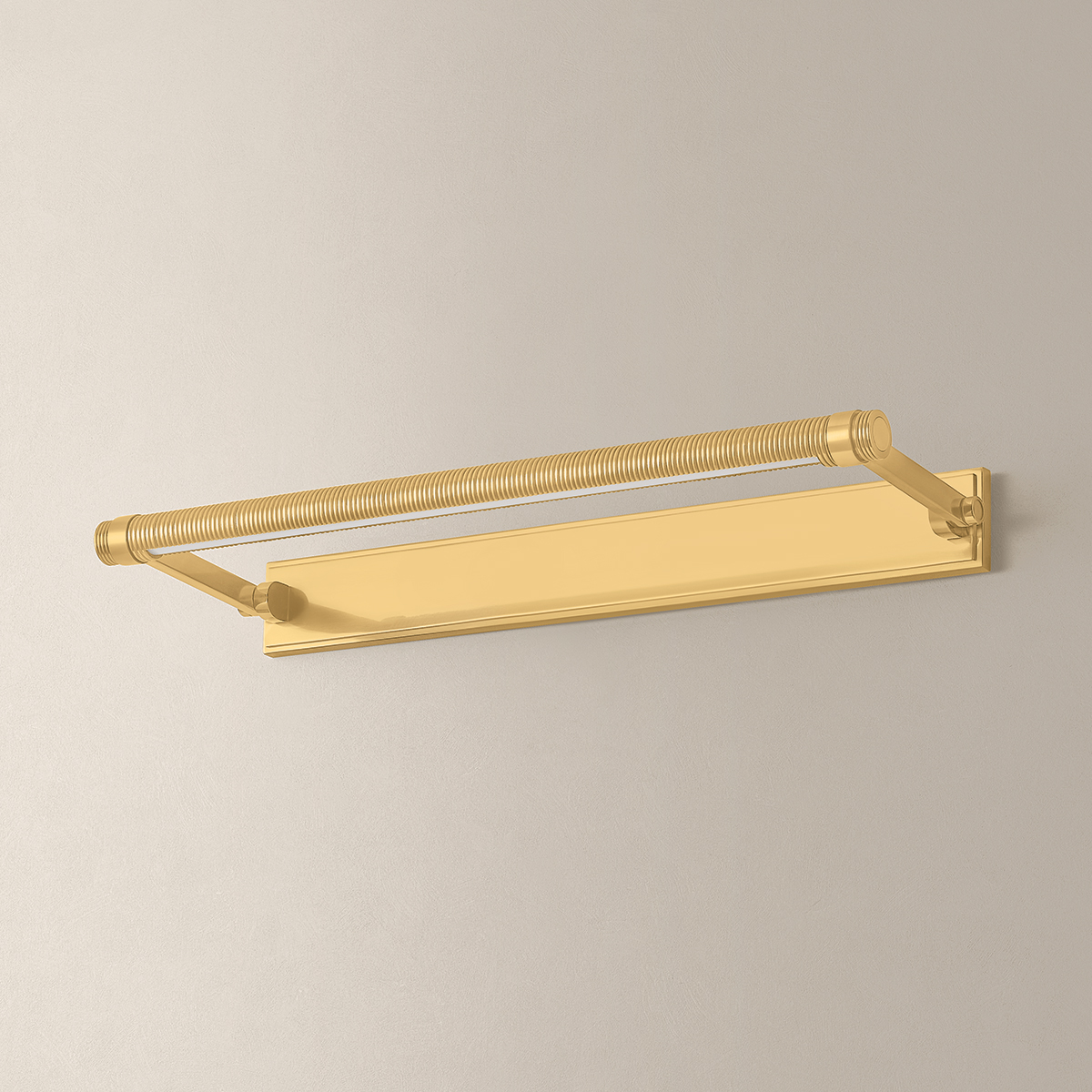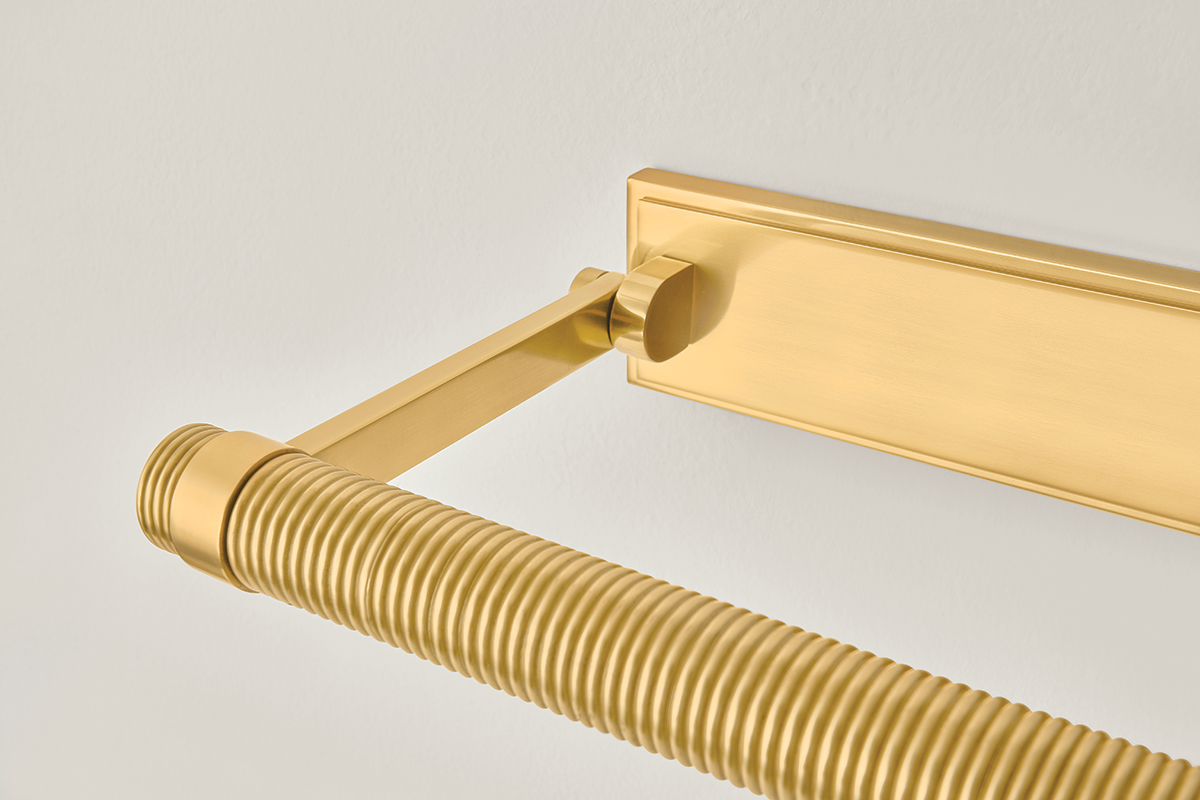 An industrial take on a classic picture light, Duell adds fine knurling to a clean-lined cylindrical shade. While the slender profile and streamlined backplate allow Duell to blend into any space, the oversized brackets and rectangular armbacks introduce architectural interest. Duell is available in three sizes and two finish options: an all-over Aged Brass or Distressed Bronze with Aged Brass accents.