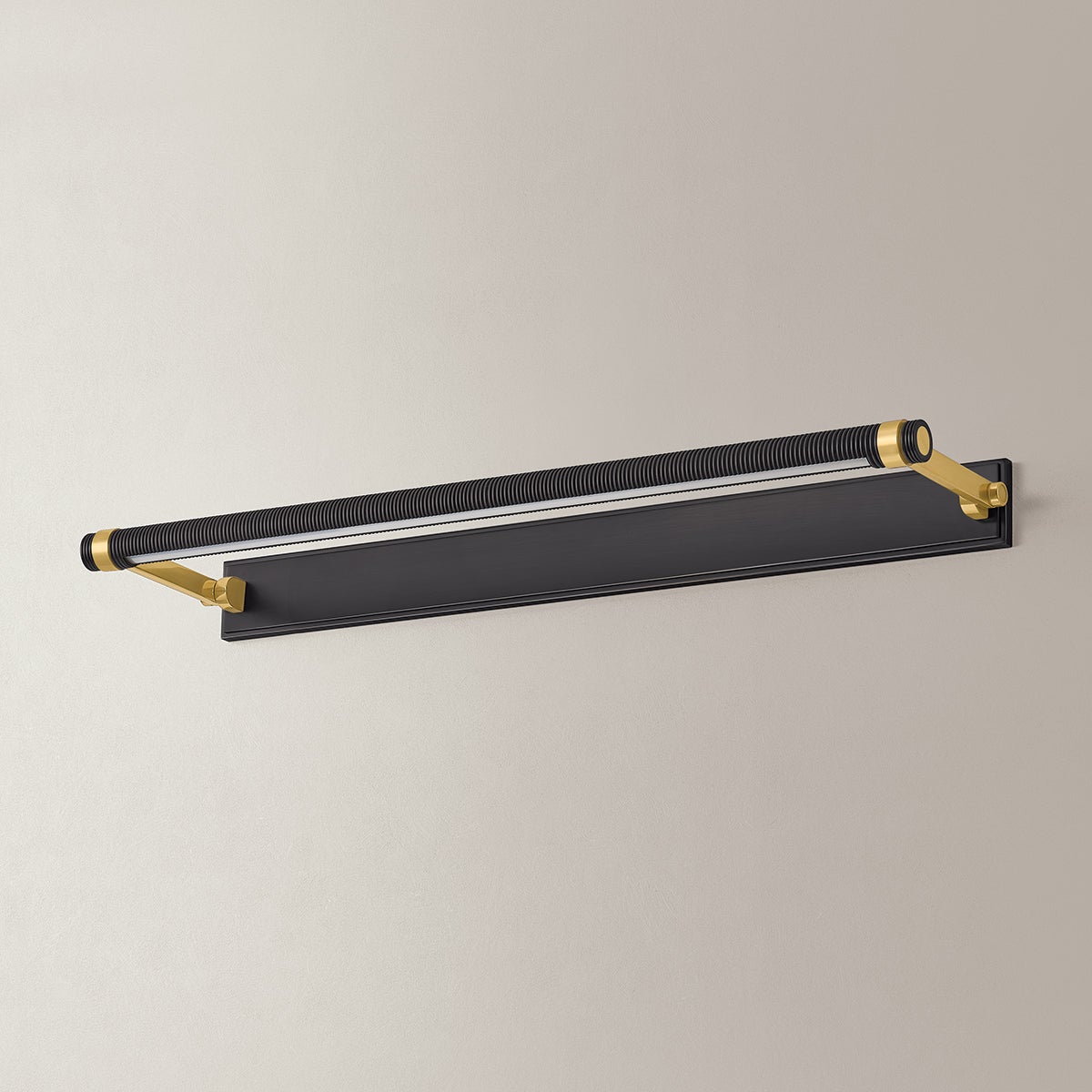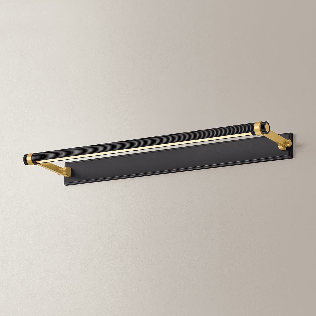 An industrial take on a classic picture light, Duell adds fine knurling to a clean-lined cylindrical shade. While the slender profile and streamlined backplate allow Duell to blend into any space, the oversized brackets and rectangular armbacks introduce architectural interest. Duell is available in three sizes and two finish options: an all-over Aged Brass or Distressed Bronze with Aged Brass accents.