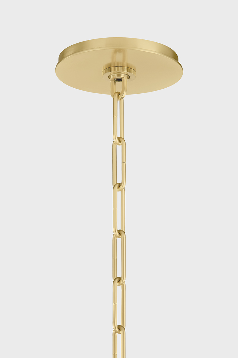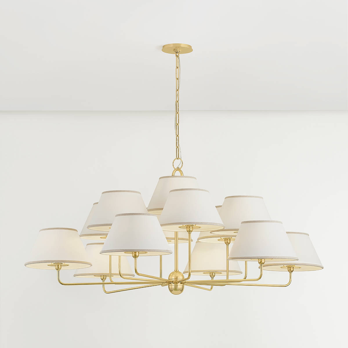 A vintage-inspired silhouette is elevated through thoughtful details in this transitional family. Arranged at varying heights, the overscale white linen tapered shades create a voluminous effect, like a sail billowing in the wind. Ivory trim provides subtle visual interest while remaining fresh and neutral. The frame is finished in Aged Brass with rounded right angles that keep the design feeling soft. Available as a sconce or chandelier in two sizes.