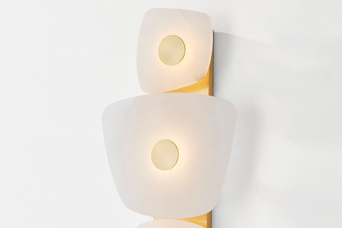 Marrying artistry with innovation, slabs of natural alabaster are illuminated by LED technology in this enchanting fixture. Supported by an Aged Brass framework, each alabaster shape is entirely unique, enhancing the bespoke nature of the composition. As a sconce or semi-flush in two sizes, Holmdel is a treasure of modern design.